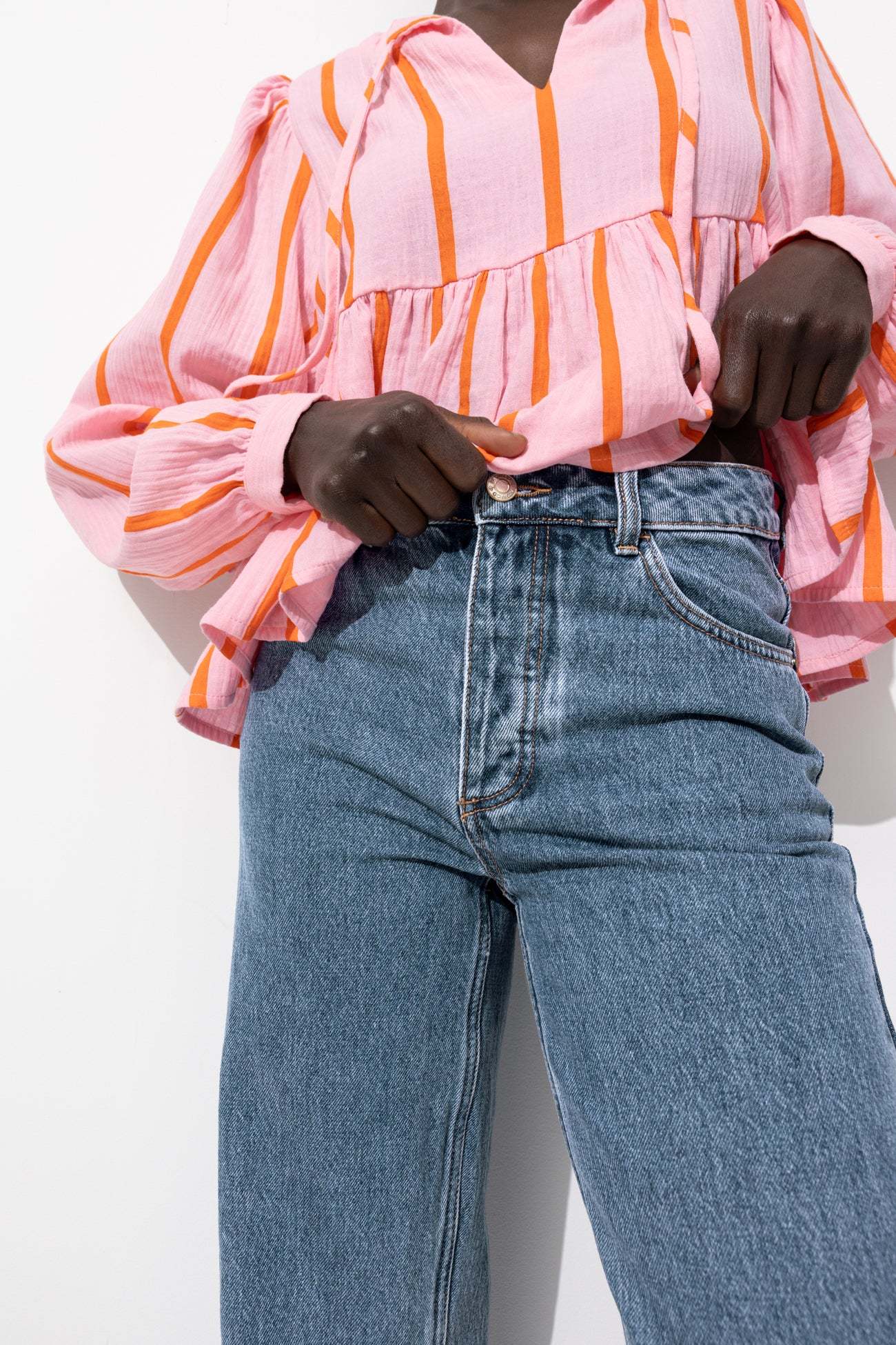 Le jean droit est un must-have, encore plus quand il est taille haute. Il nous suit partout et se prête à tous nos desiderata ! Denim authentique 100% Coton. Coupe droite et longueur standard. Prendre une taille au-dessus pour un look + boyfriend. Passants. Ouverture par bouton clou et zip métal. Rivets métal. 5 poches. Effet délavé et usé par endroit. Ce jean femme contient du coton recyclé.
