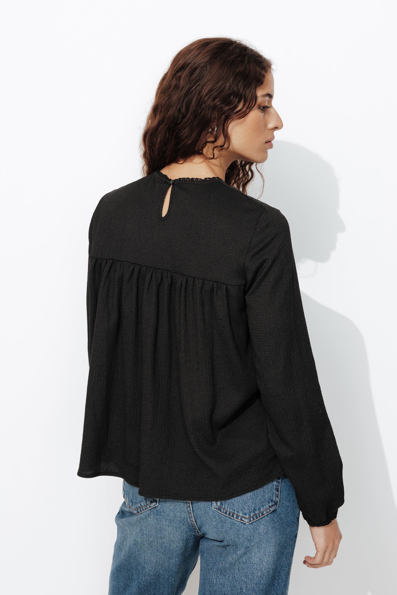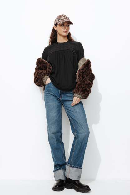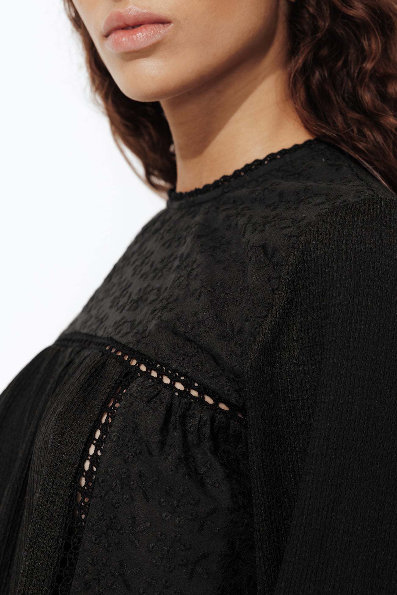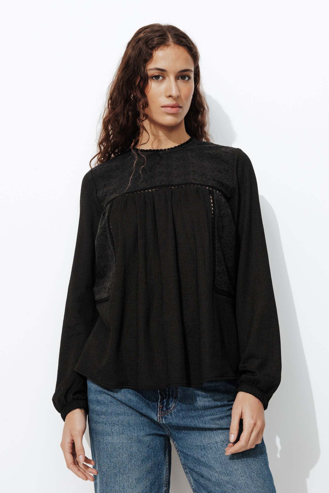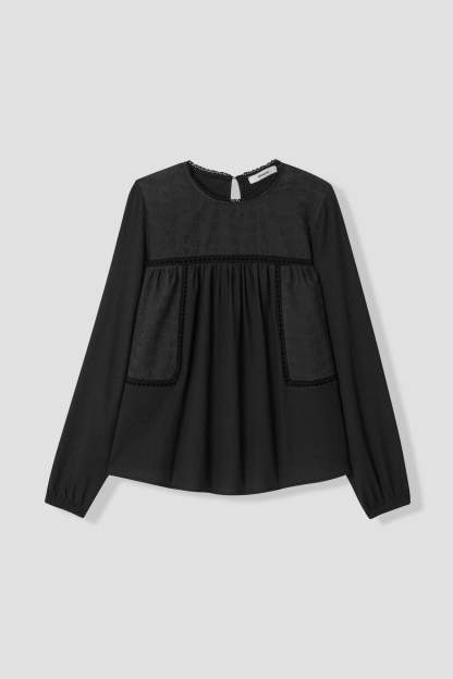 Ici, ce sont les détails qui ont beaucoup d'importance : mix de matières, broderies ton sur ton, ajourés échelle et jeux de fronces twistent en beauté ce top manches longues ! Coupe ample. Encolure arrondie, découpe goutte boutonnée dans la nuque. Manches longues légèrement bouffantes, poignets élastiqués. Base arrondie. Finition piquée ton sur ton. Cette blouse contient des fibres recyclées.