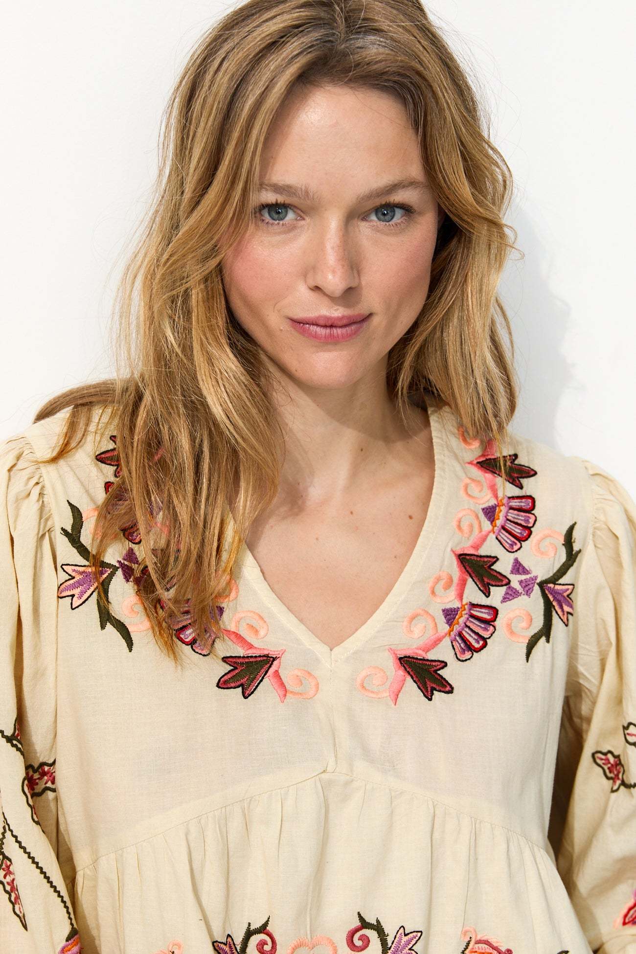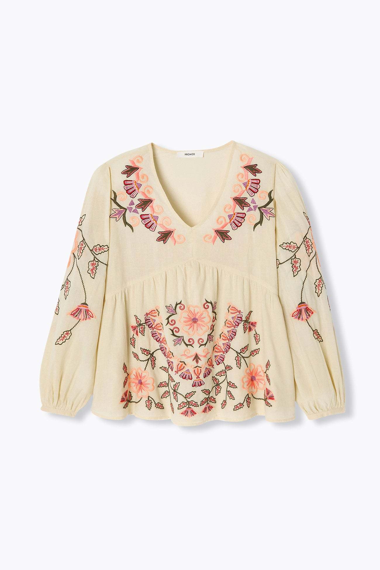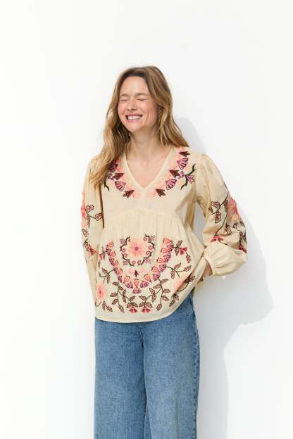 Printemps-été. Focus-mode sur les broderies folk et fleuries de cette blouse en cotonnade doublée. Elle est douce, légère, ample pour une belle liberté de mouvement ! Col V. Découpes froncées sous poitrine. Manches longues bouffantes, poignets boutonnés. Contient du coton issu de l'agriculture biologique, cultivé sans pesticides, ni engrais chimiques, ni OGM afin de préserver la biodiversité.