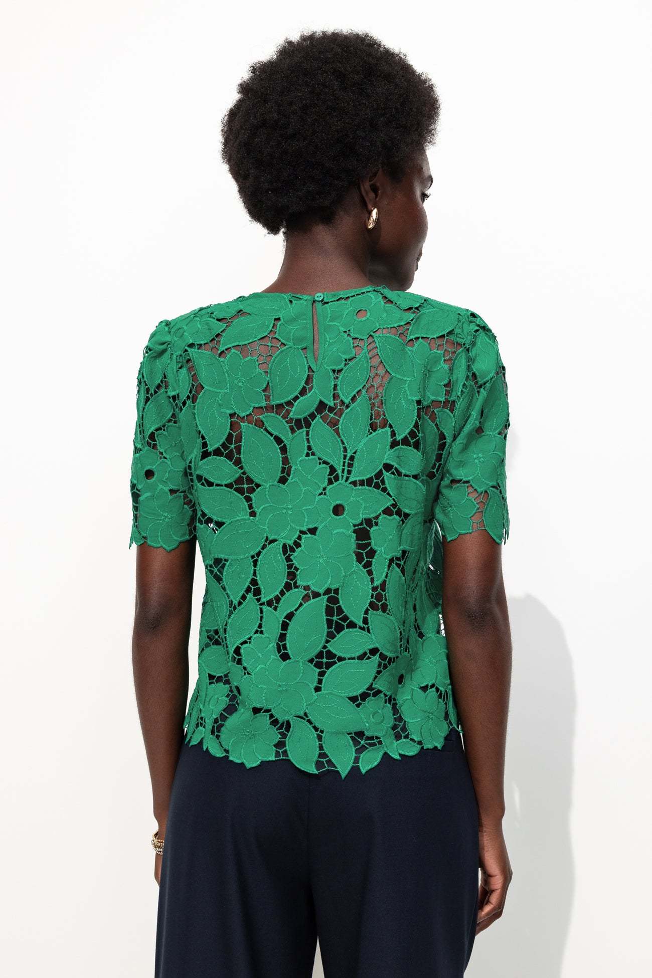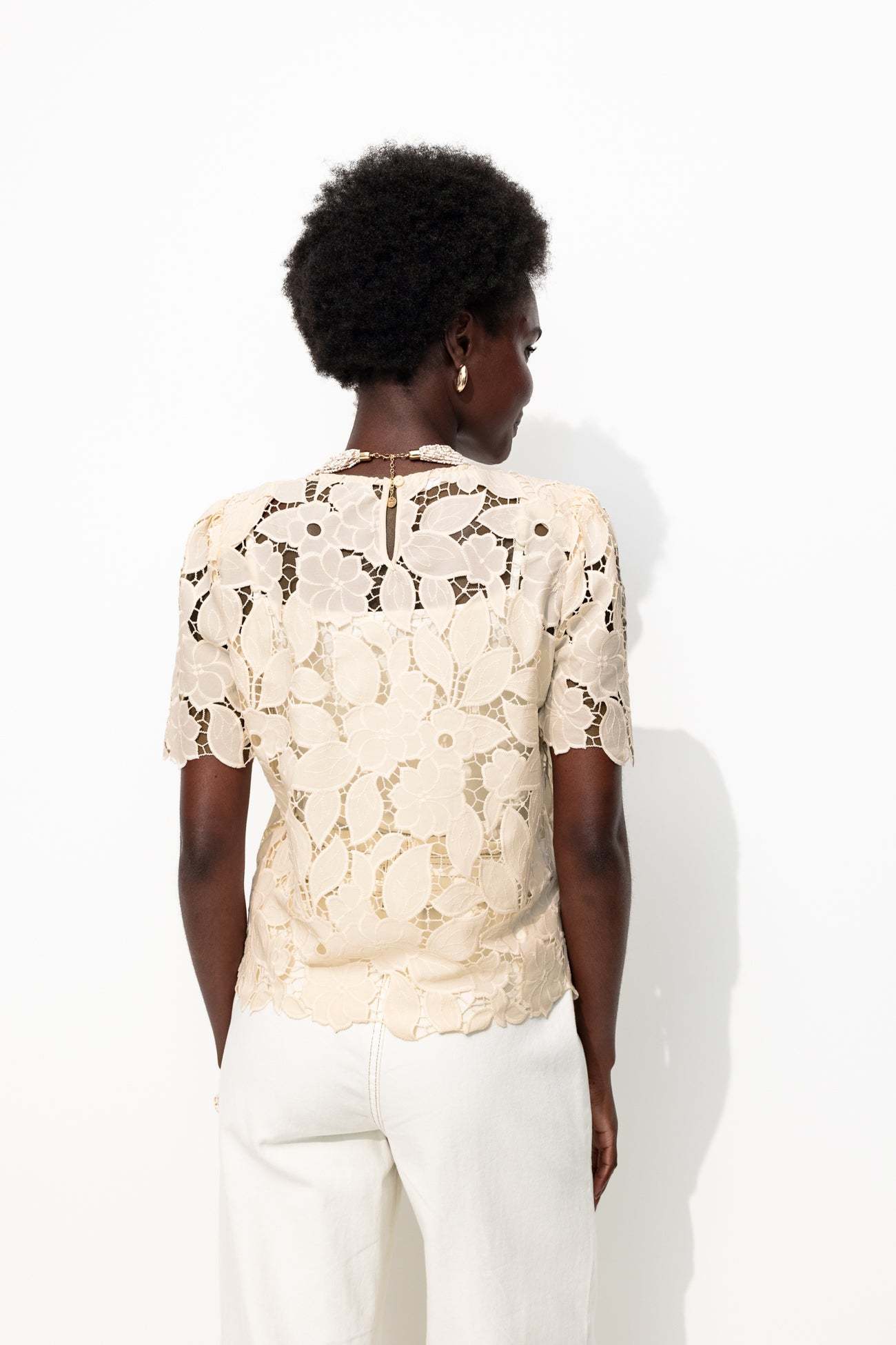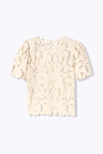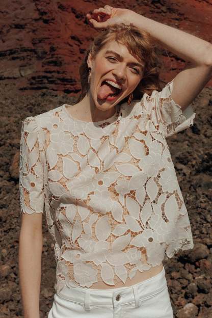 La transparence : c'est vous qui décidez comme la doser ! Avec un top à fines bretelles dessous (vendu séparément) ou juste une belle lingerie fine (vendue séparément). Cette blouse brodée et ajourée est structurée par des épaulettes en mousse. Coupe droite. Col rond, découpe goutte boutonnée dos. Manches courtes et base festonnées. Coutures ton sur ton.