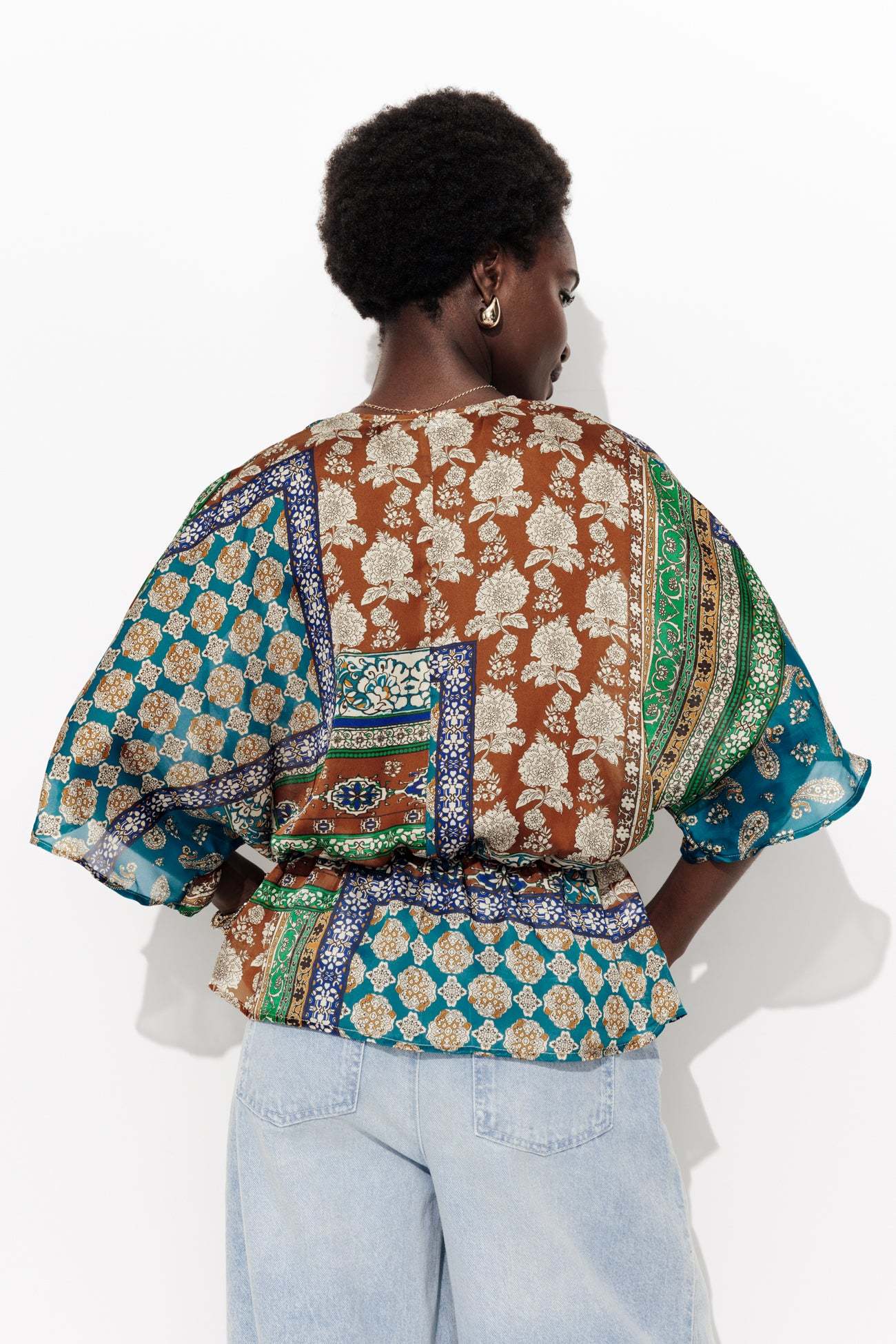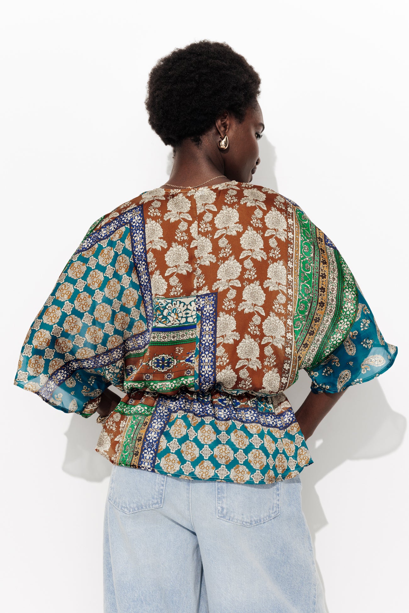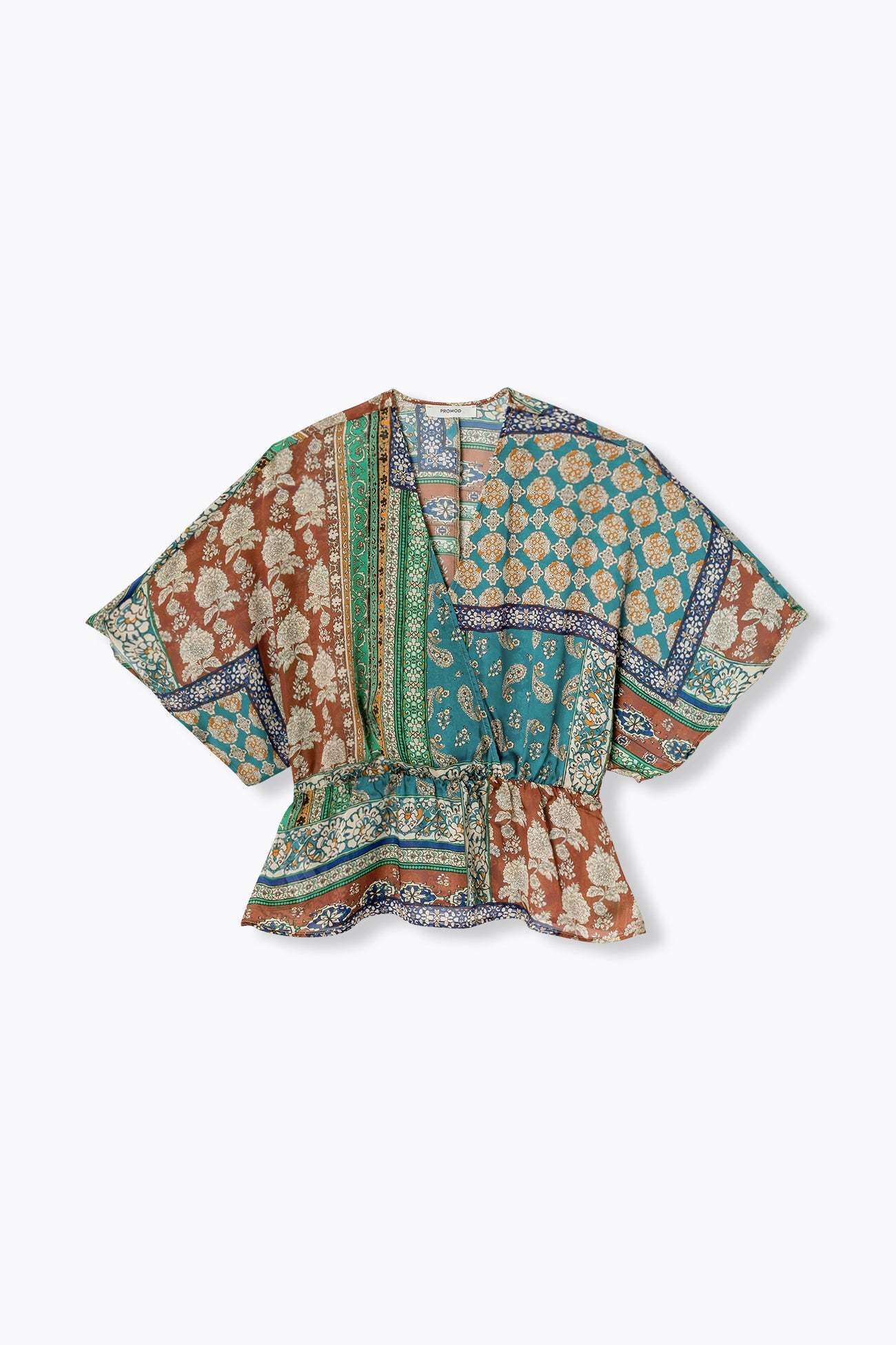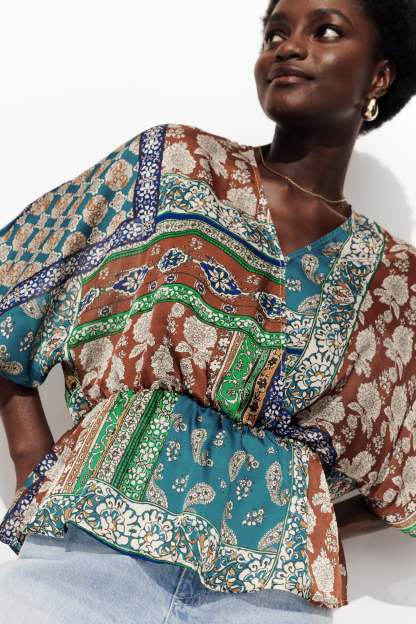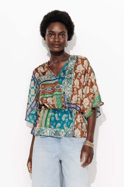 Toucher soyeux & imprimé foulard. Cette blouse en mousseline se pose avec douceur et délicatesse à même la peau. On met en exergue son imprimé très présent en la mixant à un bas uni : un pantalon fluide, un jean brut, unDécolleté V croisé. Manches kimono longueur coude. Taille élastiquée. Basque volantée. Ce top femme est composé à 100% en fibres recyclées.