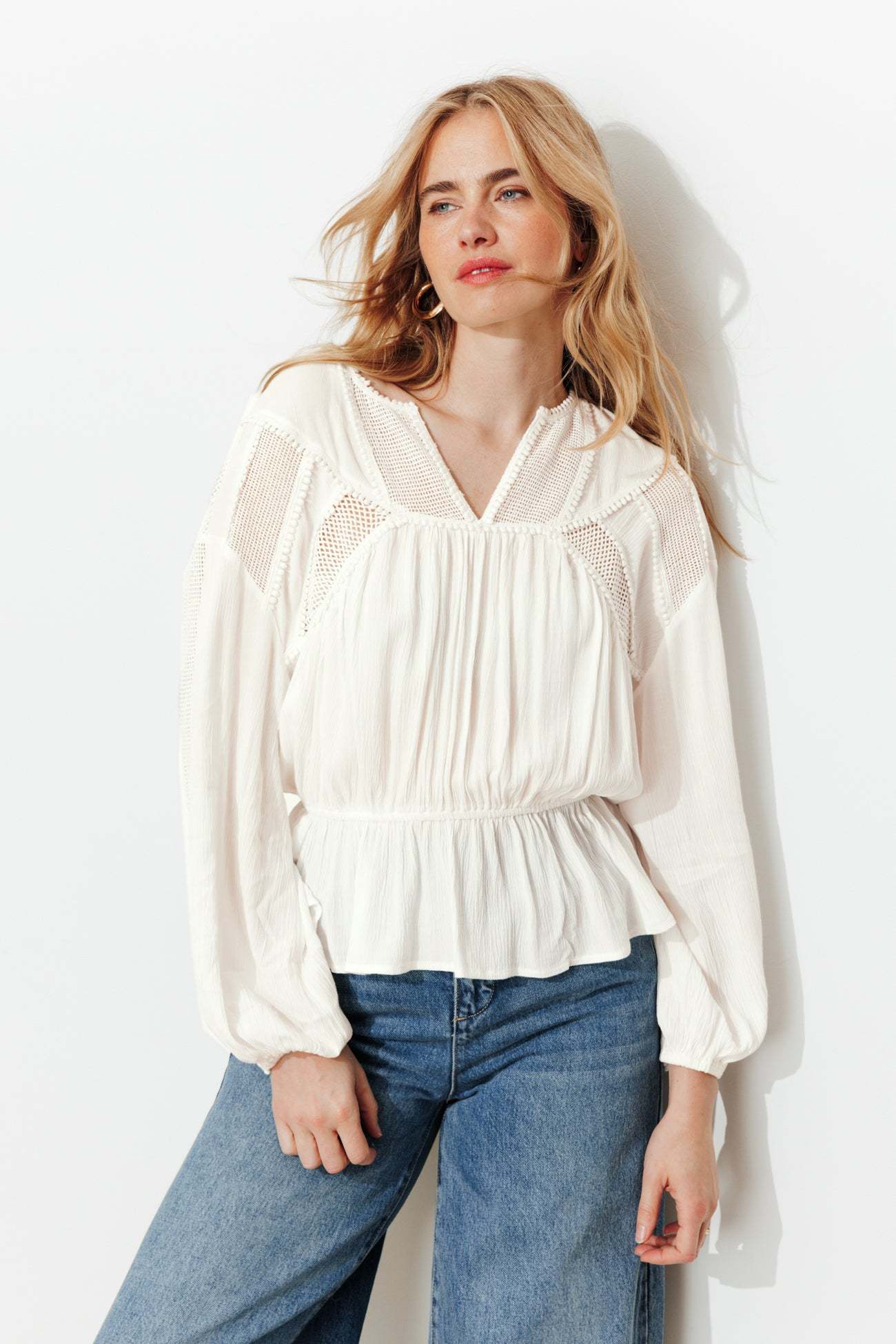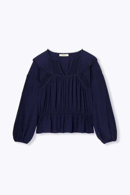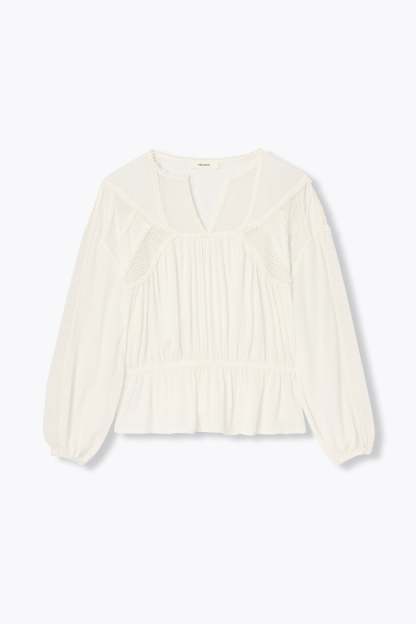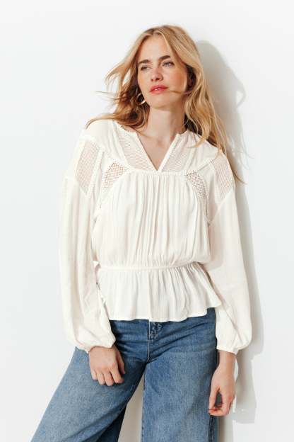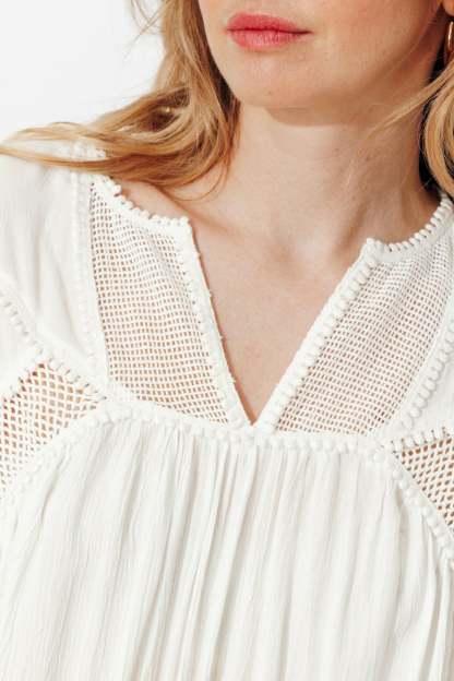 Le crush ! La blouse, avec ses ajours en crochet et ses galons pompons, nous ravit. A mixer avec du denim pour contrebalancer l'esprit rétro. A twister avec des bijoux parce que c'est toujours mieux ! Tissu doux et crêpé. Col tunisien. Emmanchures descendues. Manches longues et bouffantes, poignets élastiqués. Taille élastiquée. 100% viscose issue de pulpe de bois provenant de forêts gérées.