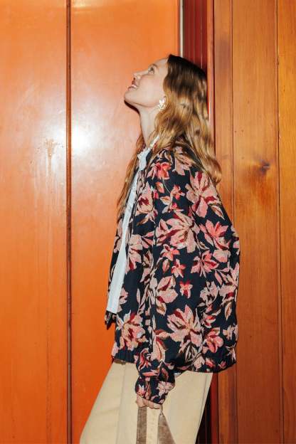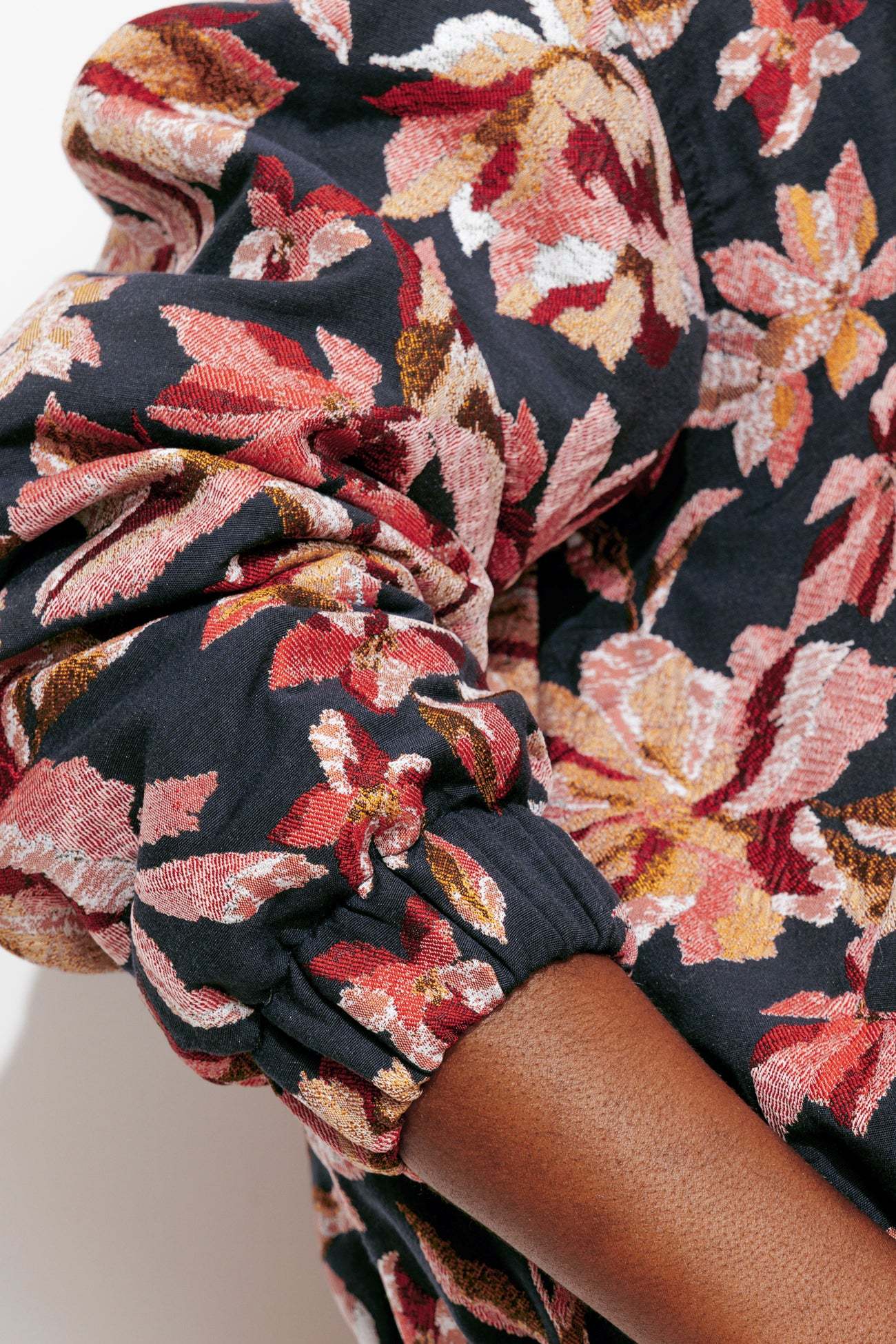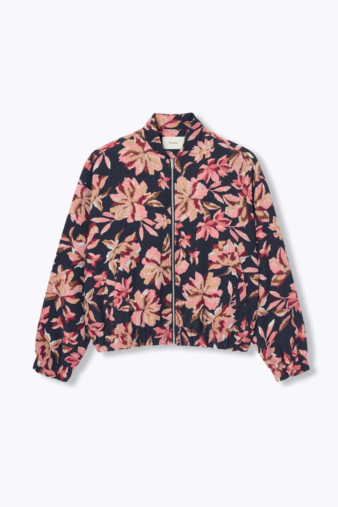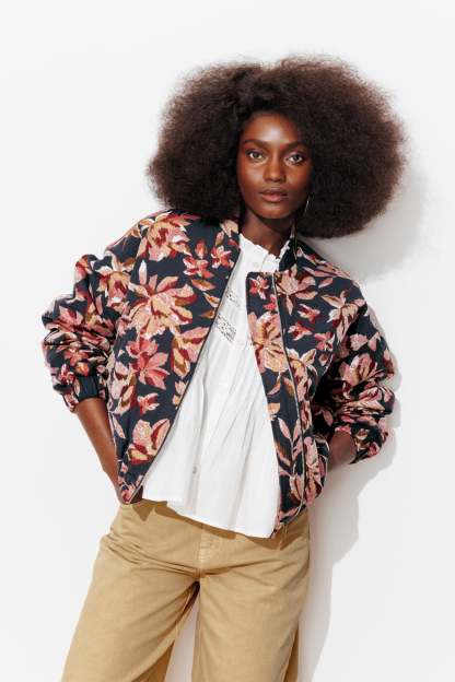 Oversize. Romantique. Original. Ce blouson bomber affiche de grandes fleurs en jacquard all over. Cette pièce forte prend le pouvoir dans les looks de la saison. On calme le jeu avec des looks monochromes. Col rond. Ouverture zippée. 2 poches. Emmanchures descendues. Manches longues bouffantes, poignets élastiqués. Base droite élastiquée. Doublure. Ce blouson femme contient des fibres recyclées.