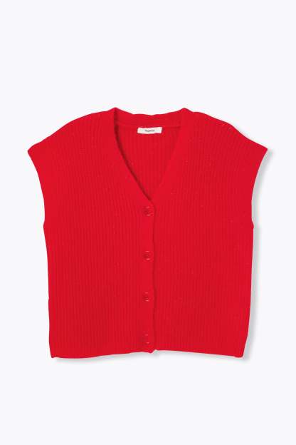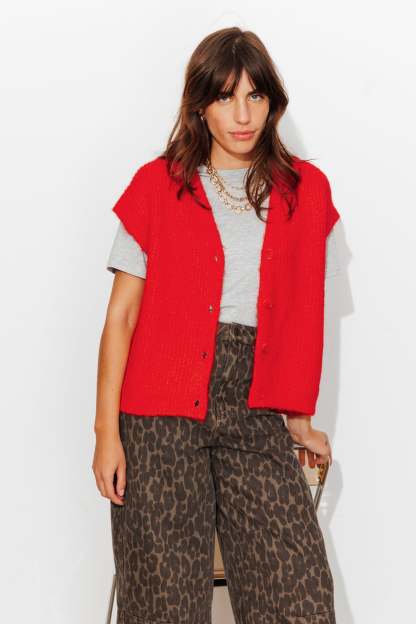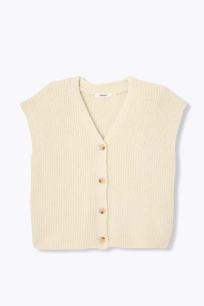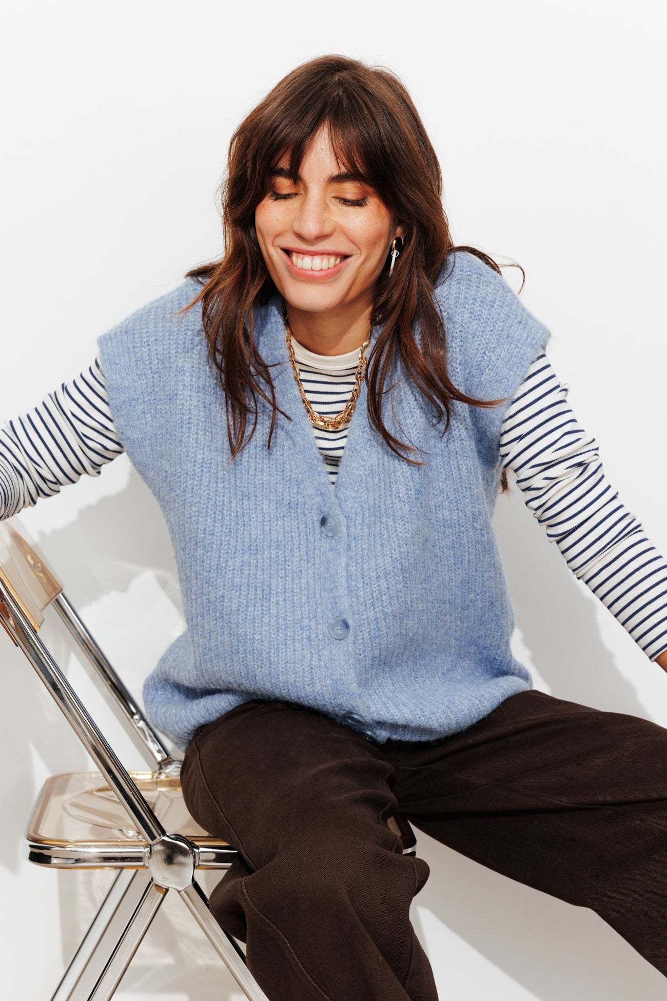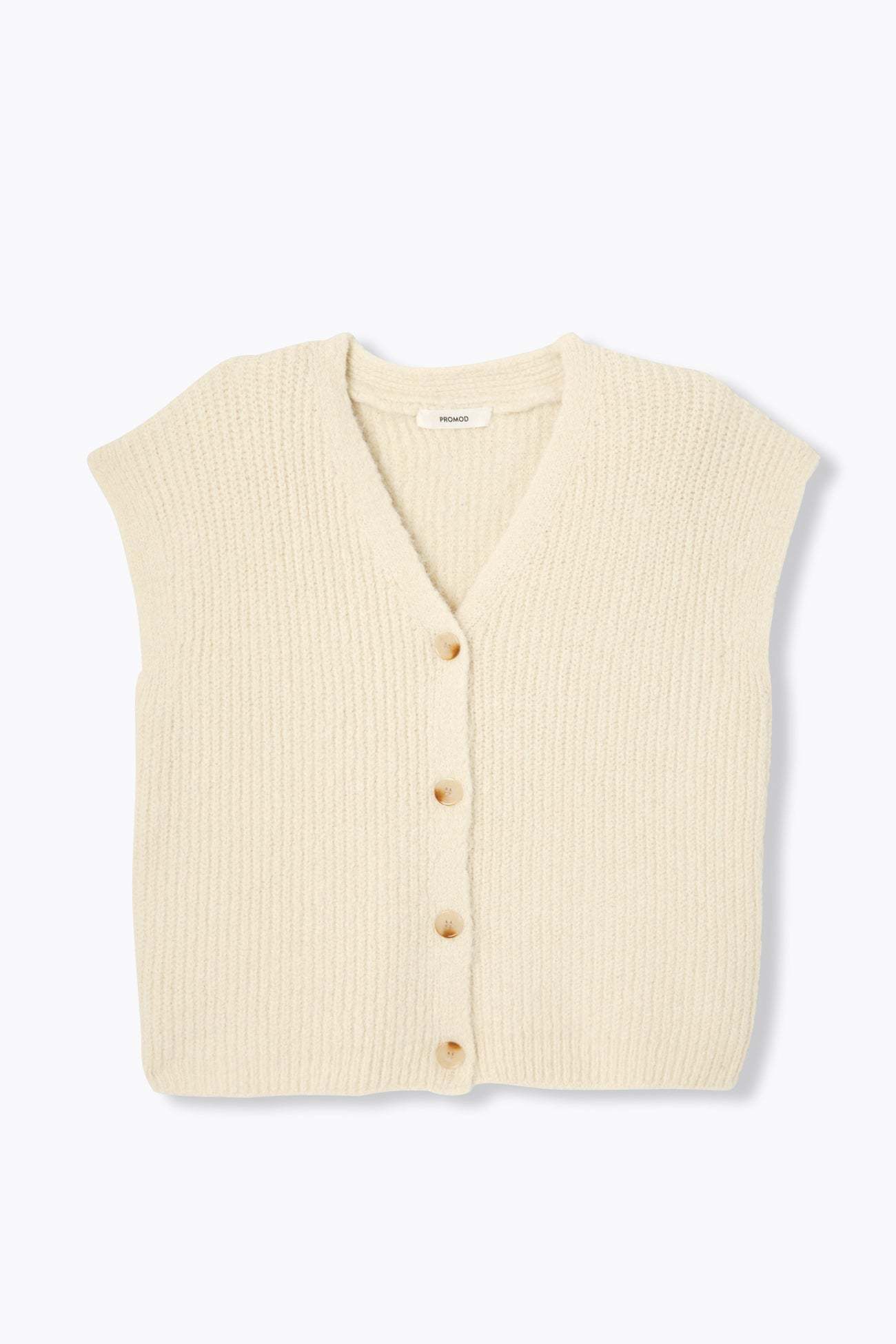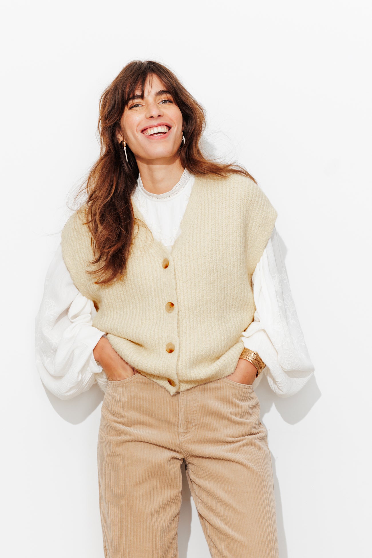 On a tout intérêt à se faire du bien, à avoir chaud et ajouter une dose de cocoon dans nos journées automne-hiver... c'est bon pour tout : le style & le moral ! Démonstration avec ce cardigan sans manches super moelleux ! Maille côtelée et fluffy enrichie en laine. Coupe oversize. Col V. Ouverture boutonnée. Emmanchures américaines. Base droite. Ce gilet femme contient des fibres recyclées.