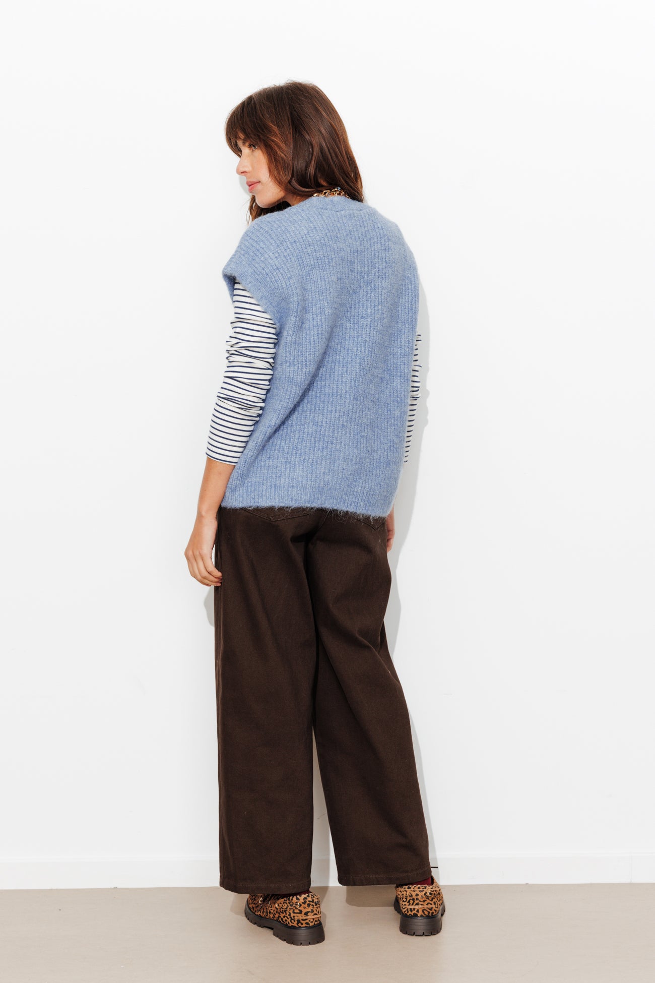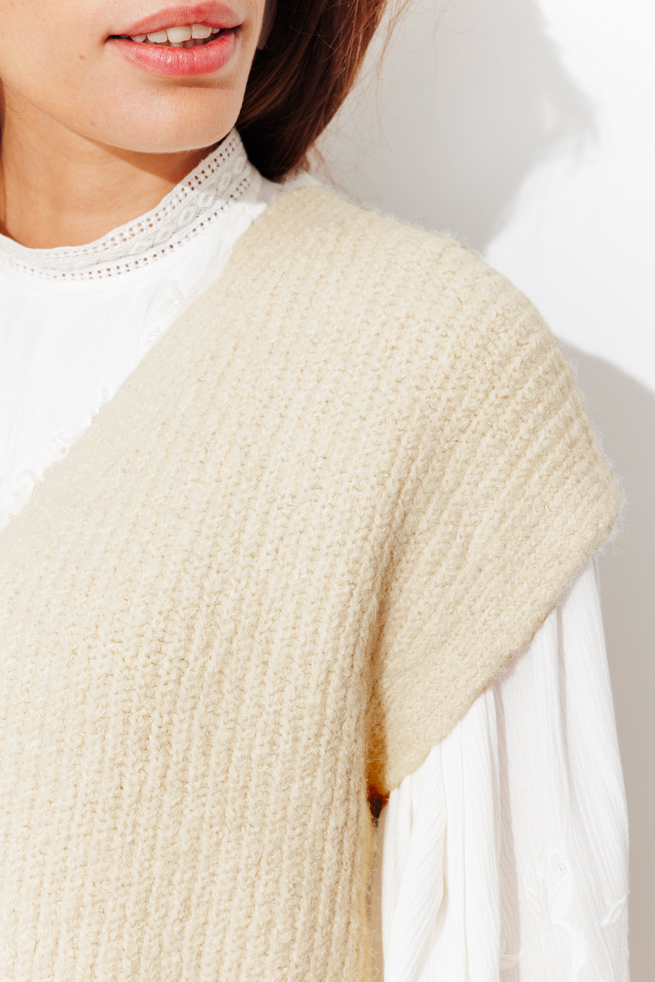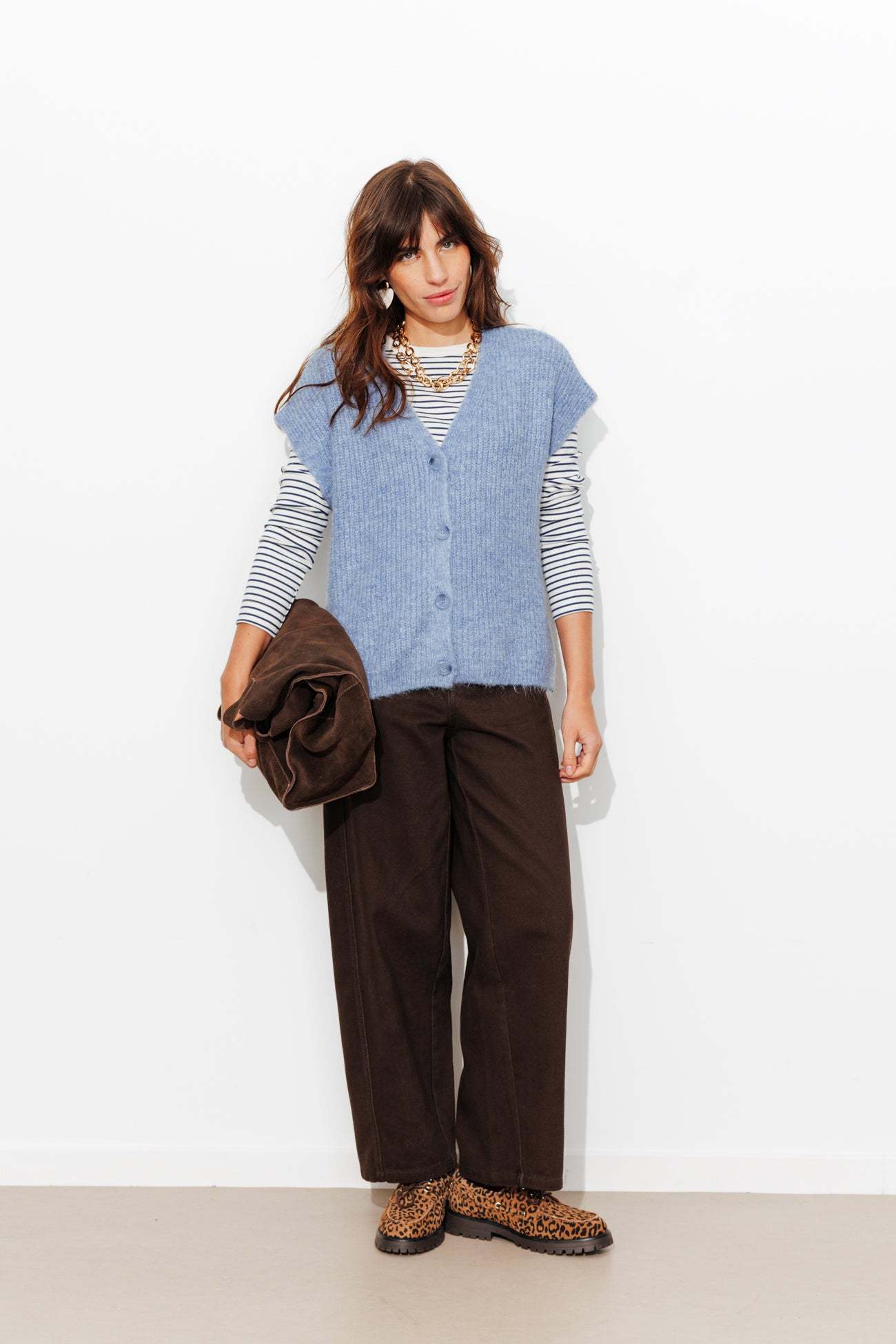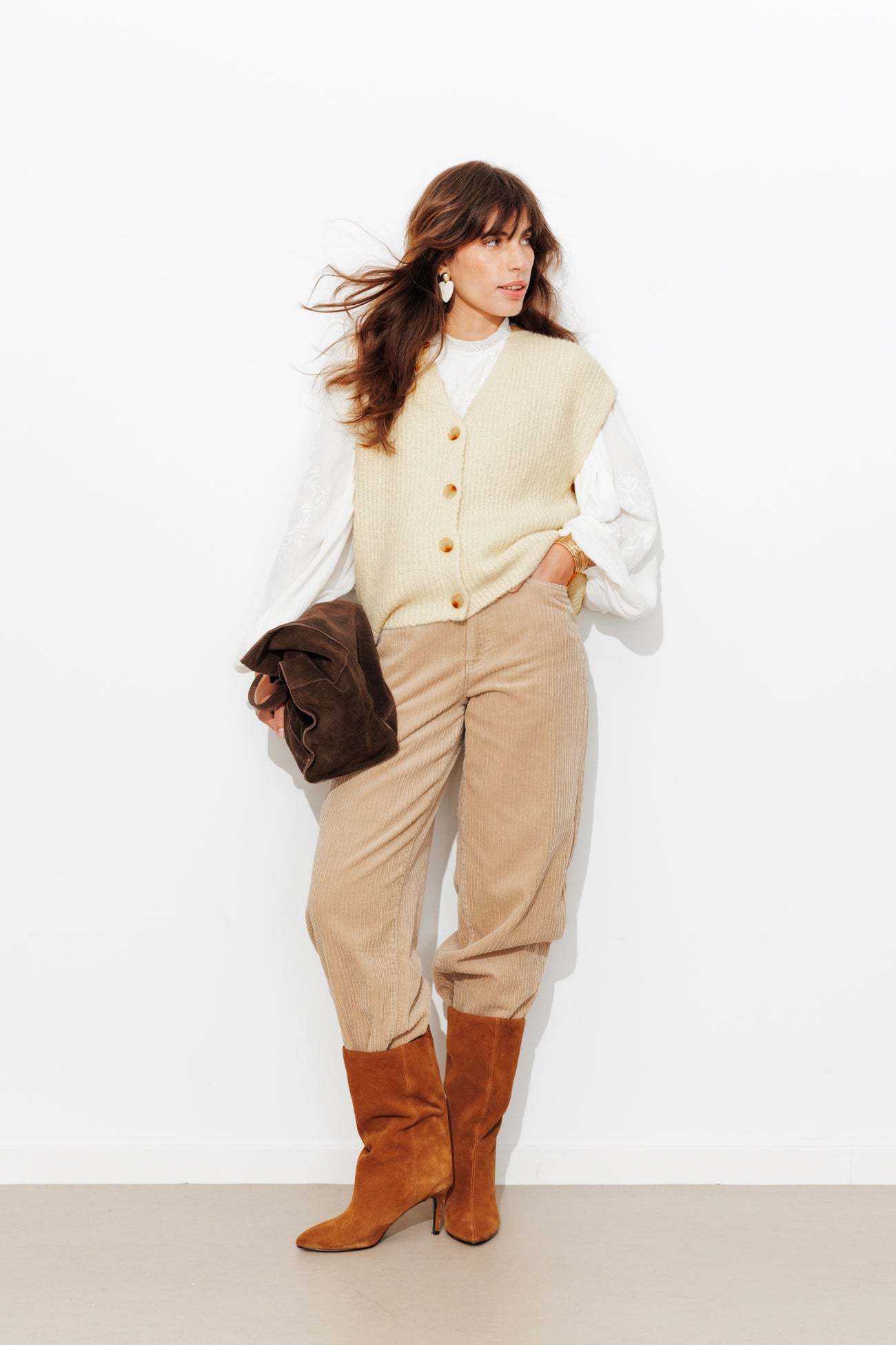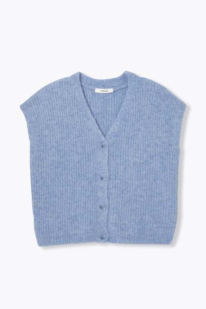 On a tout intérêt à se faire du bien, à avoir chaud et ajouter une dose de cocoon dans nos journées automne-hiver... c'est bon pour tout : le style & le moral ! Démonstration avec ce cardigan sans manches super moelleux ! Maille côtelée et fluffy enrichie en laine. Coupe oversize. Col V. Ouverture boutonnée. Emmanchures américaines. Base droite. Ce gilet femme contient des fibres recyclées.