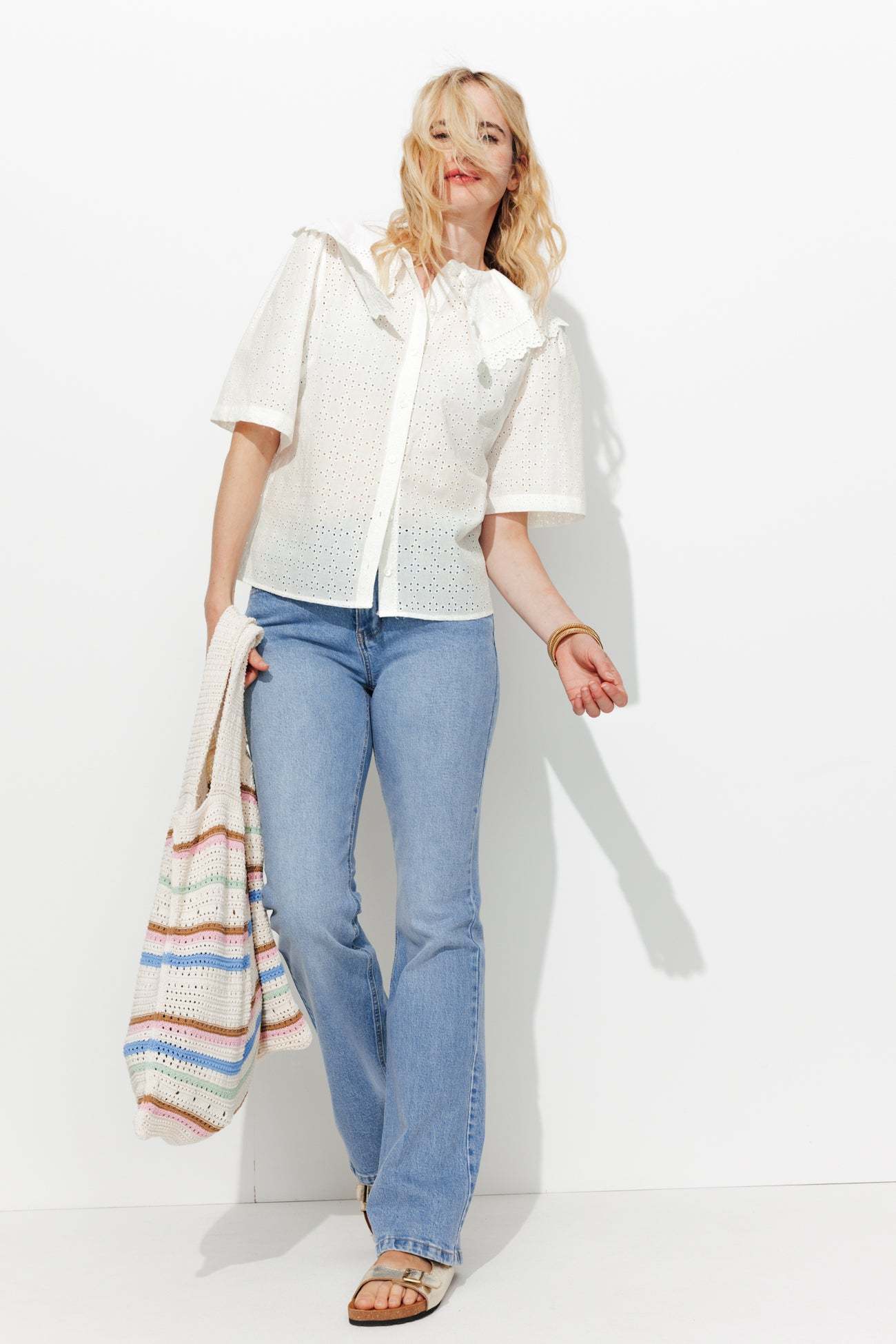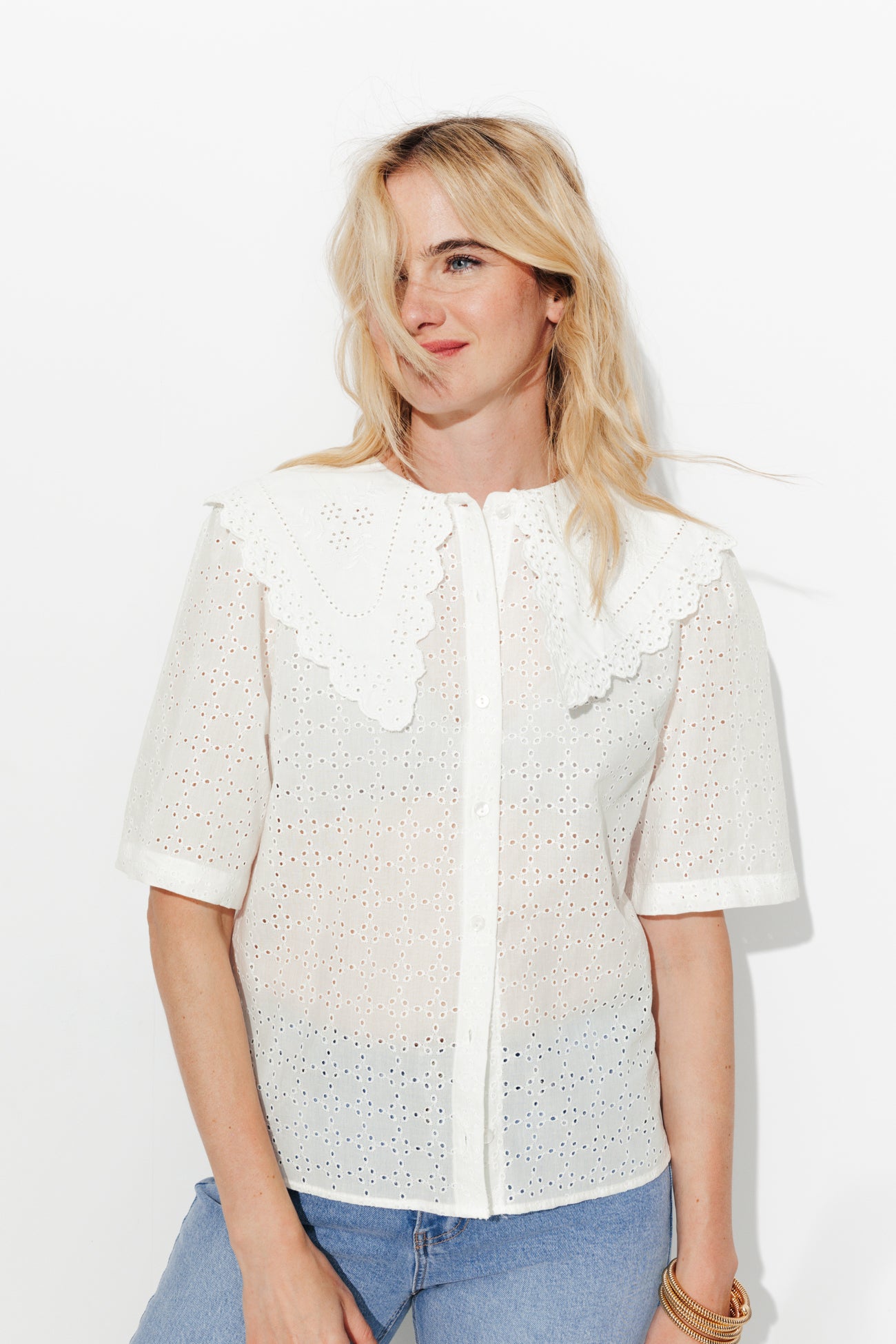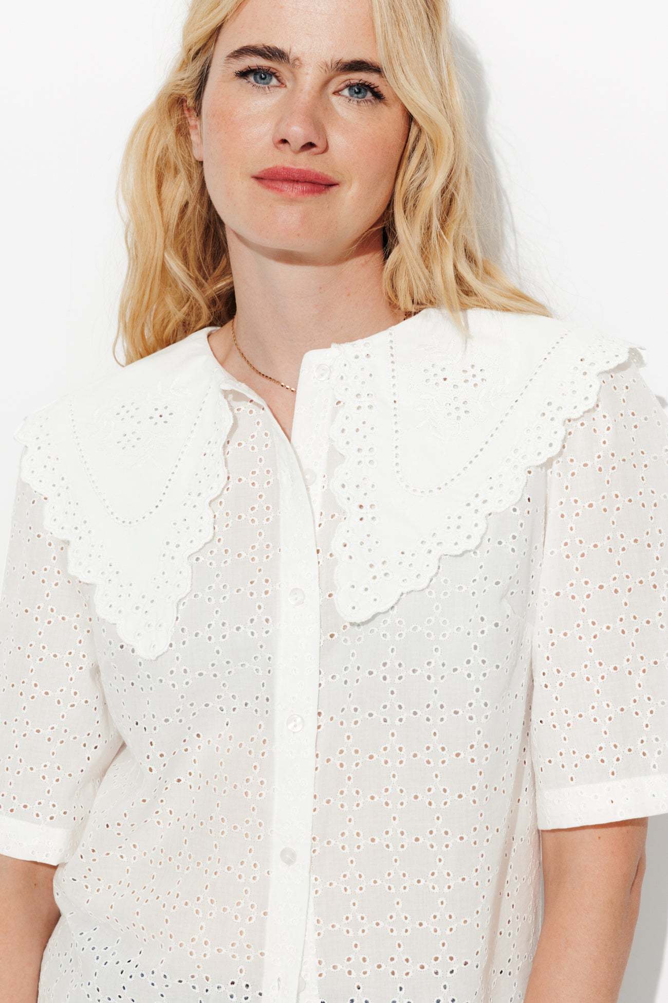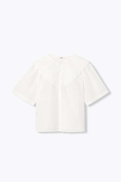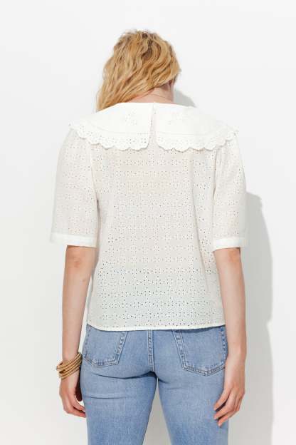 Broderie anglaise, col à revers Peter Pan et boutons nacrés.... il flotte comme un air British & romantique sur la les looks de la saison ! On ajoute du jean délavé à l'allure pour casser les codes. On pense aux bijoux pour une note finale parfaite. Cotonnade, ajours brodés. Coupe droite. Col devant et dos. Ouverture boutonnée. Pinces poitrine. Manches courtes. Base droite. Finition piquée.