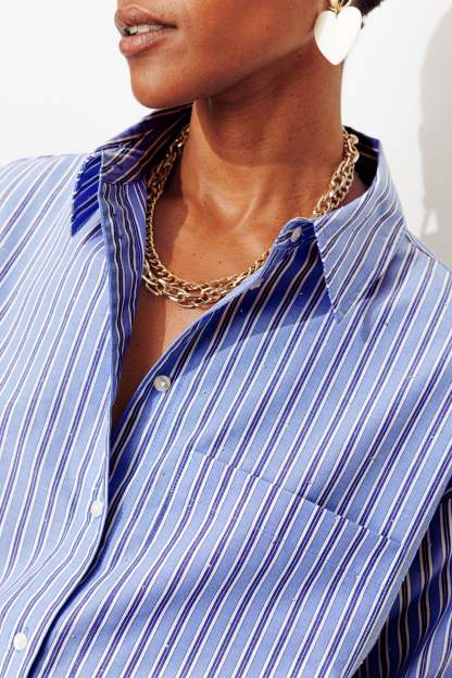 La chemise rayée, boyish et oversize s'offre un grain de fantaisie grâce des mini-strass. Popeline de coton mélangé. Rayures en fils teints. Col chemise. Ouverture boutonnée. Emmanchures descendues. Manches longues, poignets boutonnés. 1 poche poitrine. Plis d'aisance dos. Base arrondie. Contient du coton issu de l'agriculture biologique, cultivé sans pesticides, ni engrais chimiques, ni OGM.