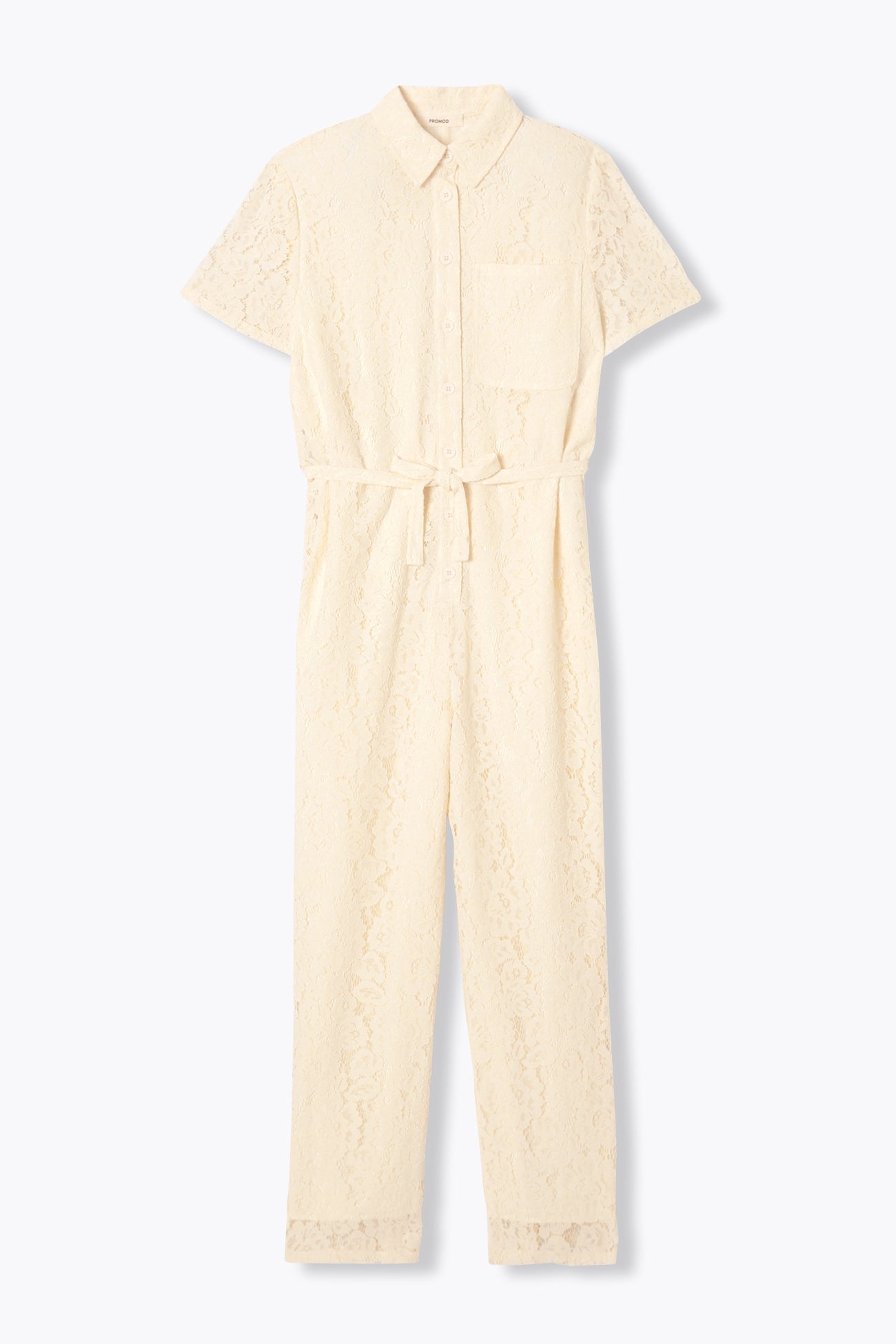 Cette combinaison-pantalon en full dentelle a un pouvoir quasi-magique : elle nous dessine une allure chic, élancée, stylée ! On la twiste avec de beaux bijoux. On l'upgrade encore plus avec un sac en cuir. On la fait danser avec des talons. Col chemise. Ouverture boutonnée devant. 1 poche poitrine. Manches courtes. Passants. Ceinture en dentelle à nouer. Combi entièrement doublée. Cette combinaison-pantalon femme contient des fibres recyclées.