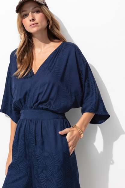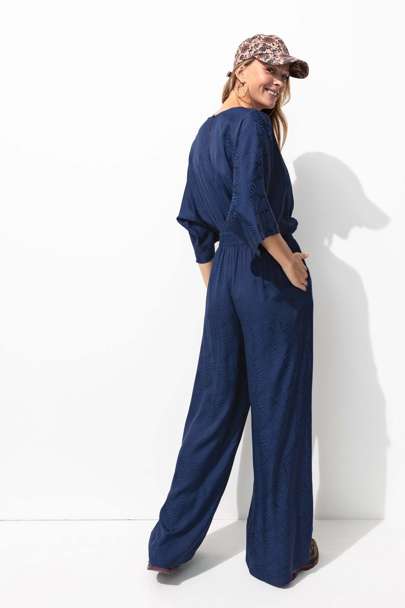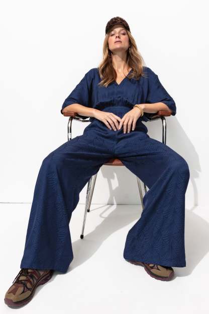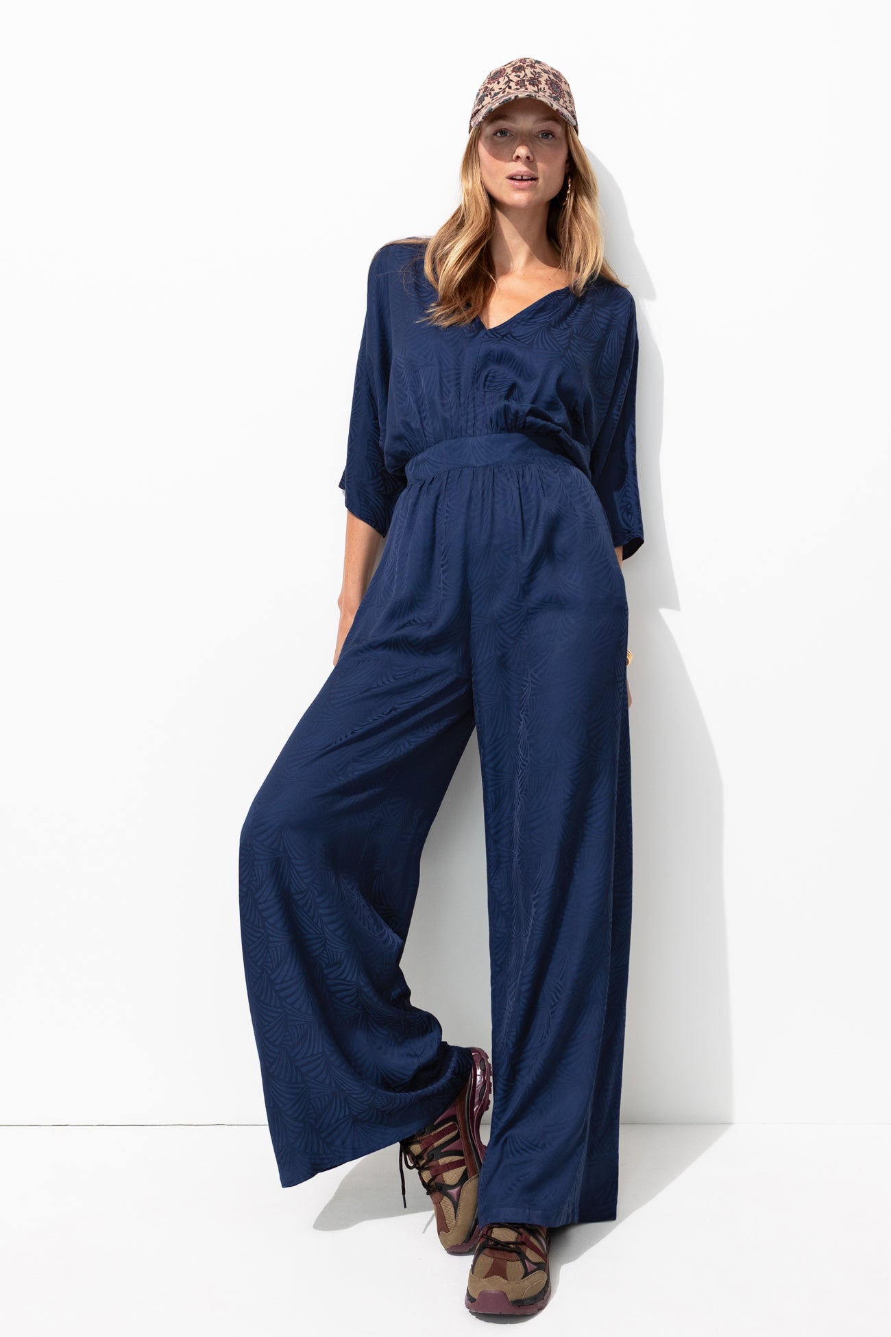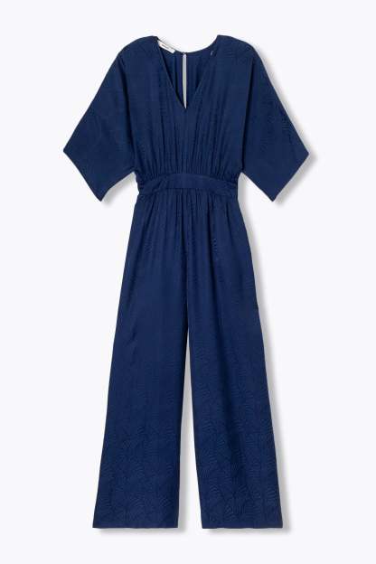 L'agenda annonce des instants chics : une fête, une cérémonie, une garden party : avec cette combinaison-pantalon en satin, vous allez faire sensation ! Focus sur ses motifs façonnés : ça capte bien la lumière. Décolleté V, fente boutonnée dos. Manches coude. Taille élastiquée dos. Jambes larges et longues. 2 poches cachées. Contient de la viscose issue de pulpe de bois provenant de forêts gérées.