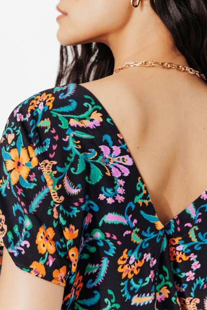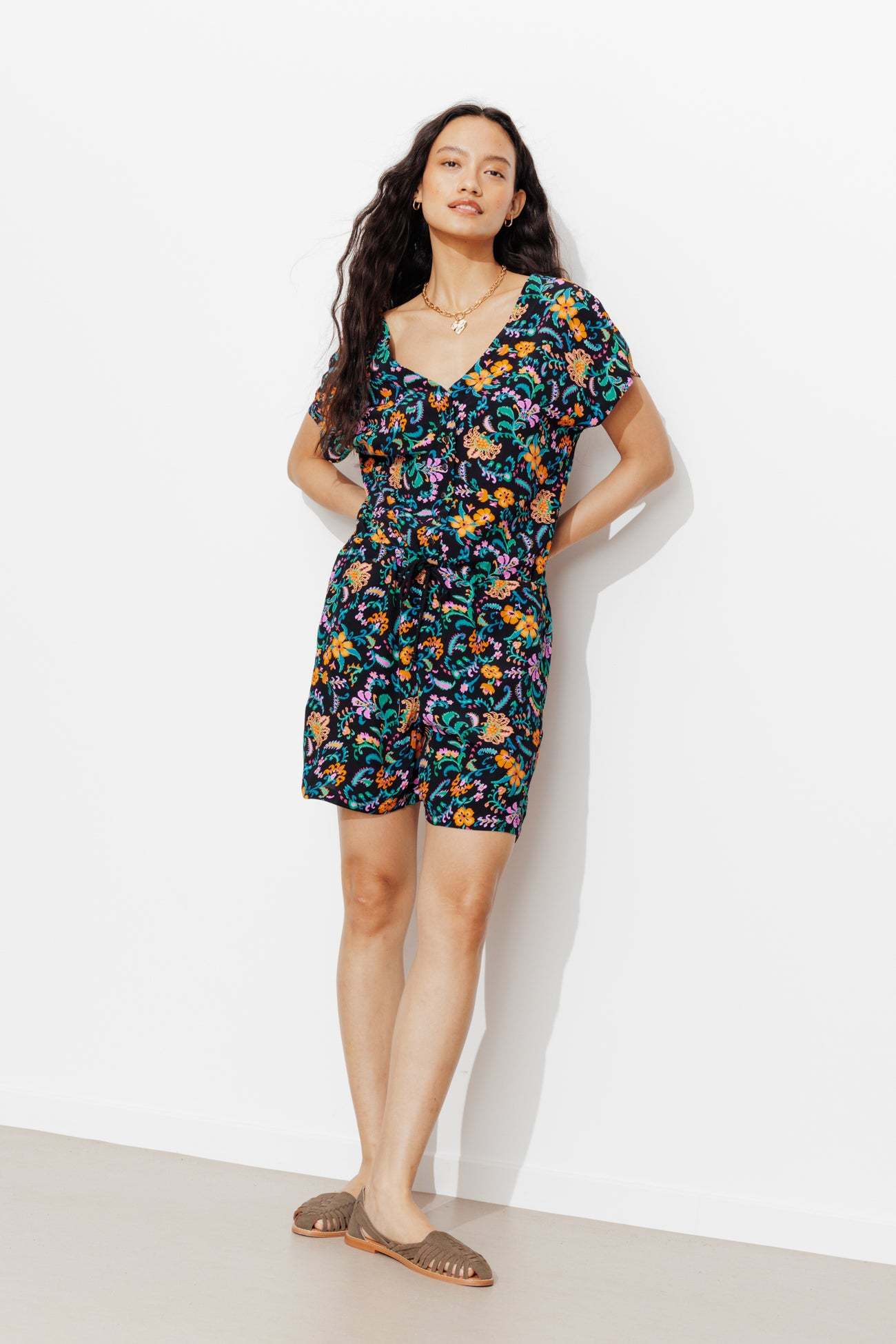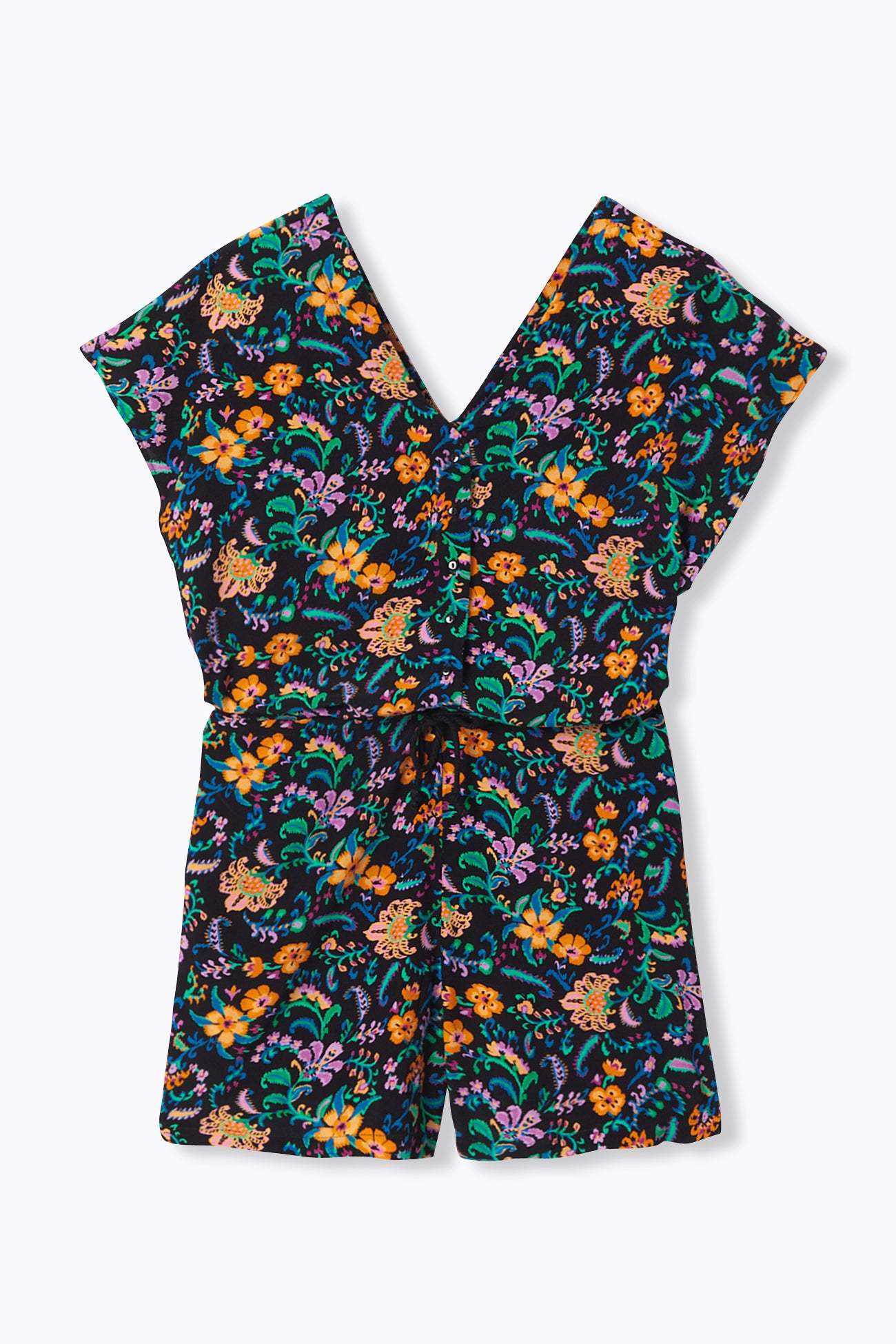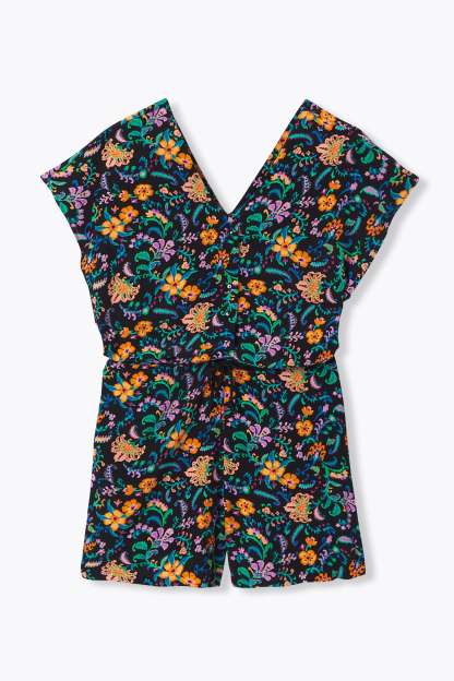 Il suffit d'un rayon de soleil pour qu'il fasse son apparition dans notre paysage, urbain ou nature ! Ce combishort imprimé apporte beaucoup de joie dans vos vies avec son imprimé très coloré ! Tissu crêpé. Décolleté V plongeant devant et dos. Ouverture boutonnée devant, enfilage facile. Manches courtes. Taille avec cordon coulissant à nouer. 2 poches. Ce combishort contient de la viscose issue de pulpe de bois provenant de forêts gérées.