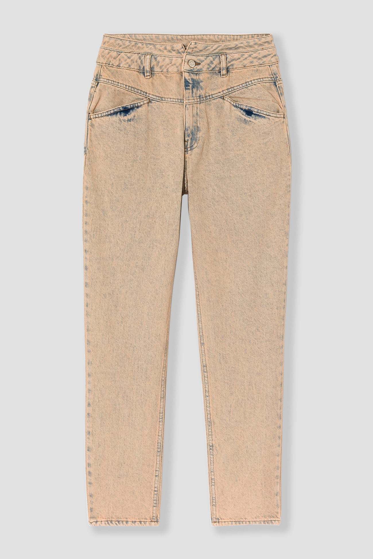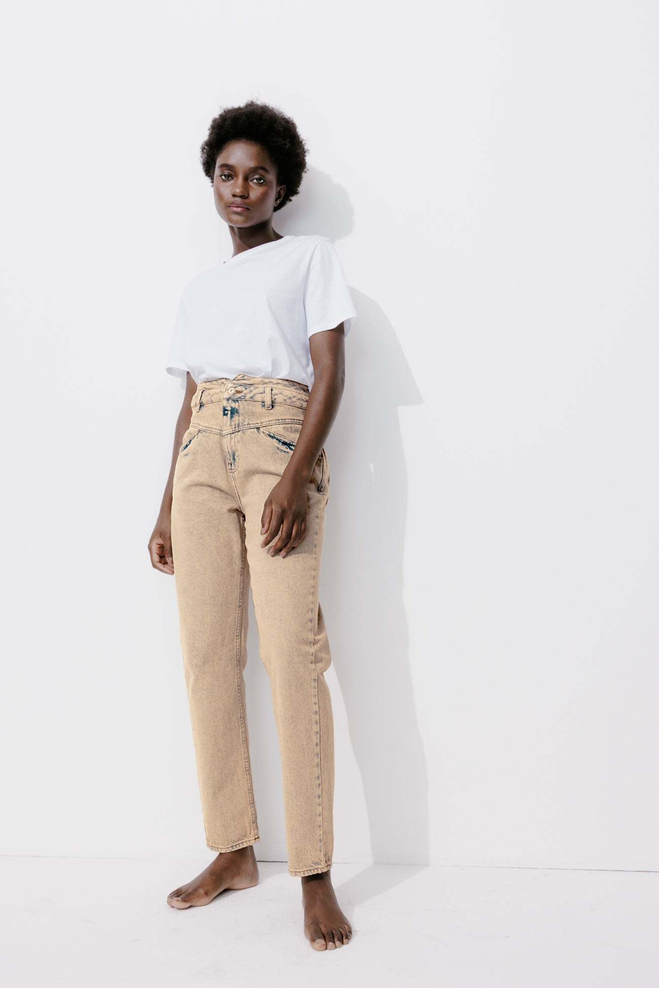Taille haute. Style. Confort. Le jean mom taille haute crée la surprise avec un effet teinté ! MARCEL souligne la taille avec ses empiècements en V devant. On l'aime avec un simple t-shirt, une blouse imprimée, un sweat, un crop top... Denim 100% Coton épais et souple. Ouverture par bouton clou et zip métal. Passants. 4 poches. Rivets métal. Ce jean femme contient du coton recyclé.