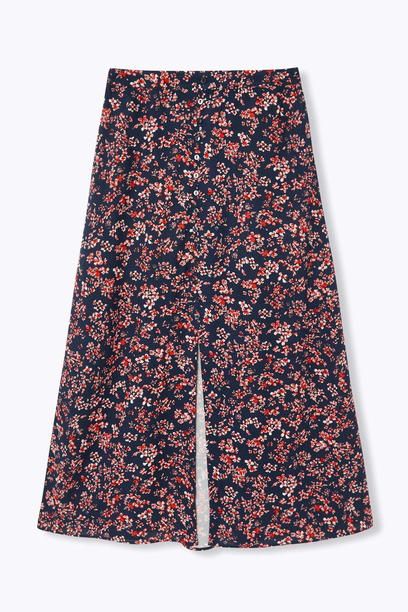 Question du moment : comment se donner une vive allure, quel que soit le moment choisi ? Réponse avec cette jupe longue et fluide. La fente devant accentue le mouvement. Le faux boutonnage rappelle les 50's. A porter en boots, des sandales, des sabots ou des nu-pieds ! Coupe évasée. Taille en forme devant et élastiquée dans le dos. 100% viscose issue de pulpe de bois provenant de forêts gérées.