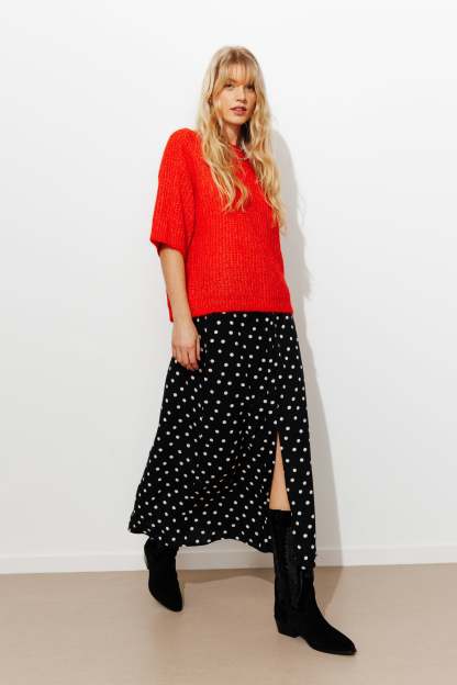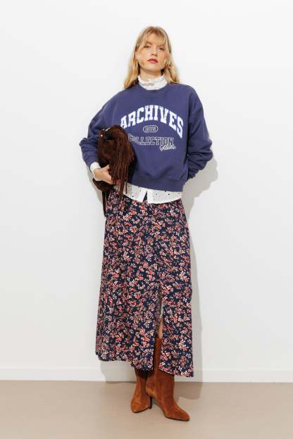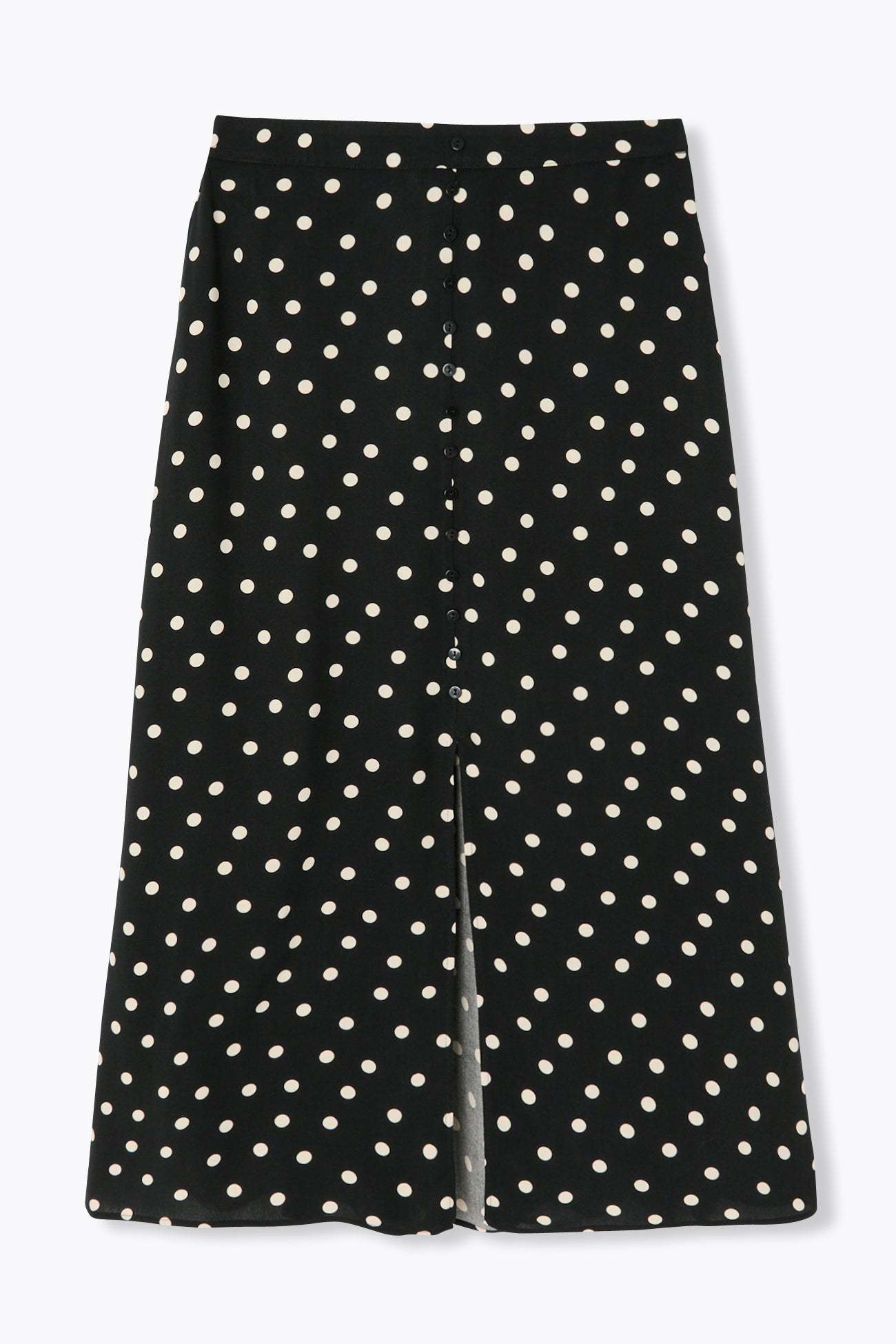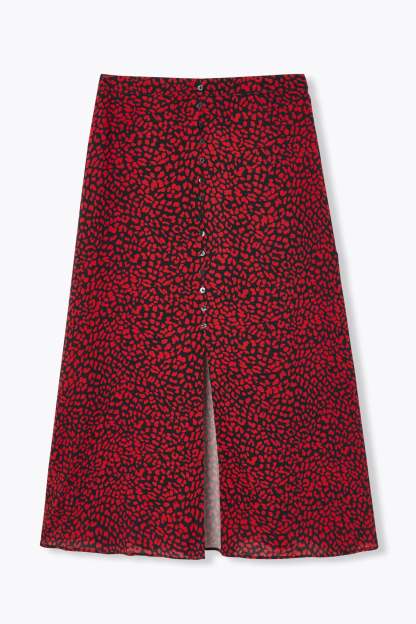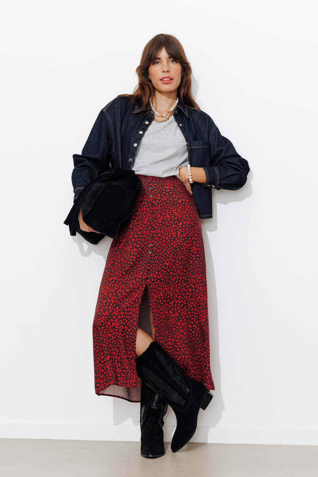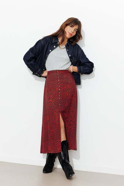 Question du moment : comment se donner une vive allure, quel que soit le moment choisi ? Réponse avec cette jupe longue et fluide. La fente devant accentue le mouvement. Le faux boutonnage rappelle les 50's. A porter en boots, des sandales, des sabots ou des nu-pieds ! Coupe évasée. Taille en forme devant et élastiquée dans le dos. 100% viscose issue de pulpe de bois provenant de forêts gérées.