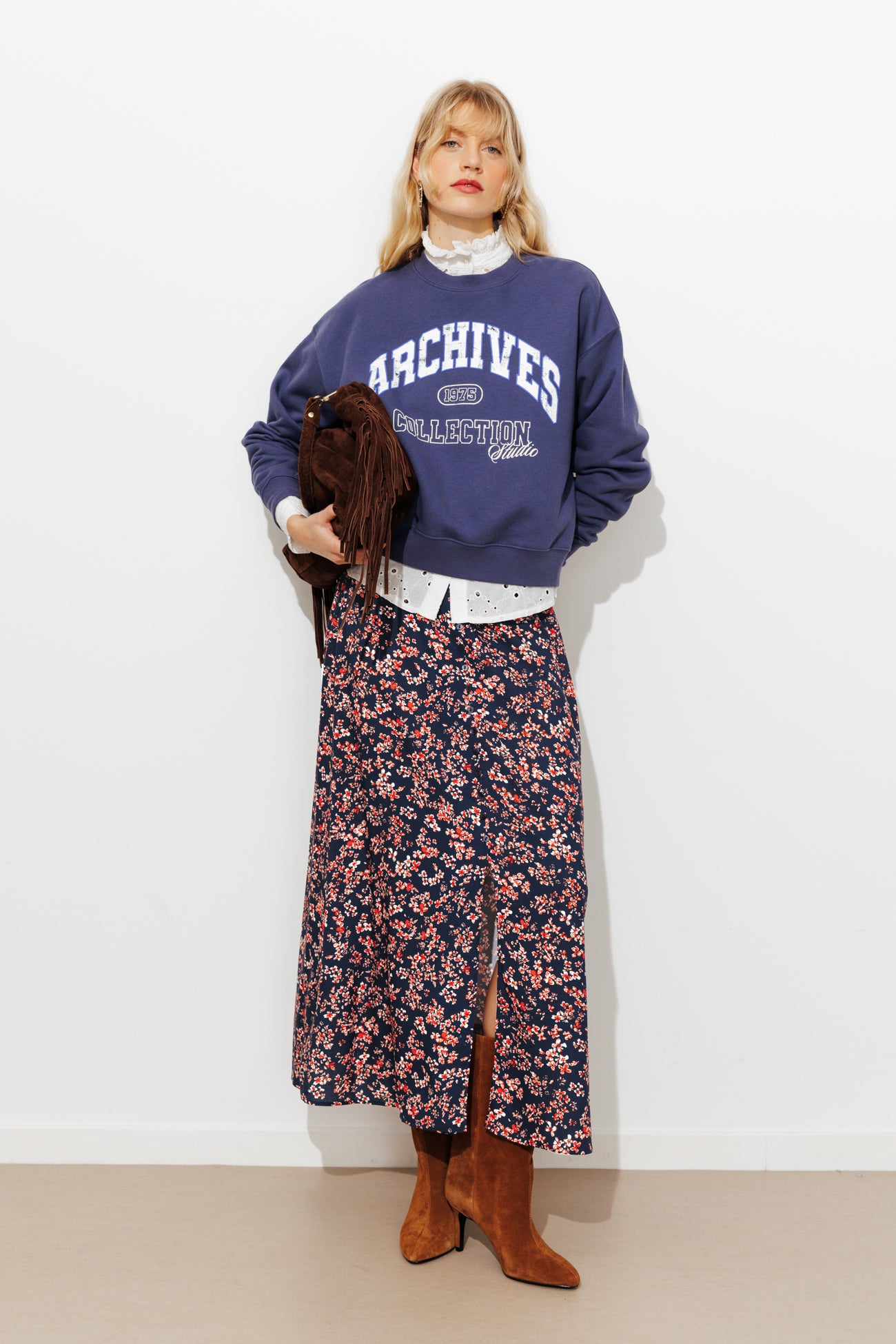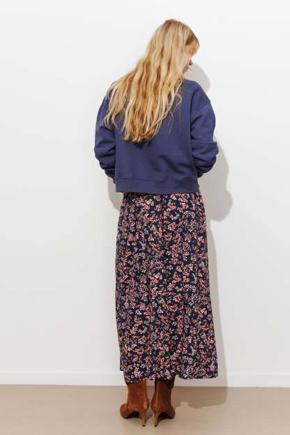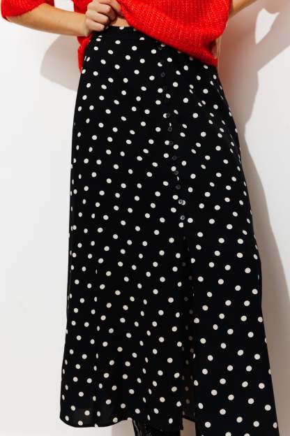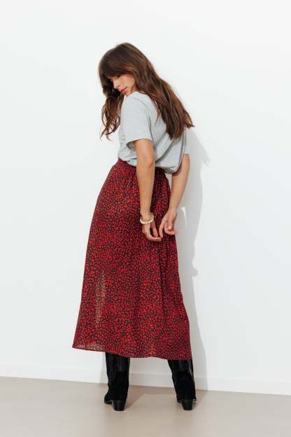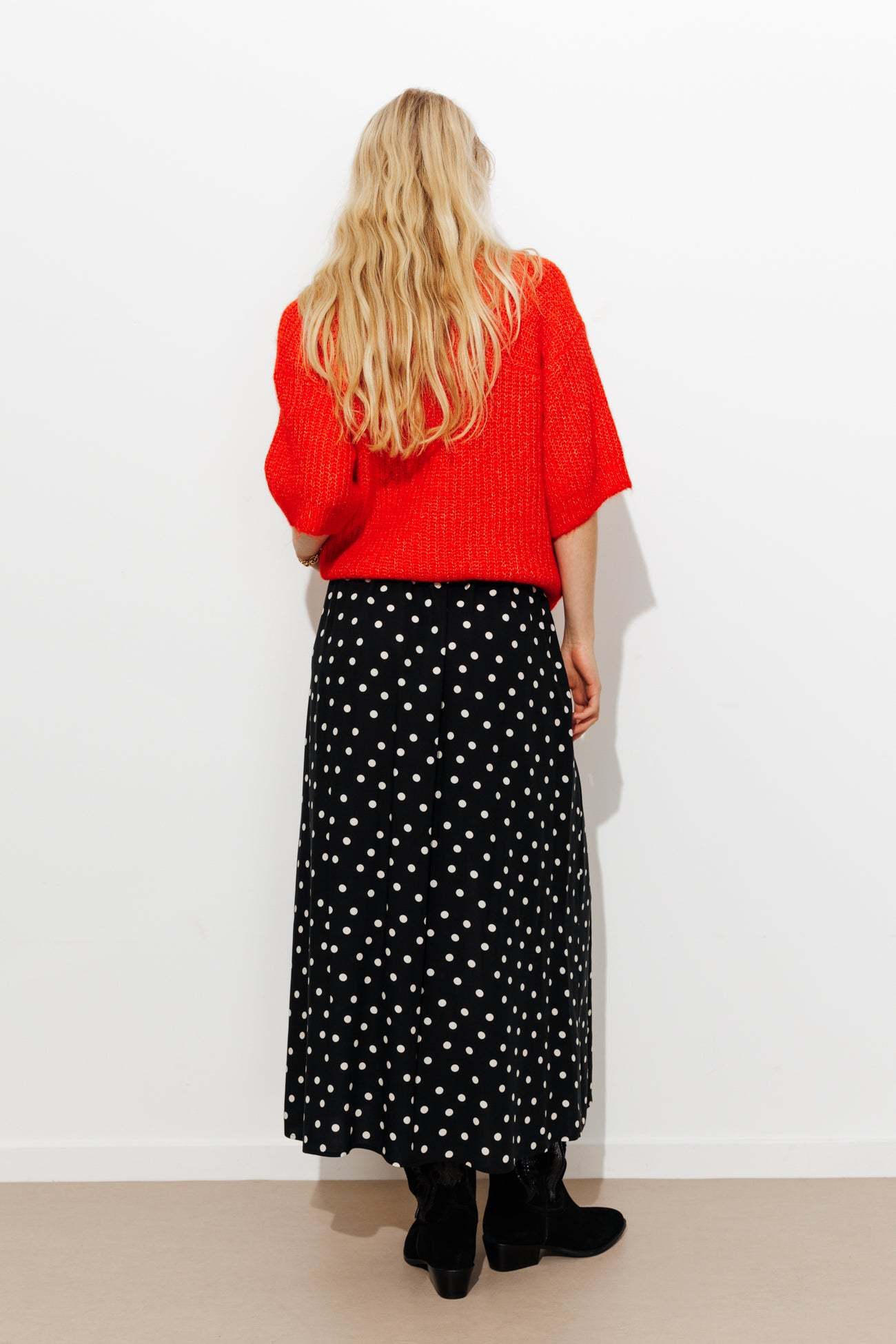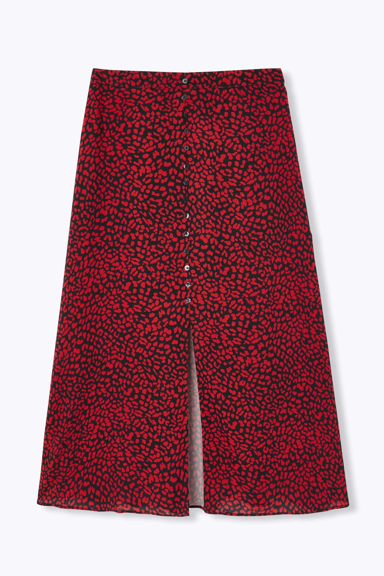 Question du moment : comment se donner une vive allure, quel que soit le moment choisi ? Réponse avec cette jupe longue et fluide. La fente devant accentue le mouvement. Le faux boutonnage rappelle les 50's. A porter en boots, des sandales, des sabots ou des nu-pieds ! Coupe évasée. Taille en forme devant et élastiquée dans le dos. 100% viscose issue de pulpe de bois provenant de forêts gérées.