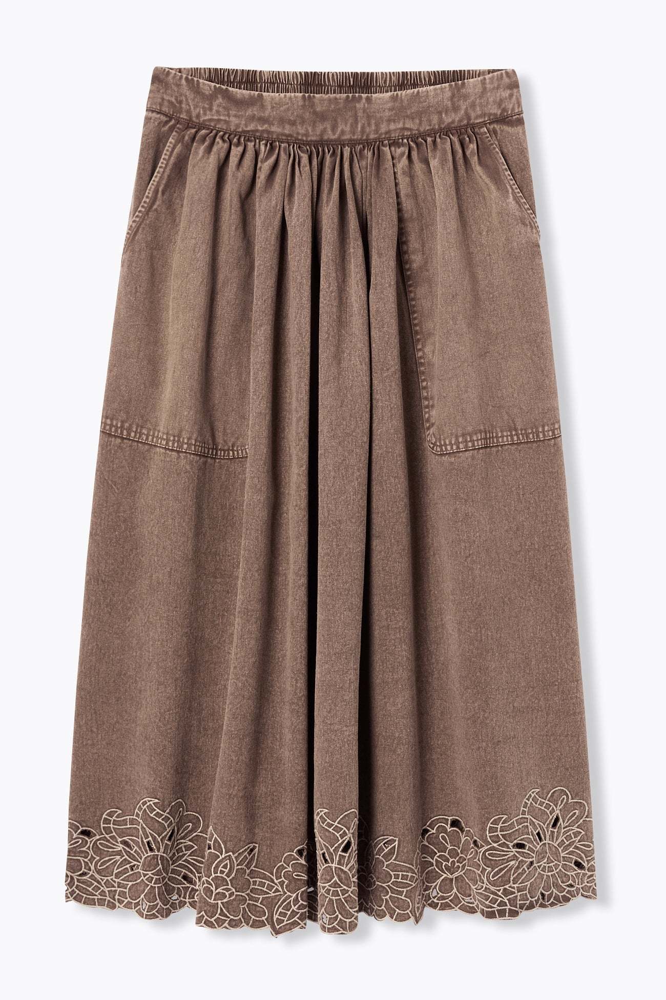 Elle augmente le mouvement, le style et l'originalité ! Toile 100% coton, en teinture unique, effet lavé. Taille en forme devant et élastiquée dos. Coupe évasée mi-longue. 2 grandes poches italiennes devant. Base festonnée, brodée et ajourée. Cette jupe femme contient du coton issu de l'agriculture biologique, cultivé sans pesticides, ni engrais chimiques, ni OGM afin de préserver la biodiversité.