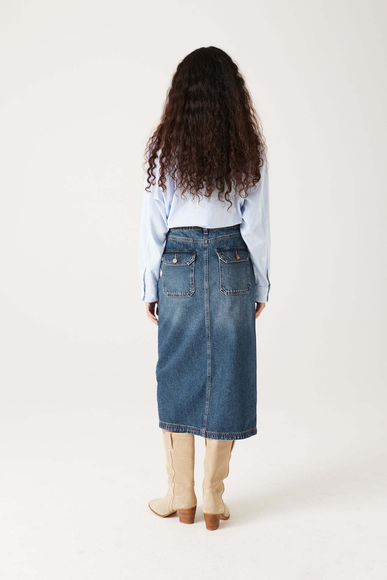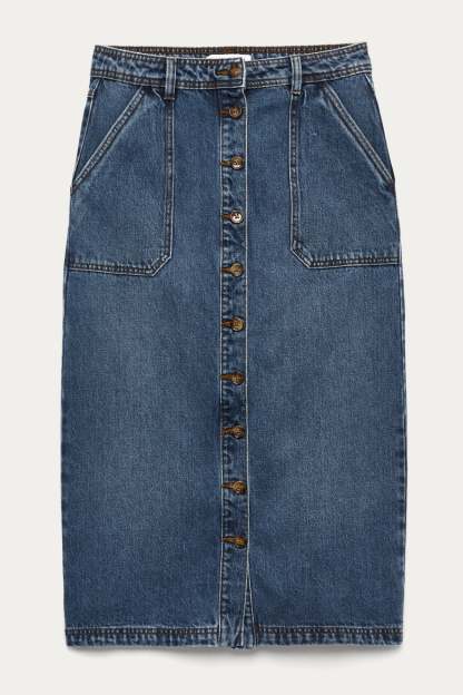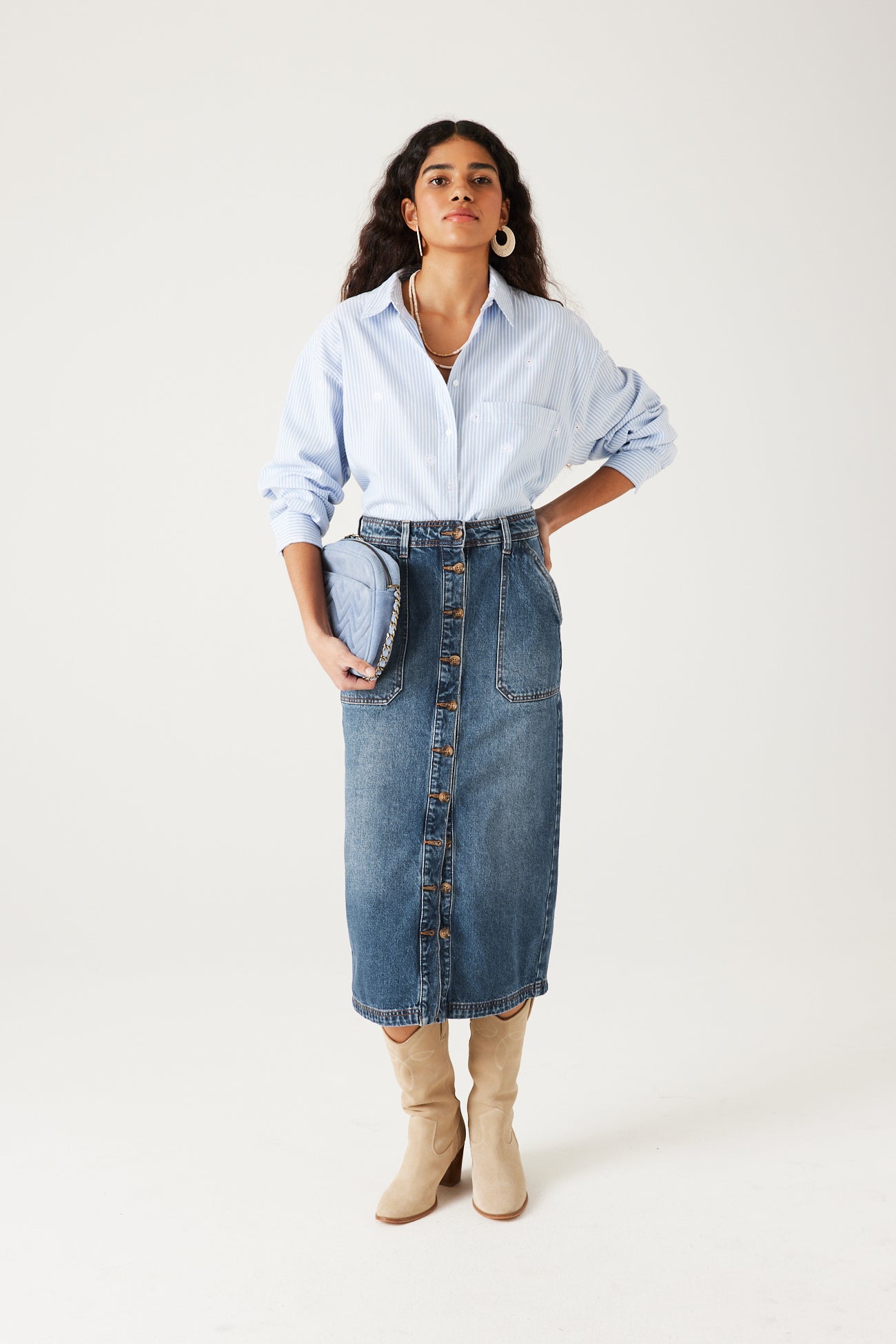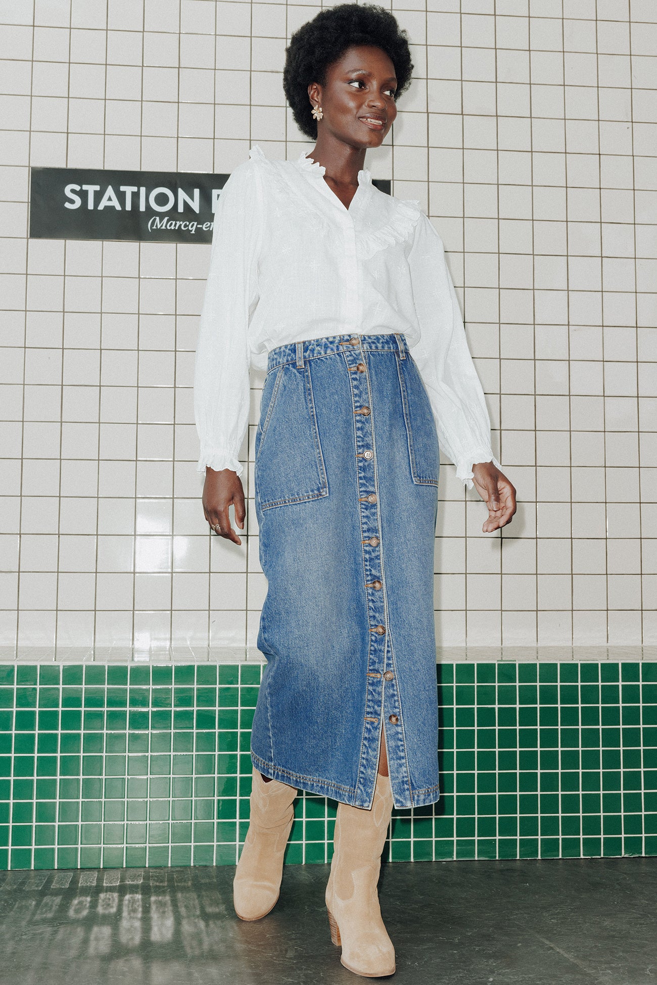 Leçon de mode à connaître par cœur : avoir une jupe en jean dans son dressing, si possible longueur midi pour être pile dans l'air du temps ! Démonstration de style avec ce modèle entièrement boutonnée devant. Denim authentique 100% Coton. Taille haute. Passants. 2 poches charpentier devant. 2 poches plaquées dos. Base droite. Coutures contrastées. Contient du coton recyclé.