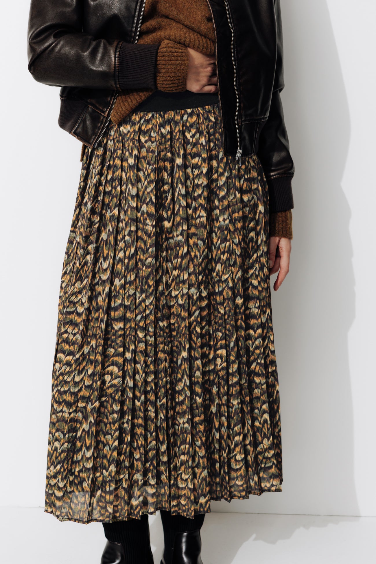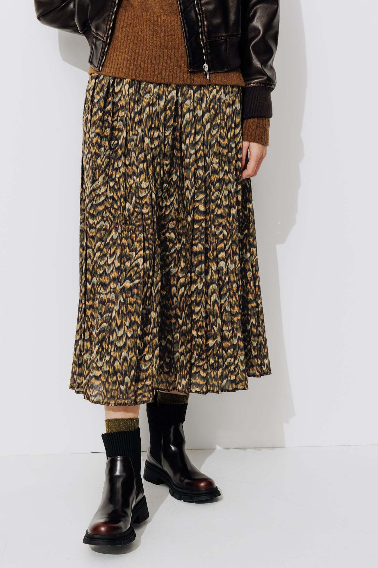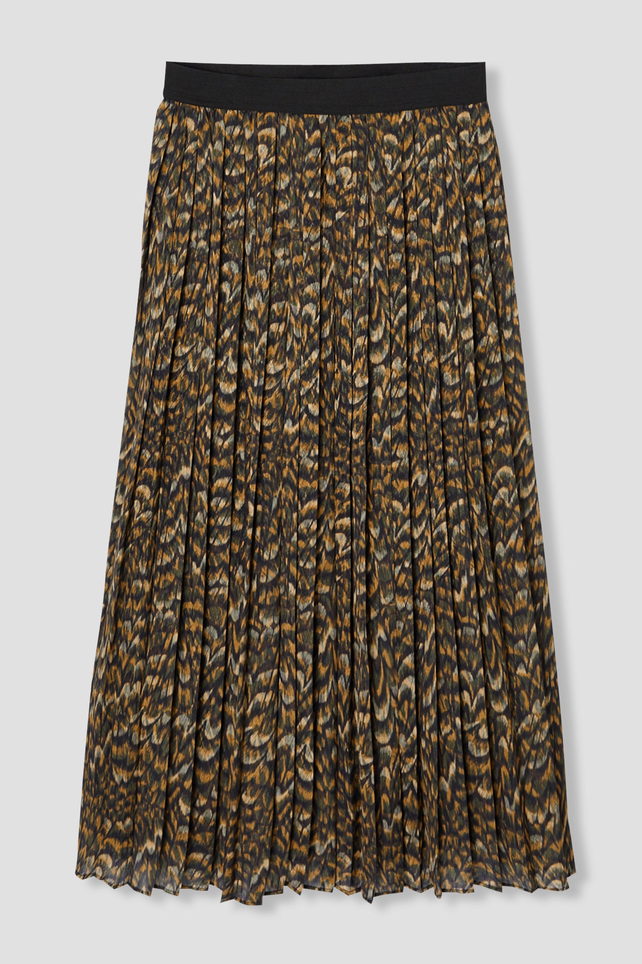 Focus sur l'imprimé effet plume, posé sur cette jupe mi-longue, plissé soleil (ne se repasse pas). Nota bene : ce motif est une création originale. Il a été dessiné dans notre studio de création par Laura, notre illustratrice textile. Parfait pour jouer avec les couleurs chaudes Taille élastiquée. Coupe évasée, longueur midi. Doublure. Cette jupe femme contient des fibres recyclées.