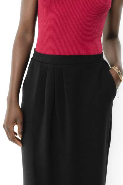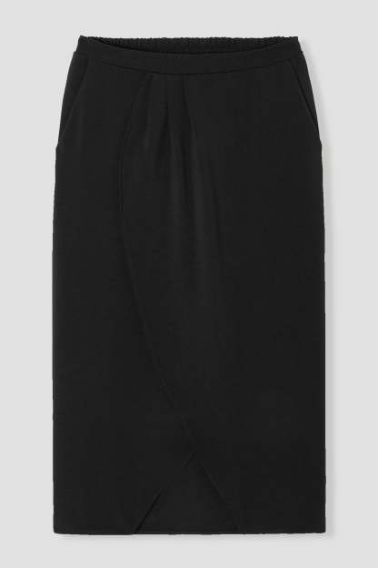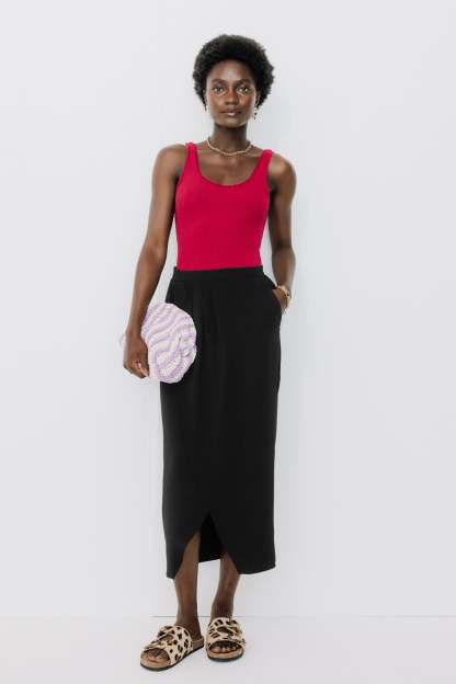 Must-have toutes saisons, toutes occasions. Cette jupe midi prend quelques libertés grâce à des pans croisés en corolle devant. Le chic est total. On aime le jeu de plis plats devant et la taille élastiquée dans le dos. Coupe près du corps, faux portefeuille. 2 poches italiennes. Base droite dans le dos. Finition piquée. Cette jupe femme contient des fibres recyclées.
