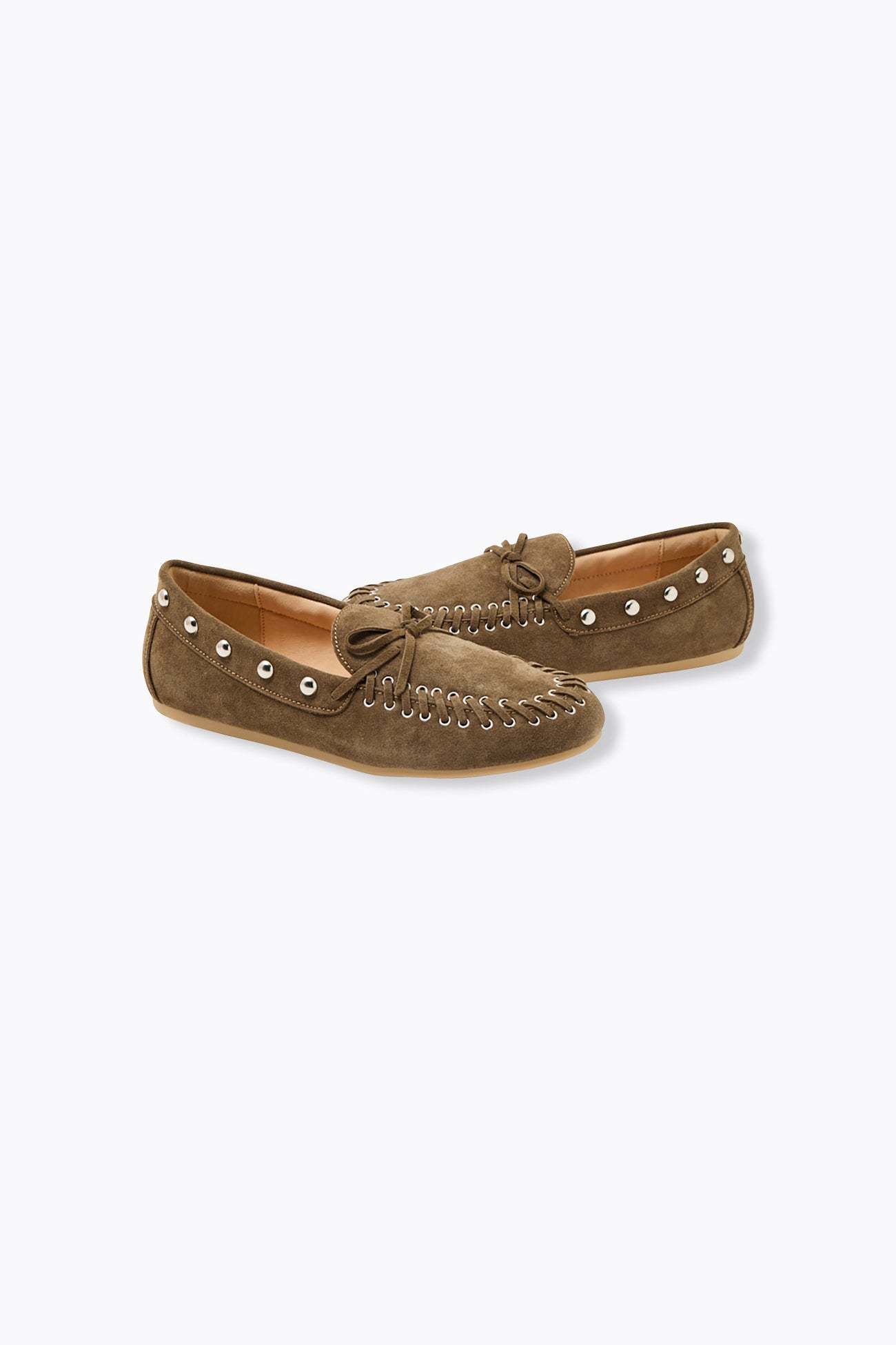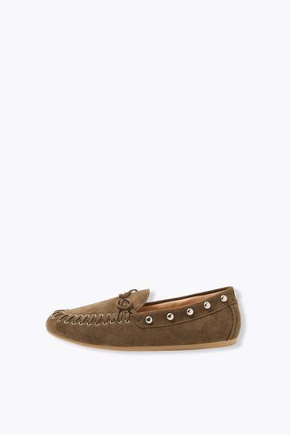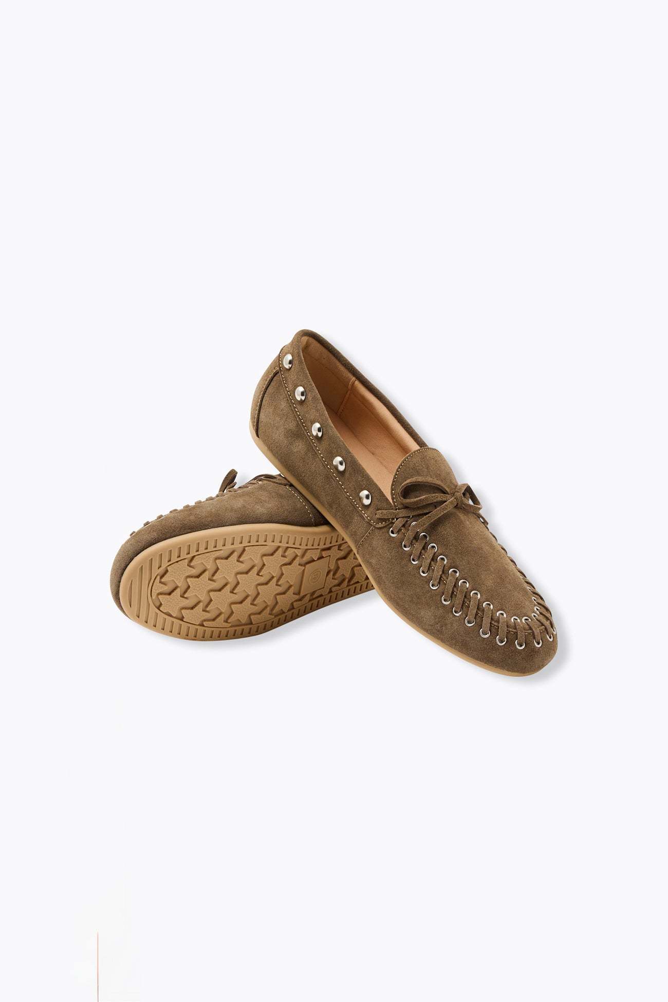 Comment aller d'un point A à un point B avec talent... réponse en images avec cette paire de mocassins. On sent l'influence amérindiennes. On aime l'ajout des clous en métal couleur argenté. A mixer avec un jean, une jupe jupon, un short en toile, un bermuda... Cuir suédé souple. Semelle intérieure moussée. Semelle extérieure plate et étoilée. Bout rond. Liens noués sur le dessus.