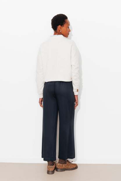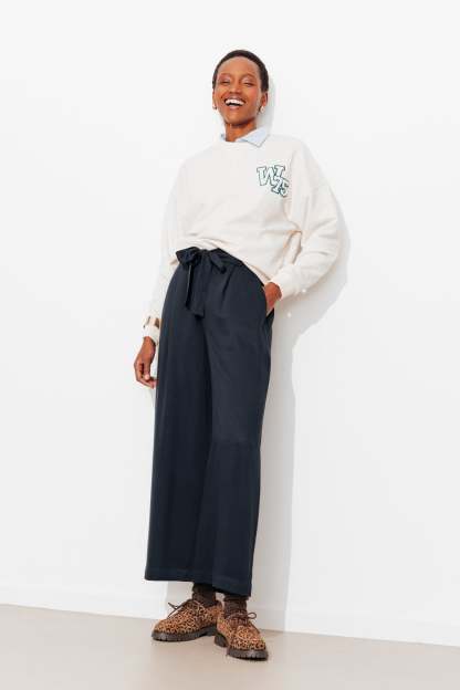 Must-have de la saison. La matière est douce et fluide. Le tombé est parfait. Ce pantalon large se sent bien partout, en baskets, en talons ou en nu-pieds ! Longueur standard. Taille en forme devant et élastiquée-smockée dans le dos. Passants. Demi-ceinture à nouer. 2 poches. Ce pantalon contient des fibres recyclées et de la viscose issue de pulpe de bois provenant de forêts gérées.