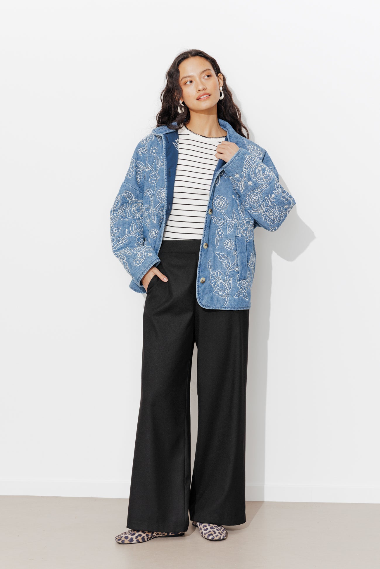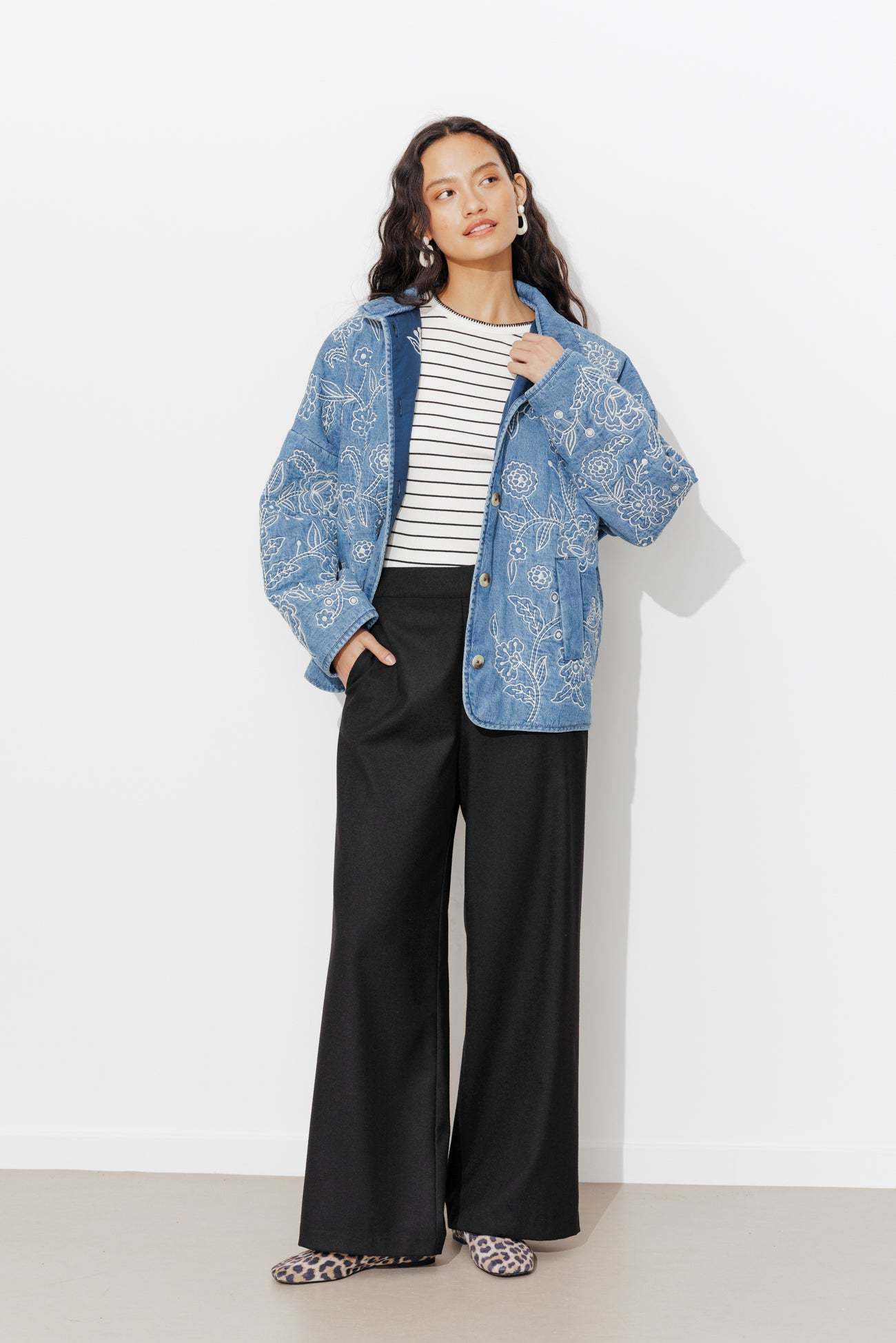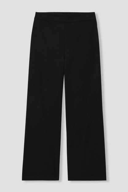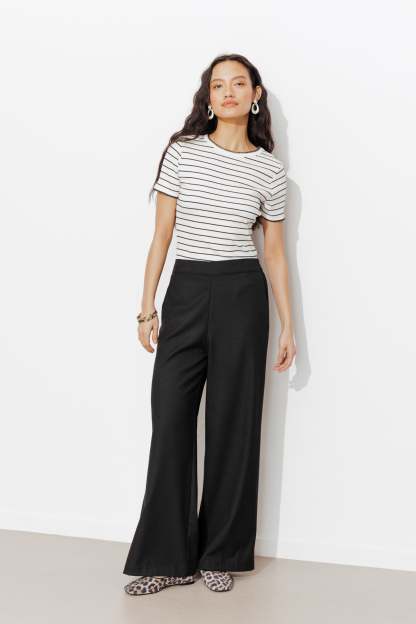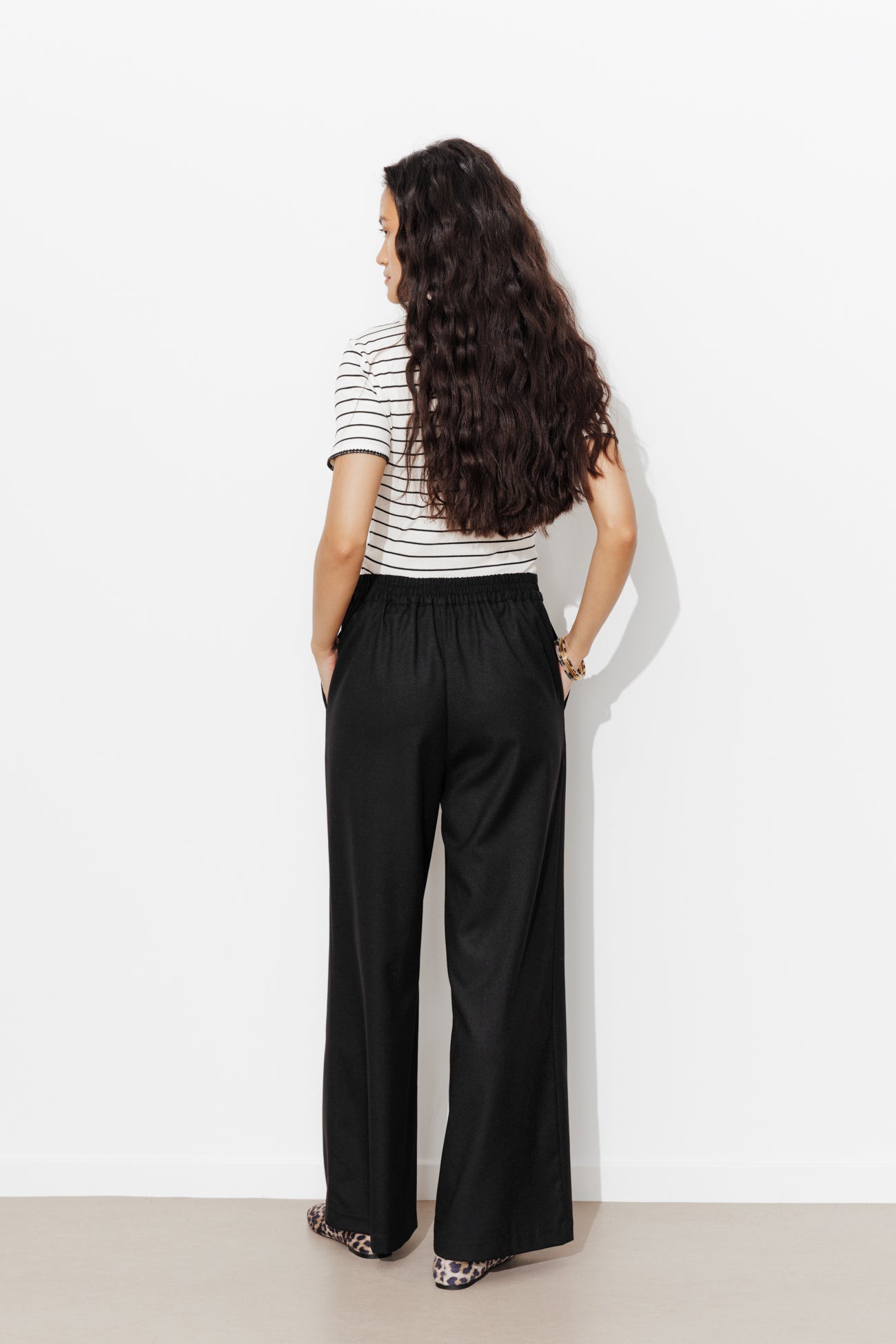 ESSENTIEL. Ce pantalon large oscille entre le chic urbain et le cool sportswear. Tout dépend du moment choisi et des shoes qu'on lui associe : talons hauts, ballerines, baskets ou mocassins. On aime : la taille haute élastiquée dans le dos pour plus de confort et de liberté de mouvement. Coupe large et longueur standard. Tissu doux, joli tombé. 2 poches italiennes. Ce pantalon femme contient des fibres recyclées.