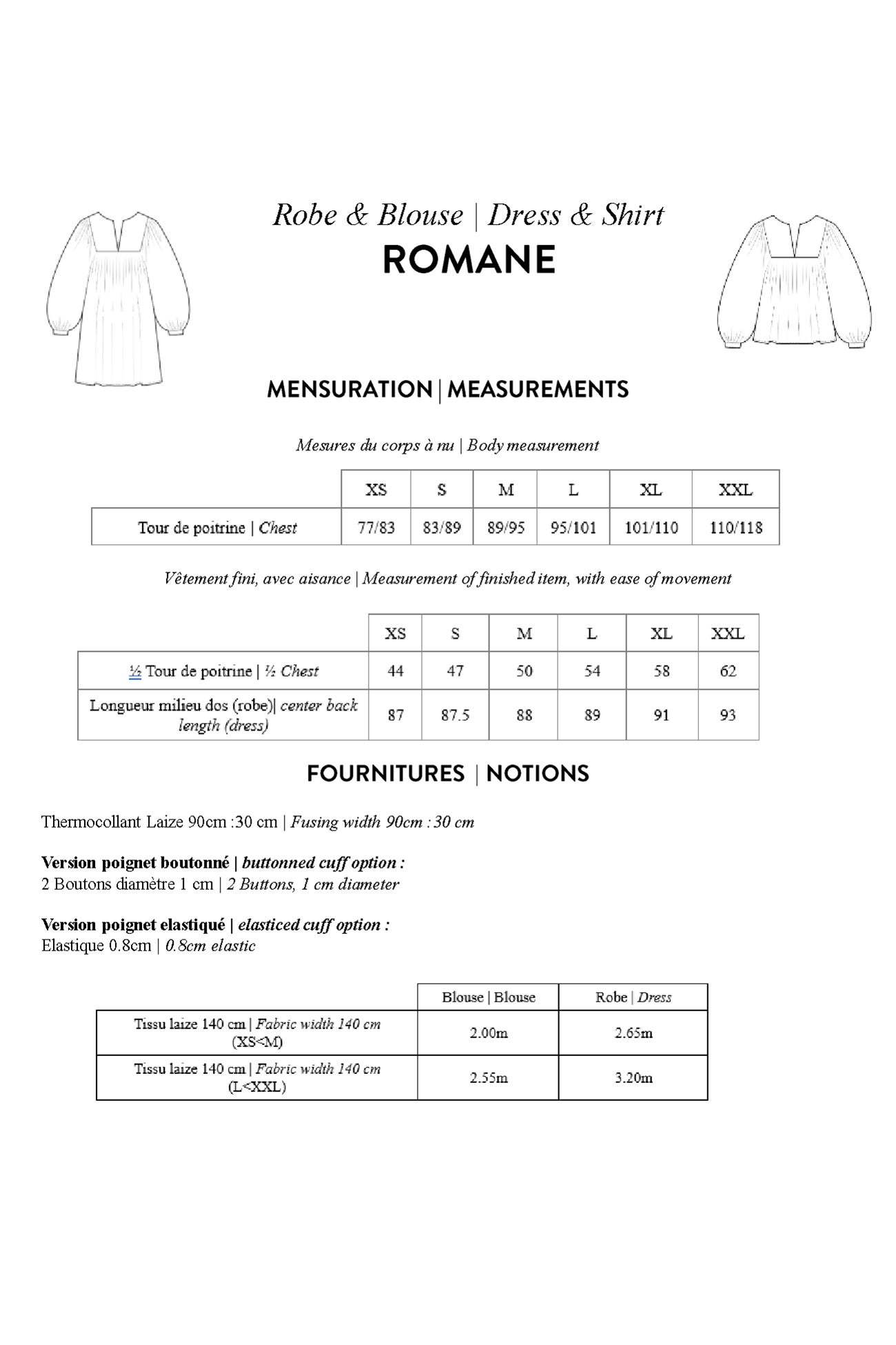 Belle, bohème et repère-style saison après saison... La blouse ROMANE est désormais entre vos mains de couturière passionnée ! Libre à vous de l'adapter : en blouse ou en robe, version manches longues, papillon ou 3/4, poignets boutonnés ou élastiqués. A confectionner en viscose, coton ou satin. A réaliser de la taille 34 à 48. Niveau intermédiaire. Tuto vidéo détaillé. Format A4, 41 pages. A noter : les patrons pdf ne sont ni échangés, ni remboursés.