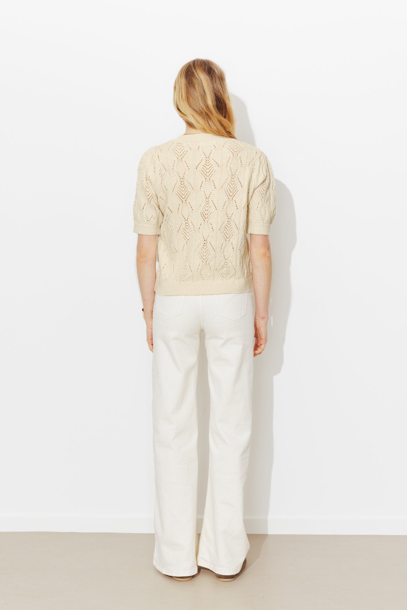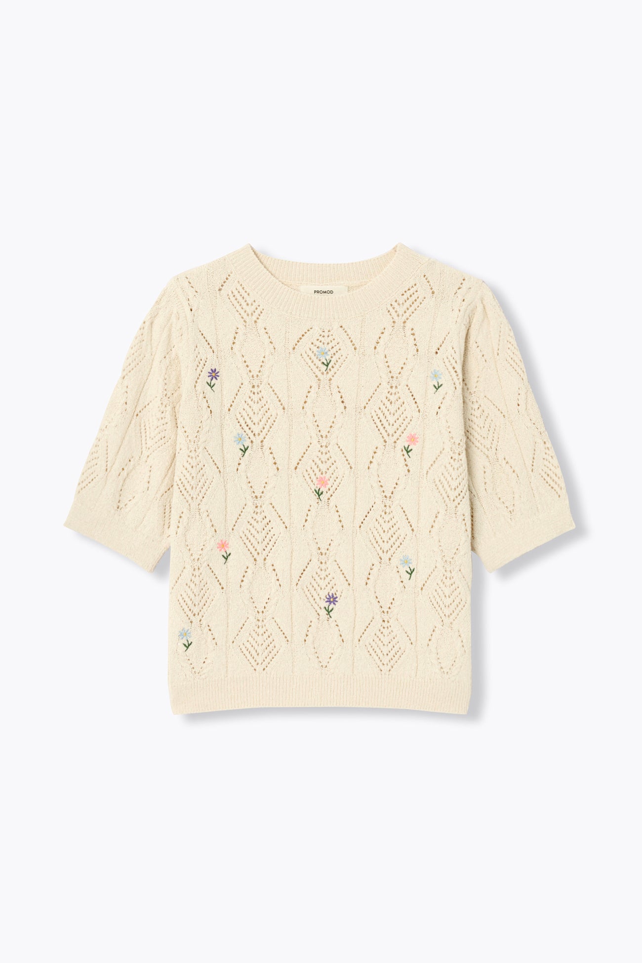 Avoir un pull à manches courtes, c'est faire le choix du rétro chic ! Et avec ce modèle brodé de fleurs, on ajoute une note fraîche,romantique et canon à un jean, une jupe en toile, un short de couleur... Zoom sur les détails qui comptent : les torsades ajourées devant et dans le dos. Maille souple. Coupe droite légèrement resserrée à la base. Col rond. Manches courtes. Base droite. Bords-côtes. Ce pull femme contient du coton recyclé et des fibres recyclées.