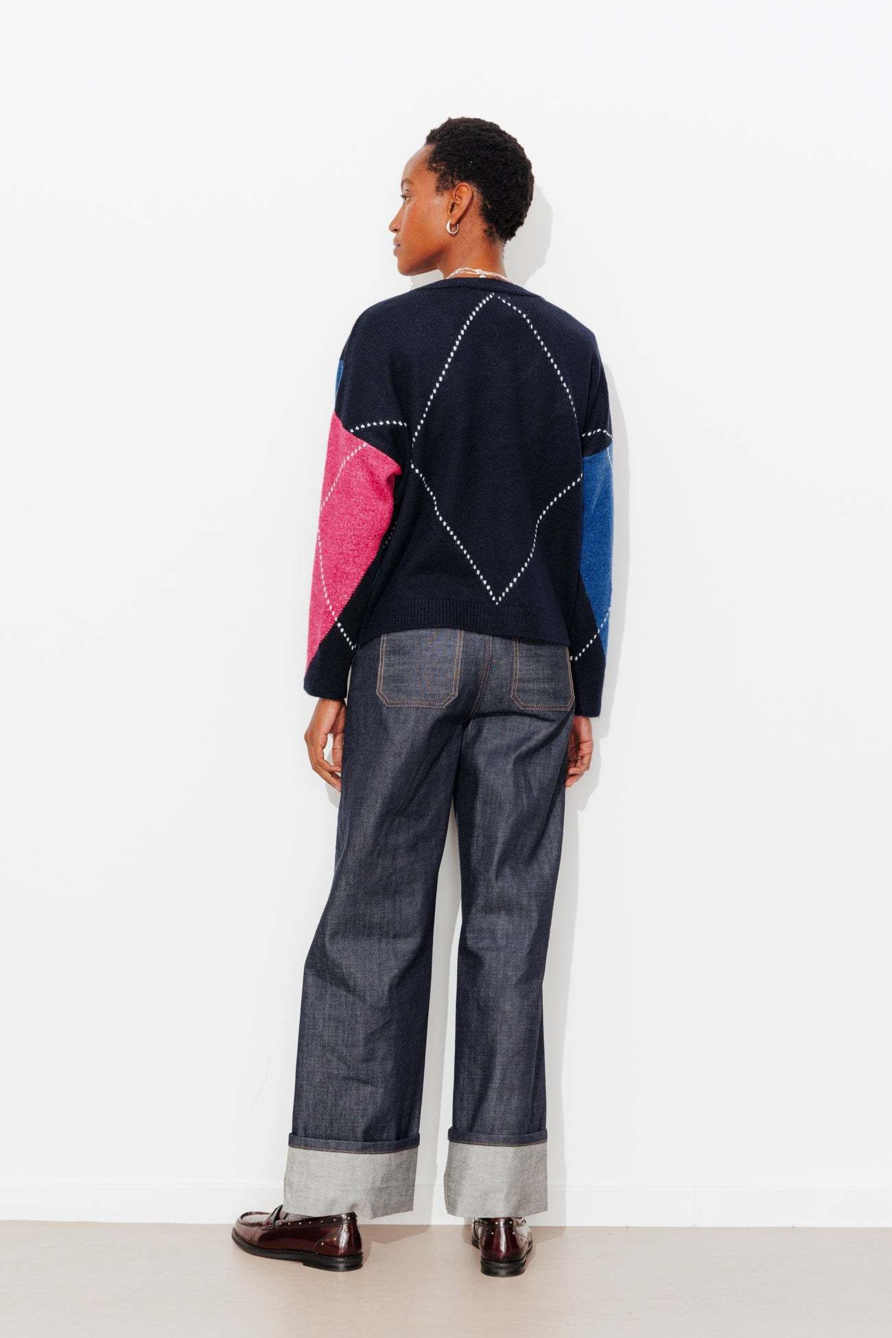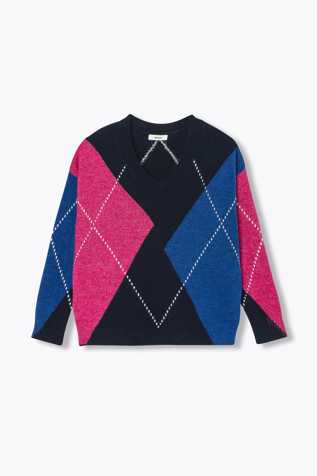 Grands losanges & belle douceur. Preppy & British, la tendance argyle continue à prendre de l'ampleur ! Démonstration chic avec ce pull col V tout doux, à faire matcher avec un jean ou une jupe courte. Losanges en jacquard, colorés devant et unis dans le dos. Coupe oversize. Emmanchures descendues. Manches longues. Base droite. Bords-côtes. Ce pull femme contient des fibres recyclées.