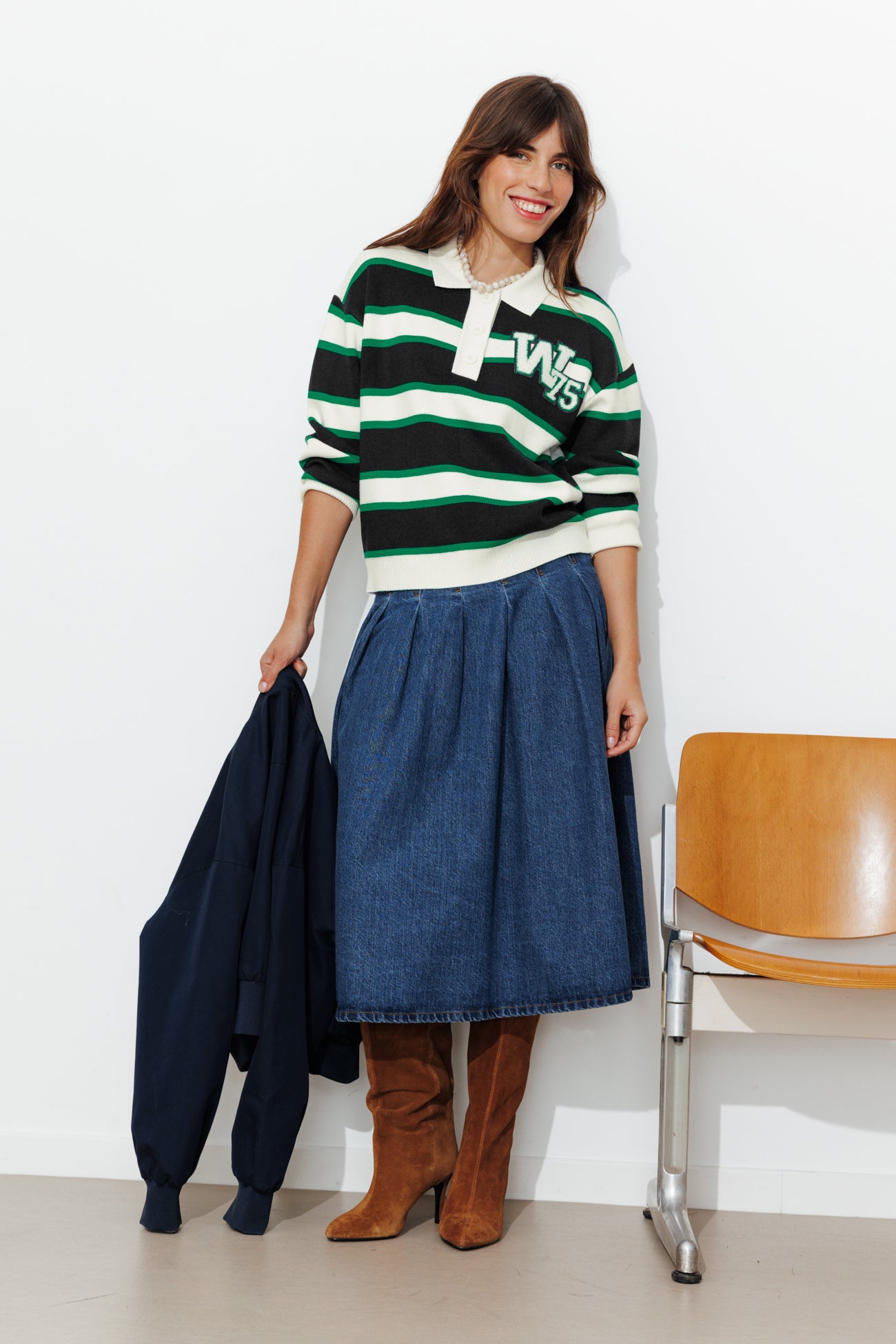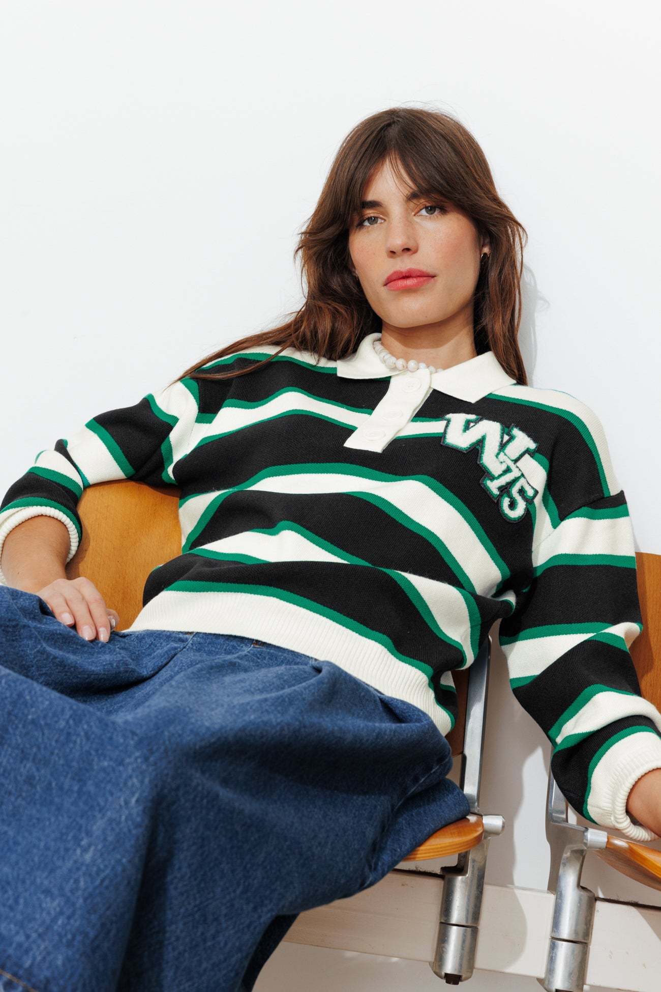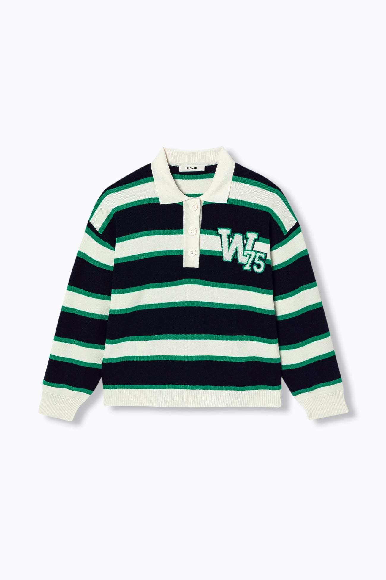 Masculin-féminin sportswear. Le pull polo à larges rayures nous plonge dans l'esprit campus : c'est rafraîchissant ! Maille fine douce et compacte. W75 en bouclettes sur la poitrine. Coupe légèrement resserrée à la base. Col polo, ouverture boutonnée. Emmanchures descendues. Manches longues coniques. Ce pull femme contient de la viscose issue de pulpe de bois provenant de forêts gérées.