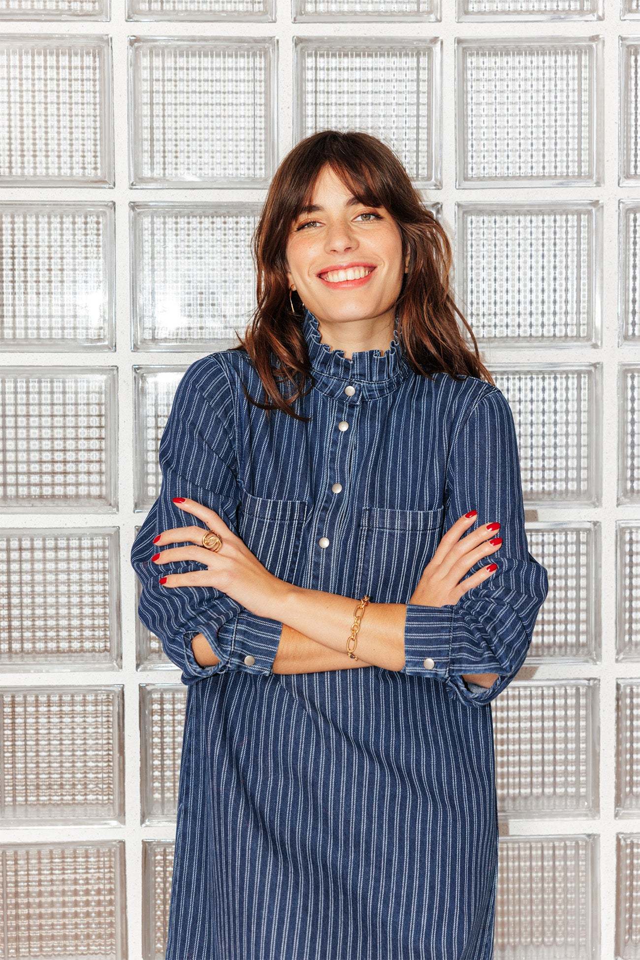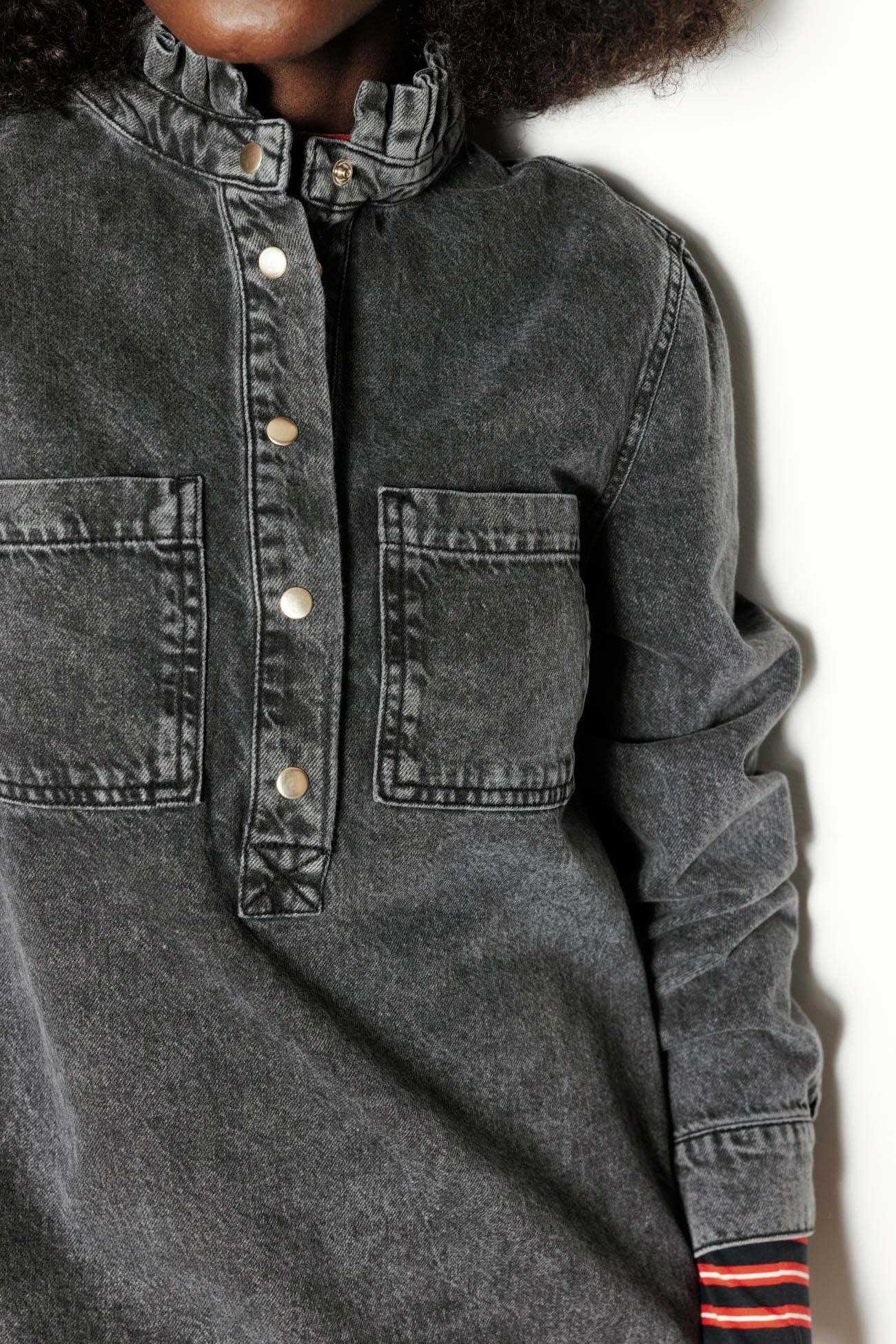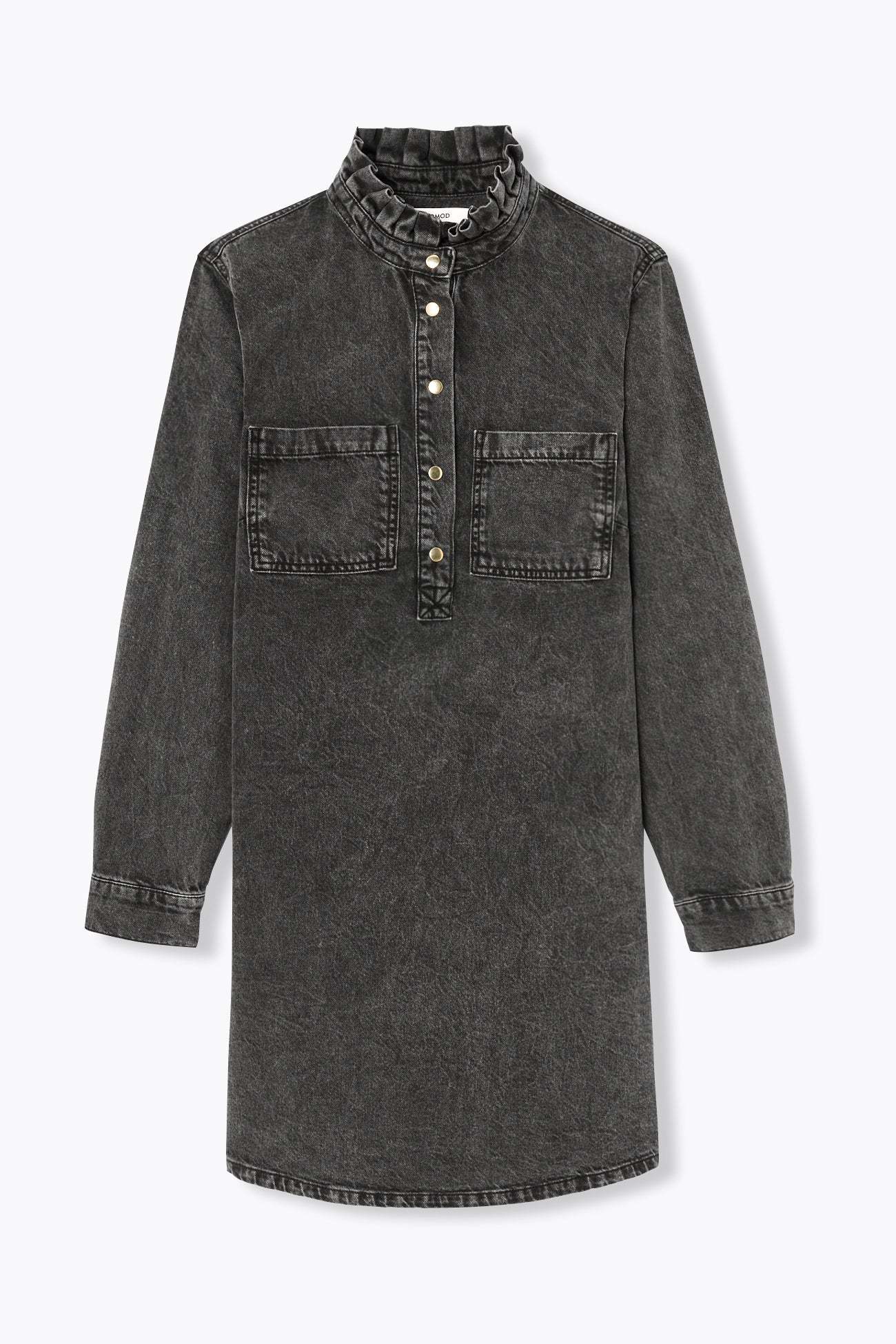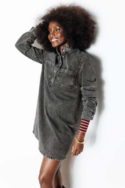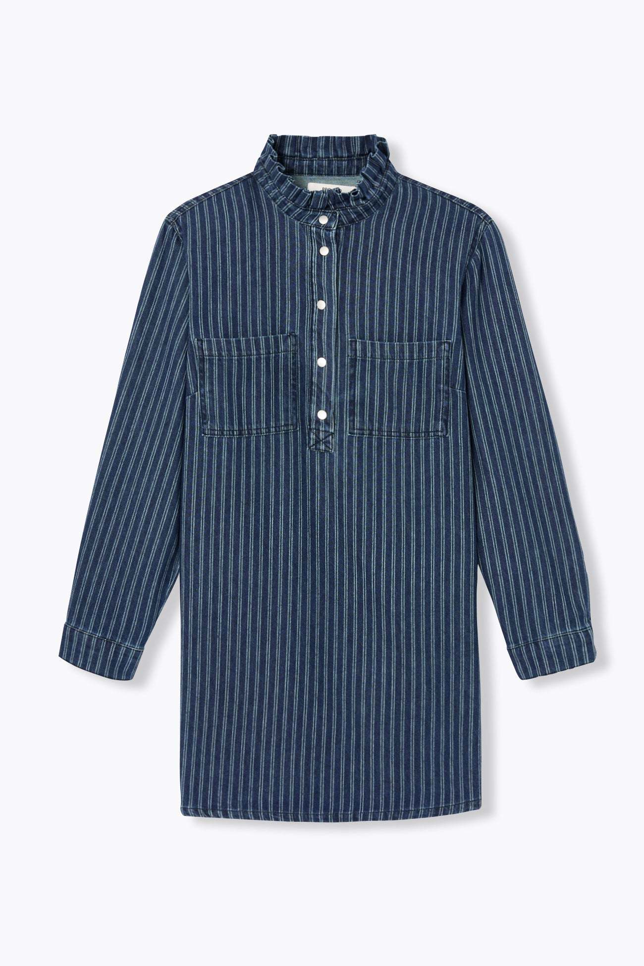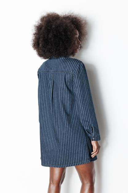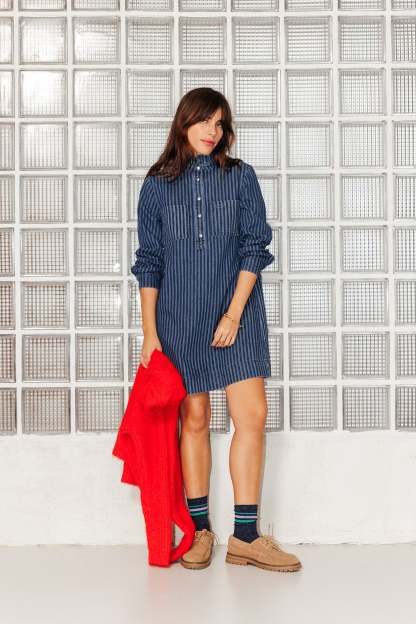 La robe en jean : une présence forte, une valeur sûre, un style canon ! On la porte le plus souvent possible, avec ou sans bijoux, avec ou sans collants. En bonus-trendy : le frou-frou sur le col rond montant. Denim 100% coton, épais et souple. Coupe droite. Semi-ouverture pressionnée. 2 poches poitrine. Manches longues, poignets pressionnés. Plis d'aisance dos. Base légèrement arrondie.