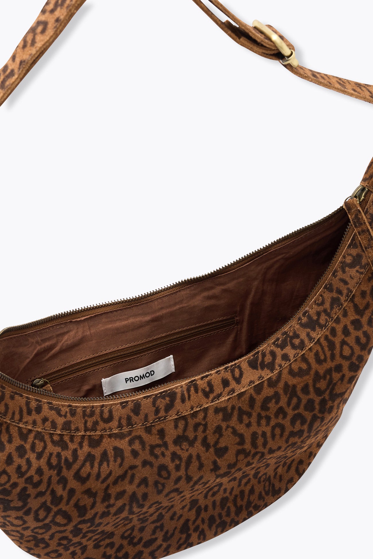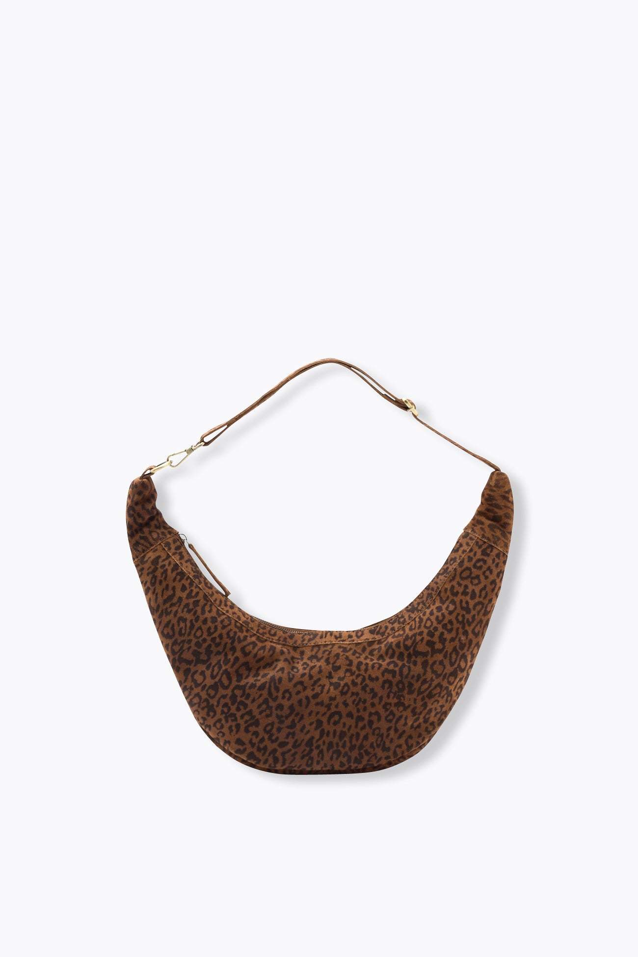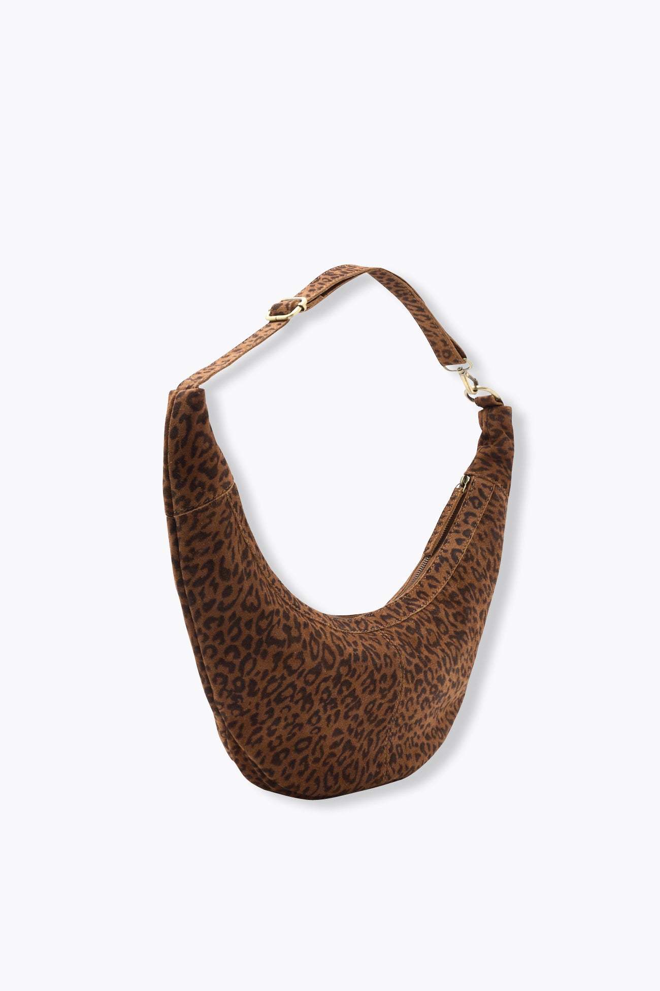 Un sac croissant en cuir suédé imprimé léopard... et on est prêtes pour un nouveau départ, le jour ou le soir ! Anse ajustable et amovible, porté main, épaule ou croisé. Grande ouverture zippée, languette. Doublure unie. 1 poche simple avec biais léopard et 1 poche zippée à l'intérieur. Bouclerie en métal vieilli couleur dorée. Taille unique. Idée-cadeau.