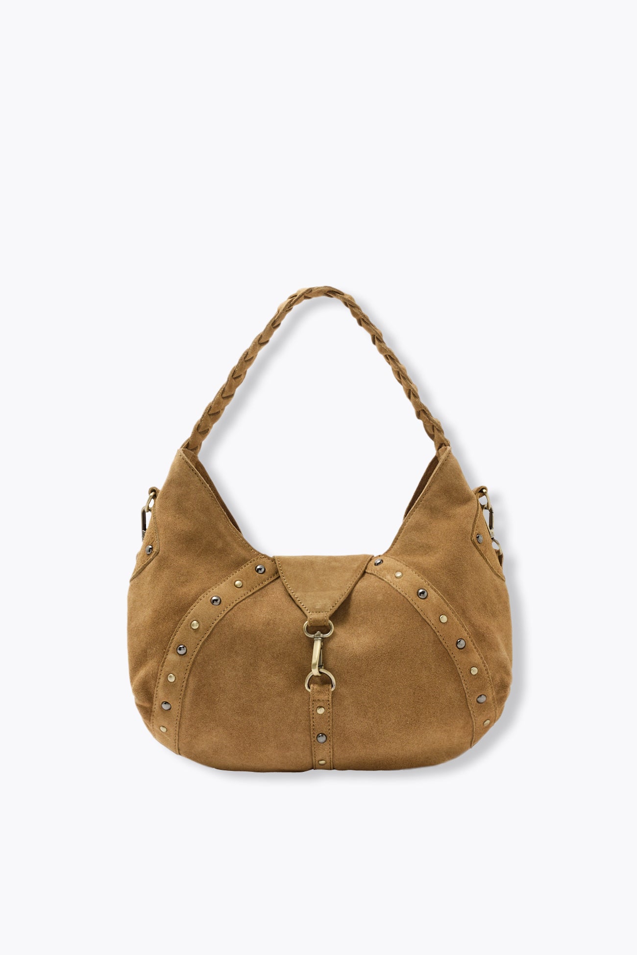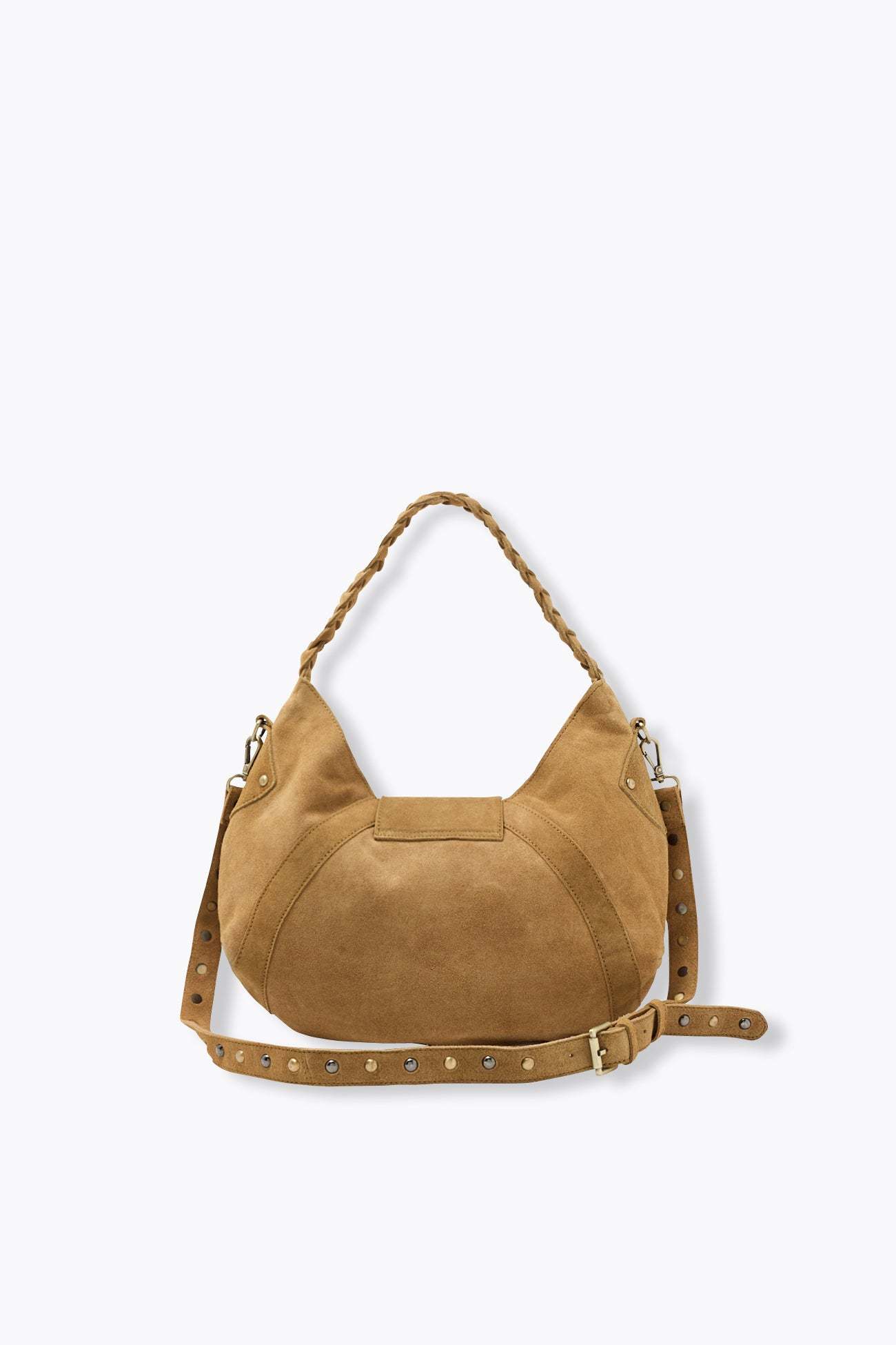 Du cuir suédé et des clous : ce sac a le rock dans la peau, comme nous ! On le porte avec une robe bohème, un ensemble jean + t-shirt, un trench classy... 2 anses : une tressée porté main ou épaule, une ceinturée ajustable et amovible pour un porté en bandoulière. Fermeture par une patte avec fermoir métal devant. 1 poche intérieure zippée. Taille unique. Belle idée-cadeau. A imperméabiliser régulièrement.