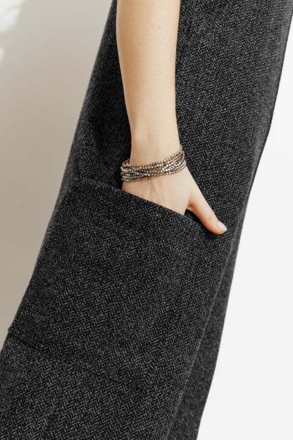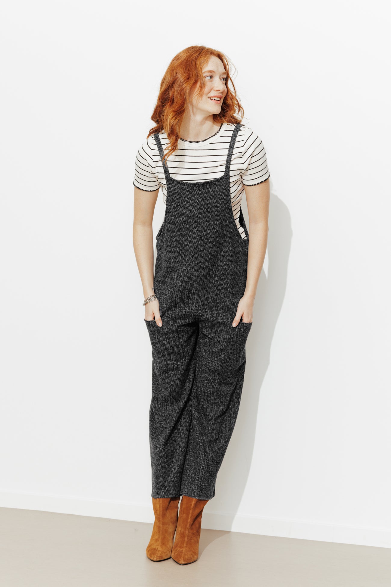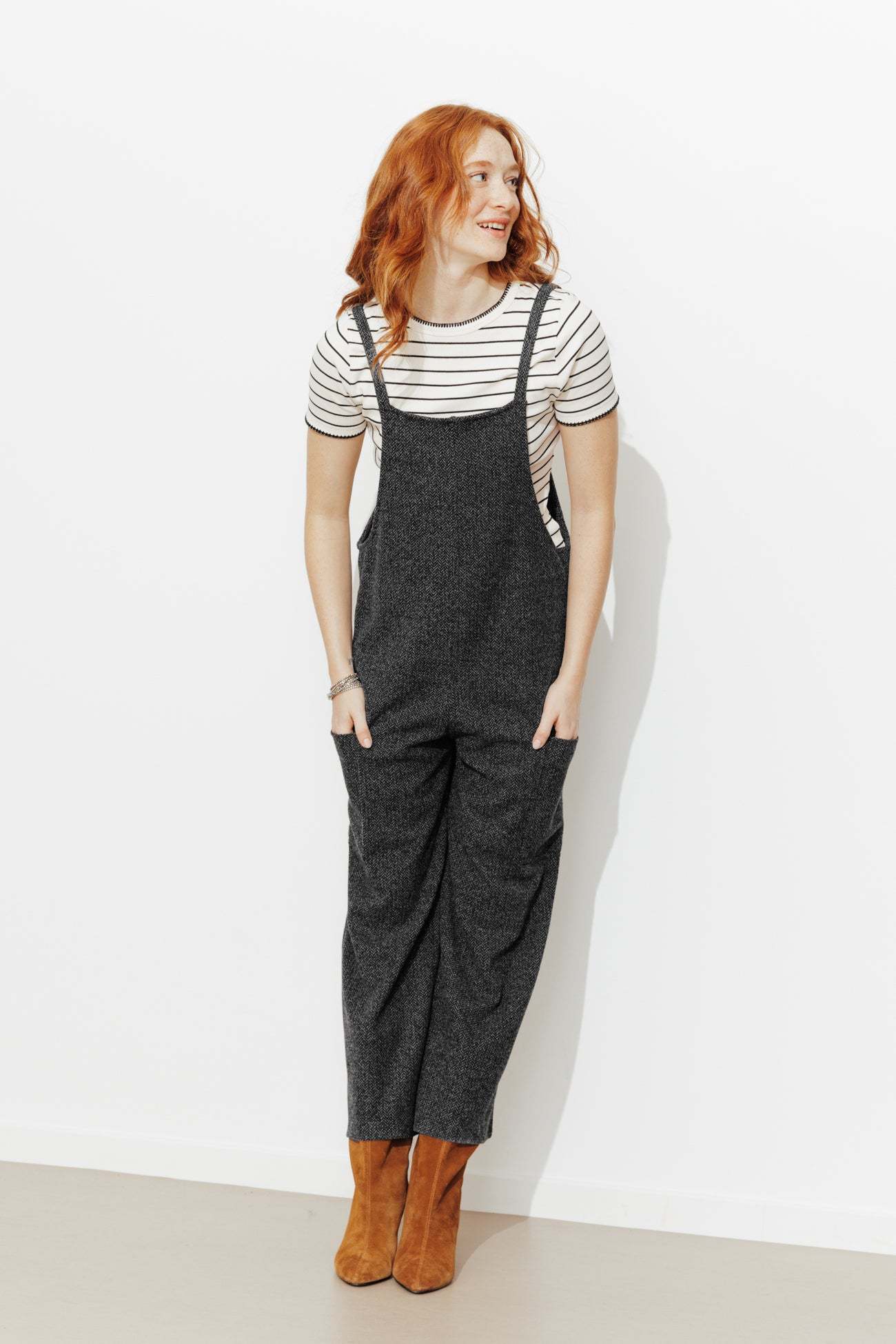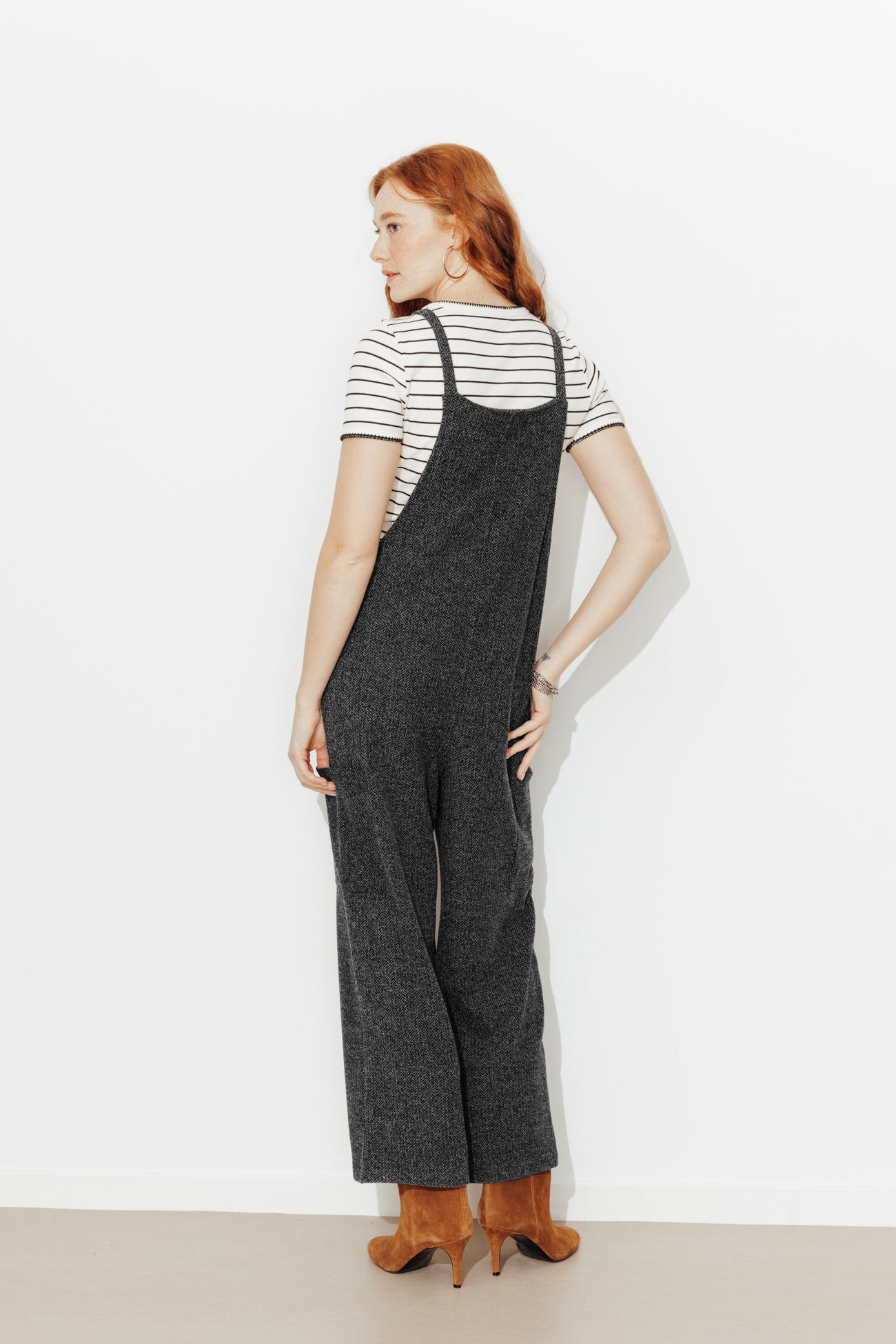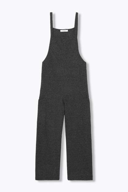 Une salopette d'un nouveau genre prend place dans nos dressings et dans nos vies... Elle oscille entre l'envie de sortir chic et de rester cool. A porter avec des boots à talon pour élancer l'allure. Tissu doux et chaud, effet chevron. Fines bretelles. 2 grandes poches plaquées sur les côtés. Coupe droite, jambes courtes. Finition piquée. Cette salopette femme contient des fibres recyclées.