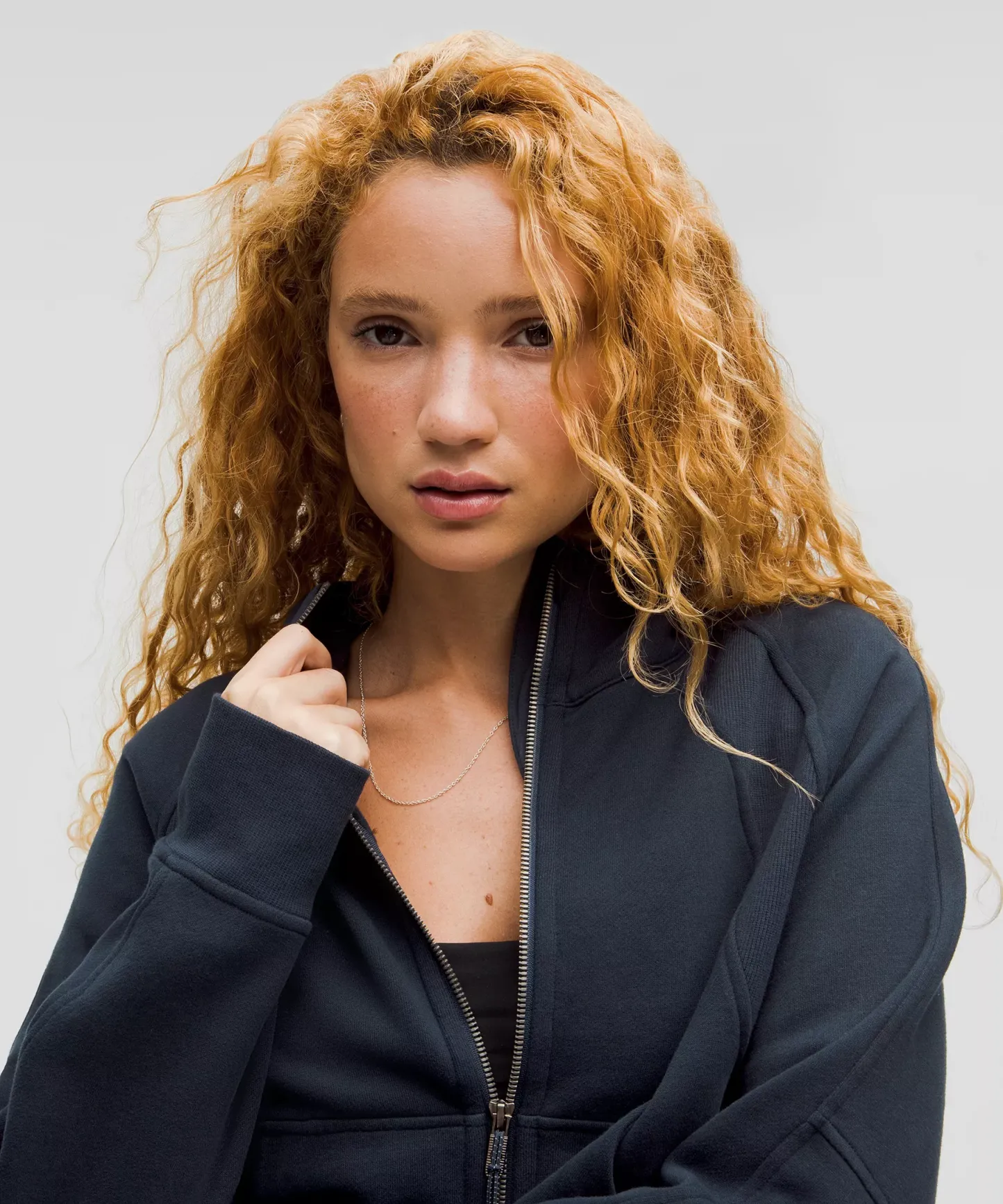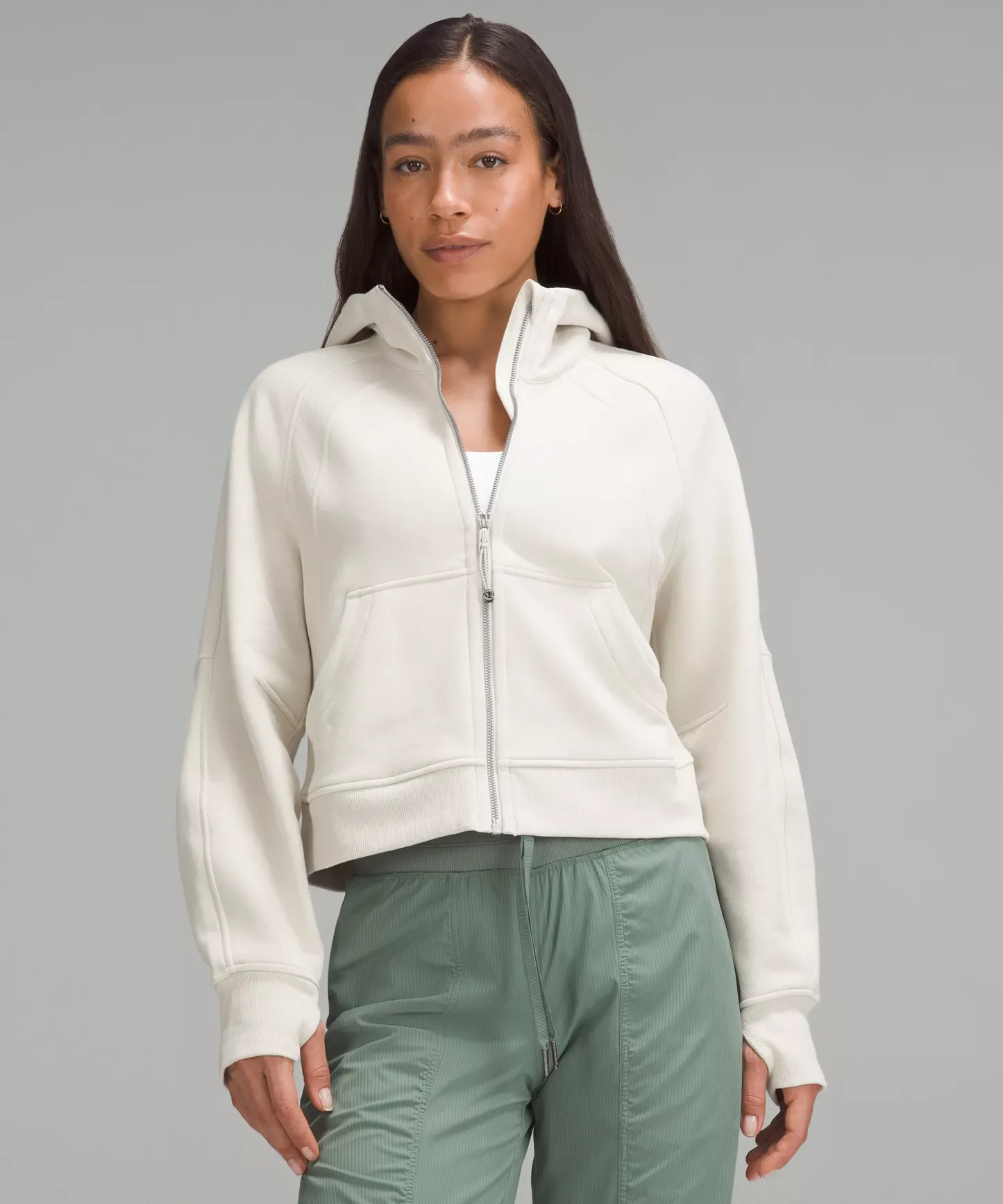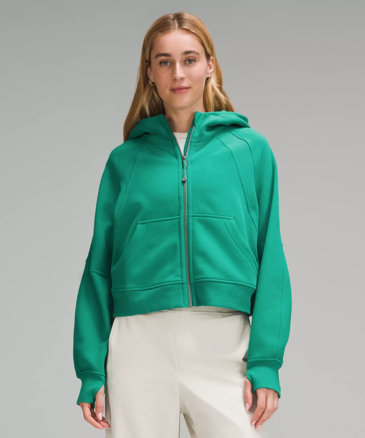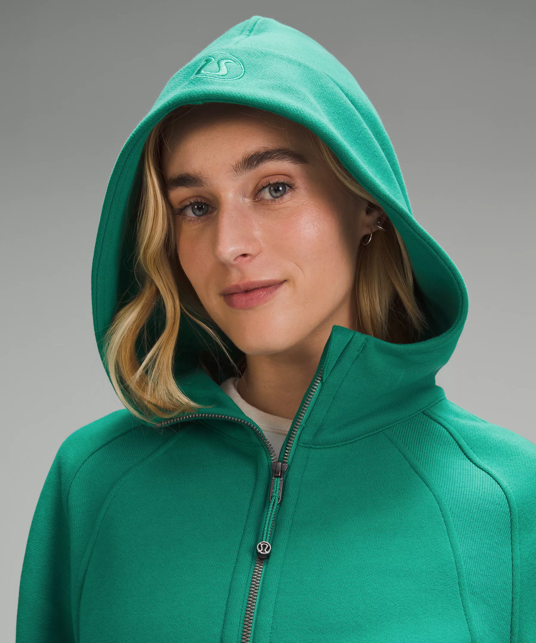 - Elastic zipper pull doubles as an emergency hair tie