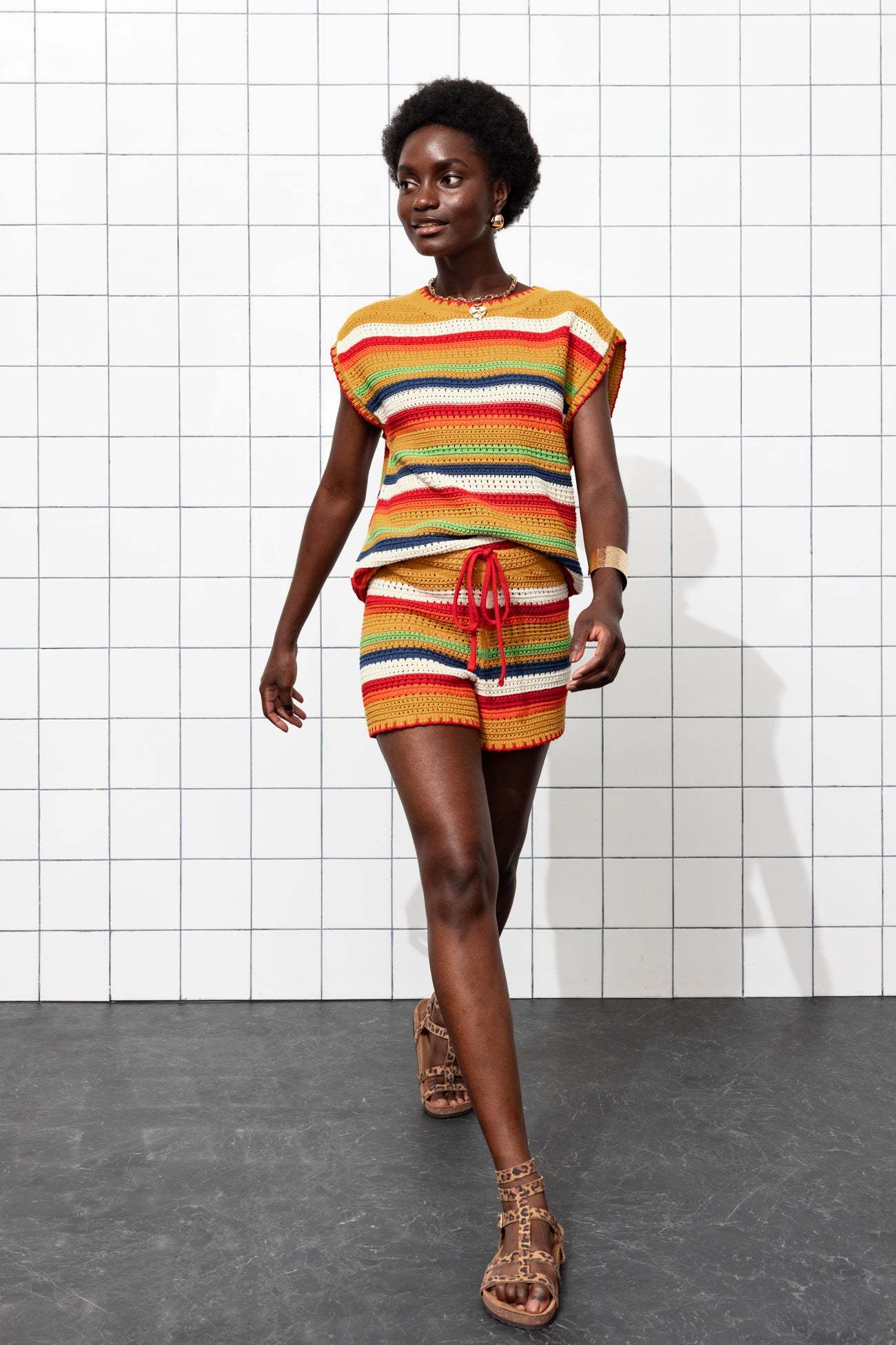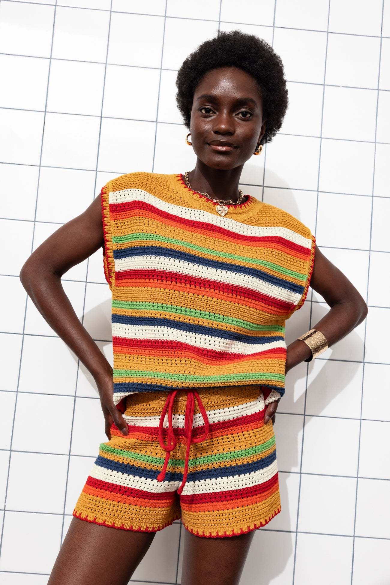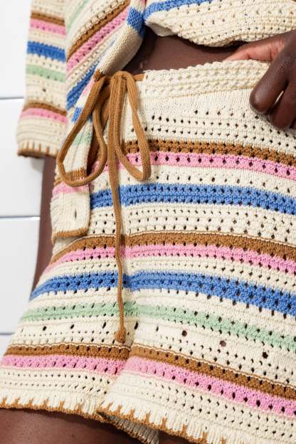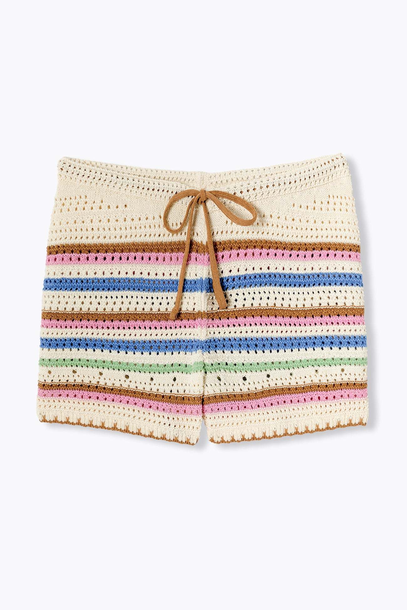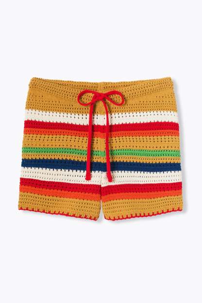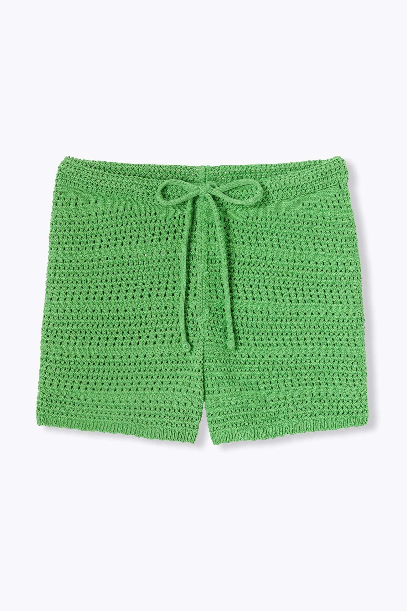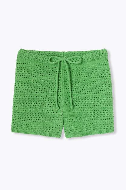Réminiscence 60/70's, ajours discrets et jambes au soleil ! Le short en crochet a très envie de passer toute la belle saison à défiler stylé ! On le porte avec des nu-pieds, des sandales ou des sabots. On ose un total look crochet, parfois. Maille souple. Coupe ample. Lien coulissant à nouer, taille haute. Bords-côtes. Ce short femme contient du coton recyclé et du polyester recyclé. Taille grand.