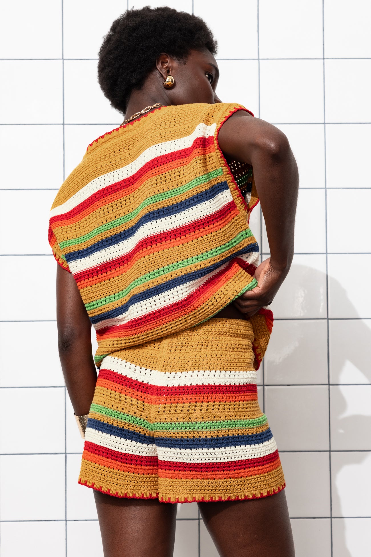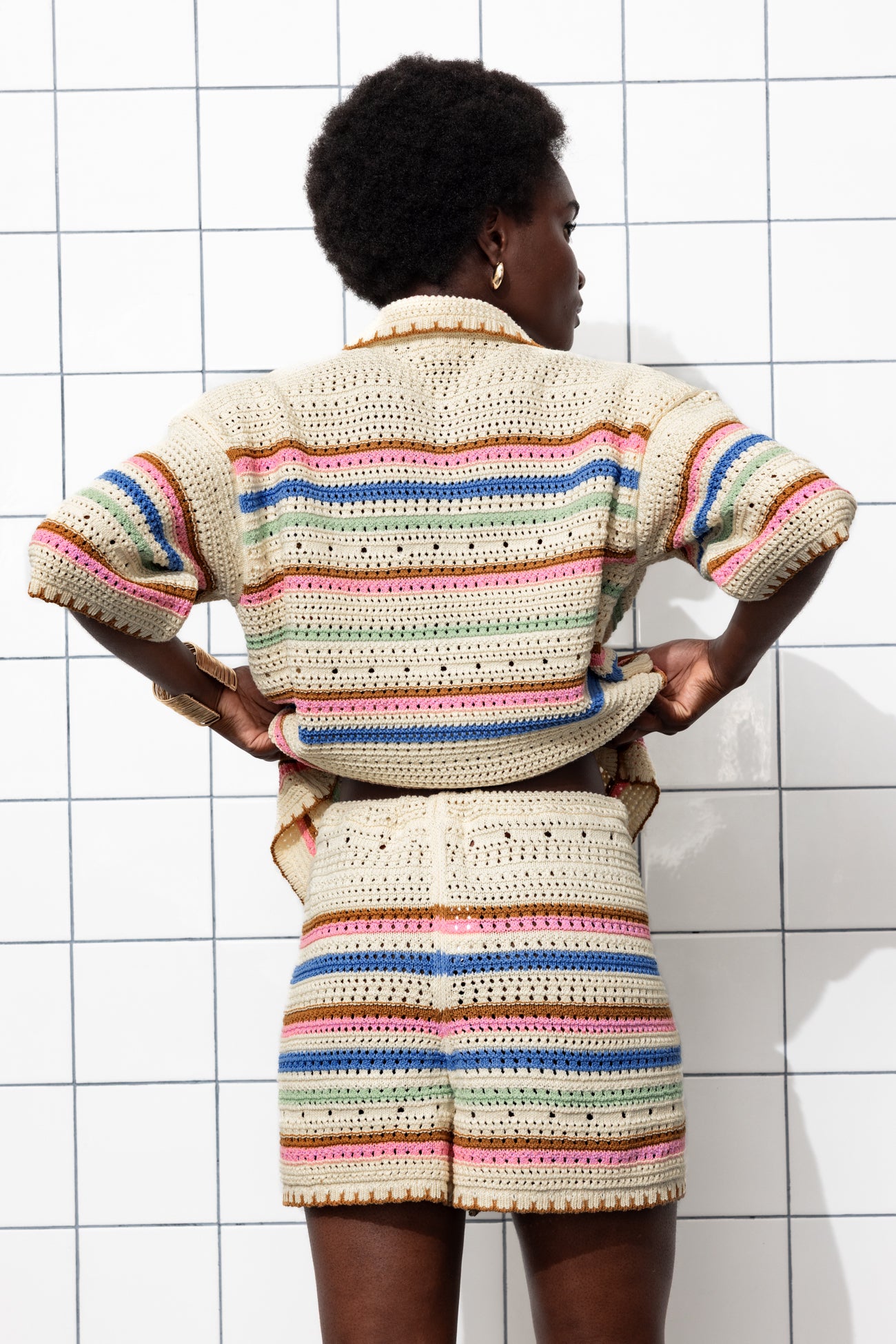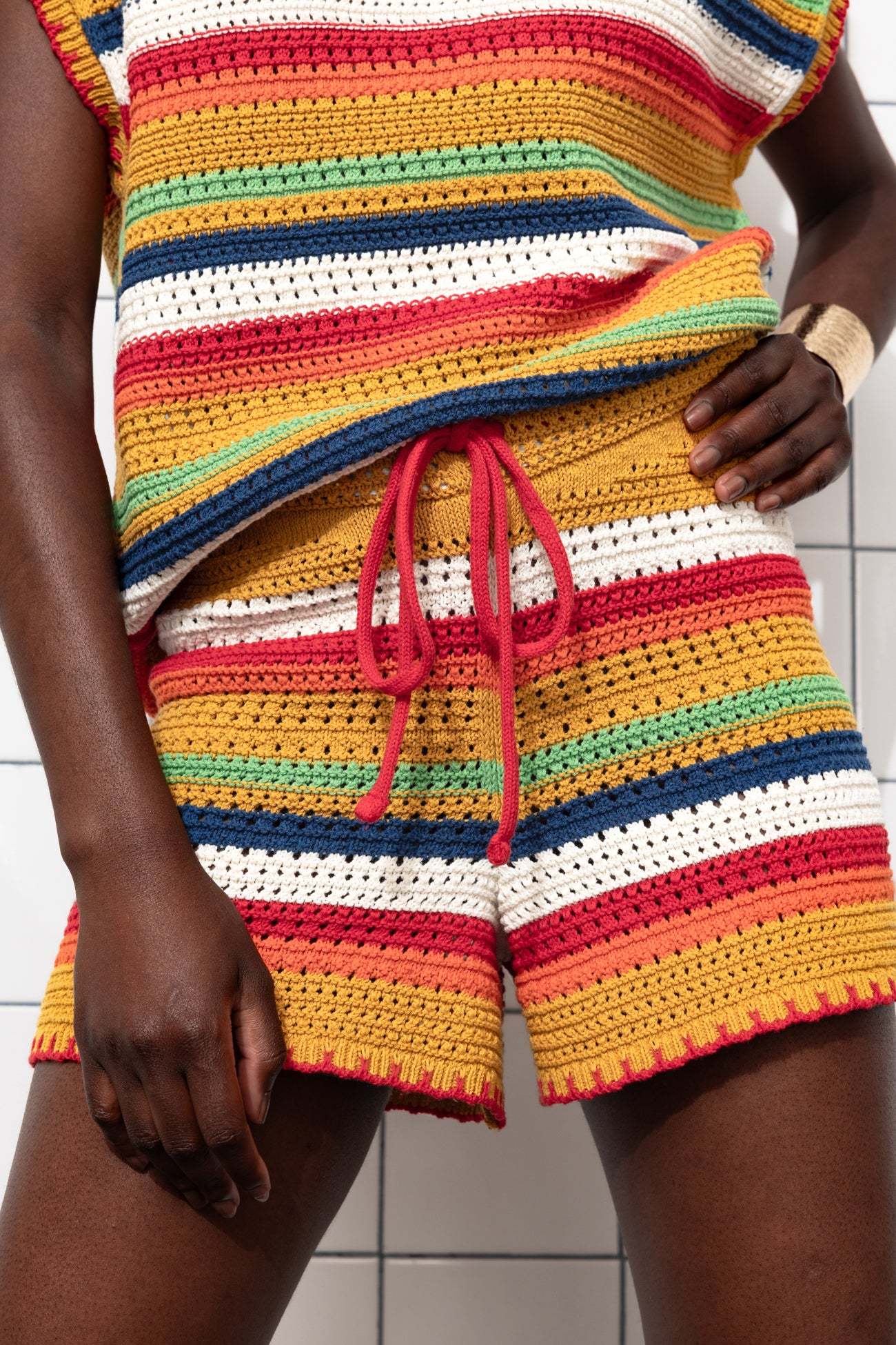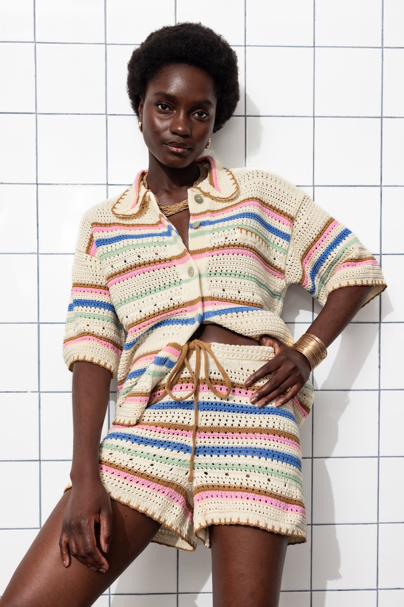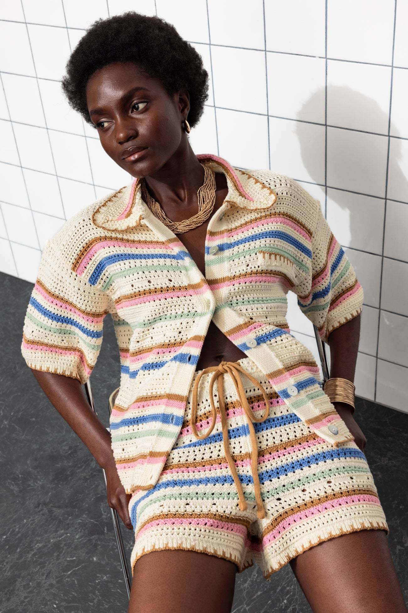 Réminiscence 60/70's, ajours discrets et jambes au soleil ! Le short en crochet a très envie de passer toute la belle saison à défiler stylé ! On le porte avec des nu-pieds, des sandales ou des sabots. On ose un total look crochet, parfois. Maille souple. Coupe ample. Lien coulissant à nouer, taille haute. Bords-côtes. Ce short femme contient du coton recyclé et du polyester recyclé. Taille grand.