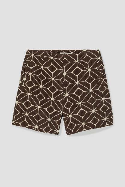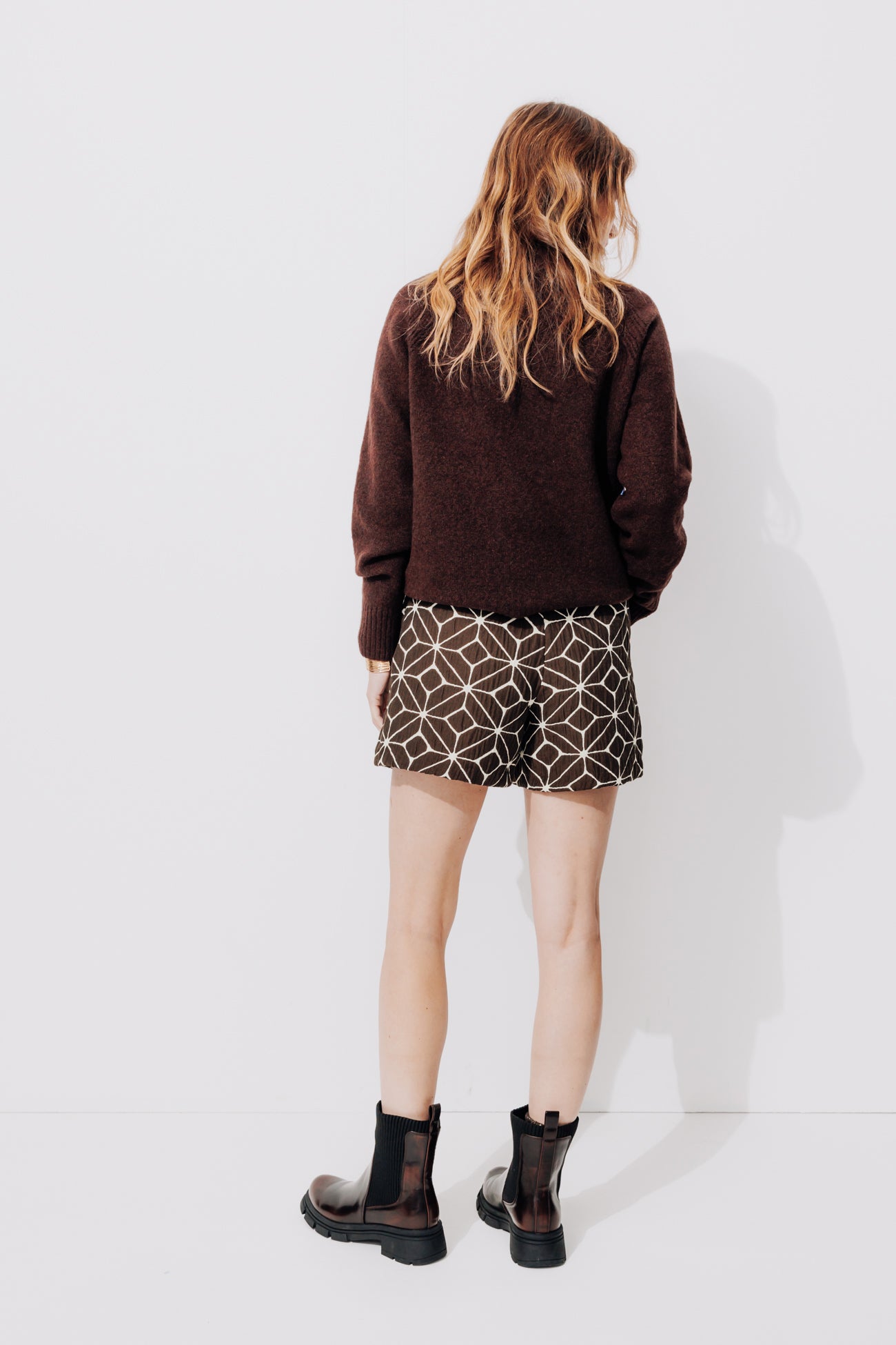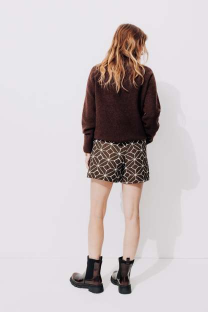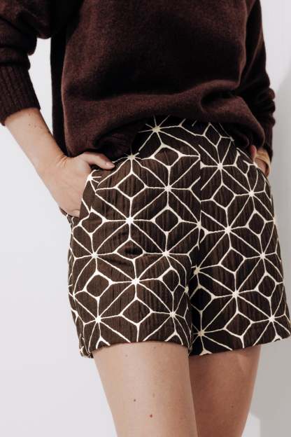 Motifs graphiques sur jacquard gaufré : l'originalité l'emporte sur ce short taille haute dans les tons chocolat. On le porte en duo avec une veste coordonnée, pour un total look Ikat. On calme le jeu avec un pull écru tout simple. Tissu épais avec effet légèrement froissé. Ouverture par zip caché sur le côté. 2 poches devant. Coutures invisibles.