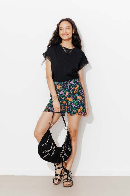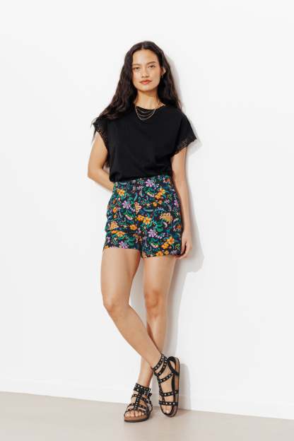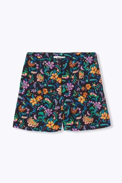 Cocktail en terrasse. Escapade le temps d'un week-end. Grandes vacances au soleil. On choisit de mettre de la gaieté dans nos looks avec ce short imprimé. Tissu crêpé, agréable à porter. Ouverture par bouton et zip caché devant. Pinces piquées devant et dos. 2 poches cachées dans les coutures sur les côtés. Finition piquée. Ce short femme contient de la viscose issue de pulpe de bois provenant de forêts gérées.