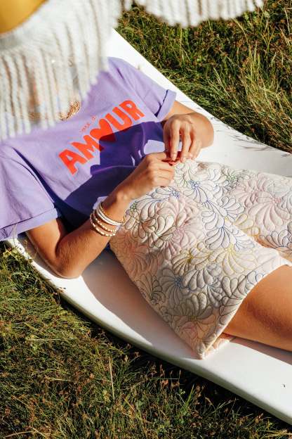 Grande tendance & envie cocoon ! Ce short en coton matelassé est une pièce rare dans la collection. On zoome sur les grandes fleurs brodées en couleur all over. Toile matelassée souple avec doublure très douce. Taille mi-haute. Ouverture par zip côté caché sous patte. Finition piquée.
