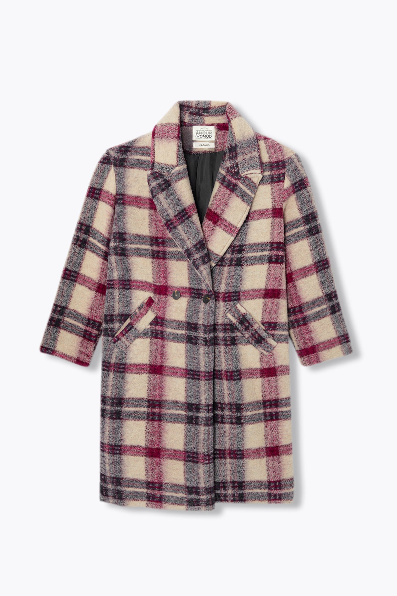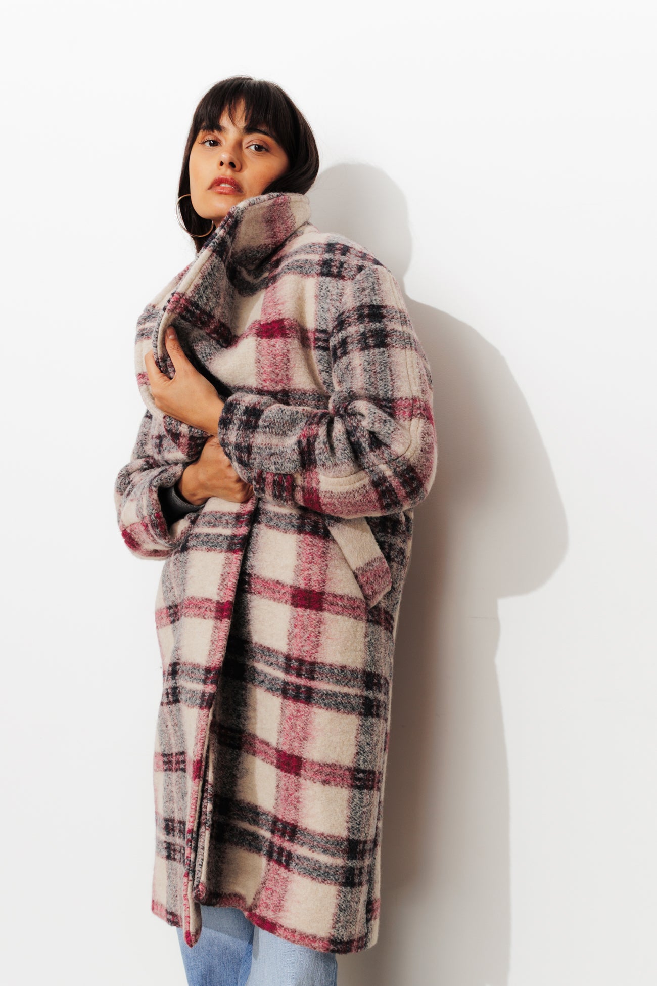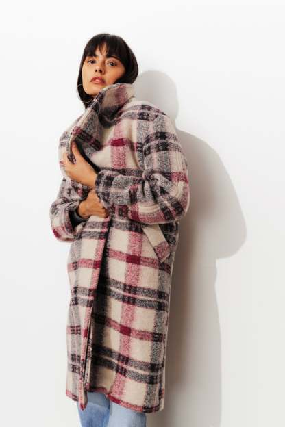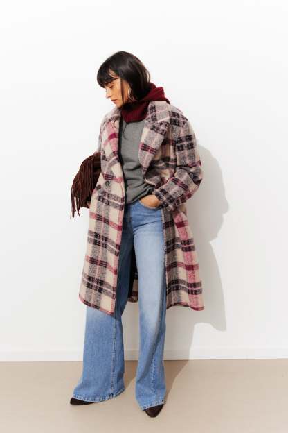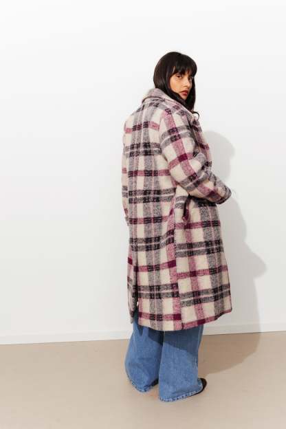 COLLECTION ICONIQUE (griffe collector). SIMONE, le manteau en laine mélangée sort en version carreaux. On flashe sur la coupe mi-longue urbaine. On se love dans la chaleur de sa laine souple (tissage italien). Col à larges revers. Fermeture croisée, double boutonnage. Emmanchures descendues. Poignets ceinturés. 2 poches. Fente d'aisance dos. Doublure. Ce manteau femme contient des fibres recyclées
