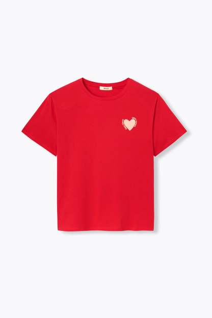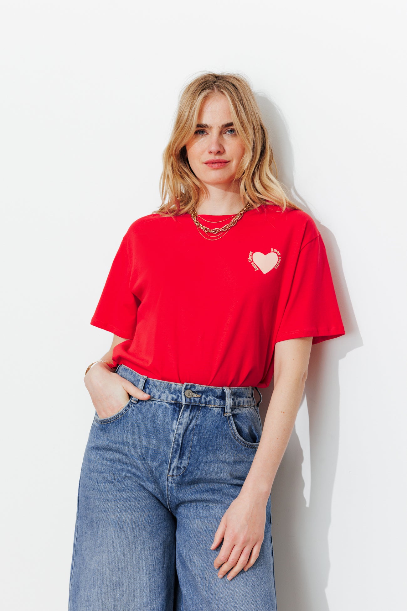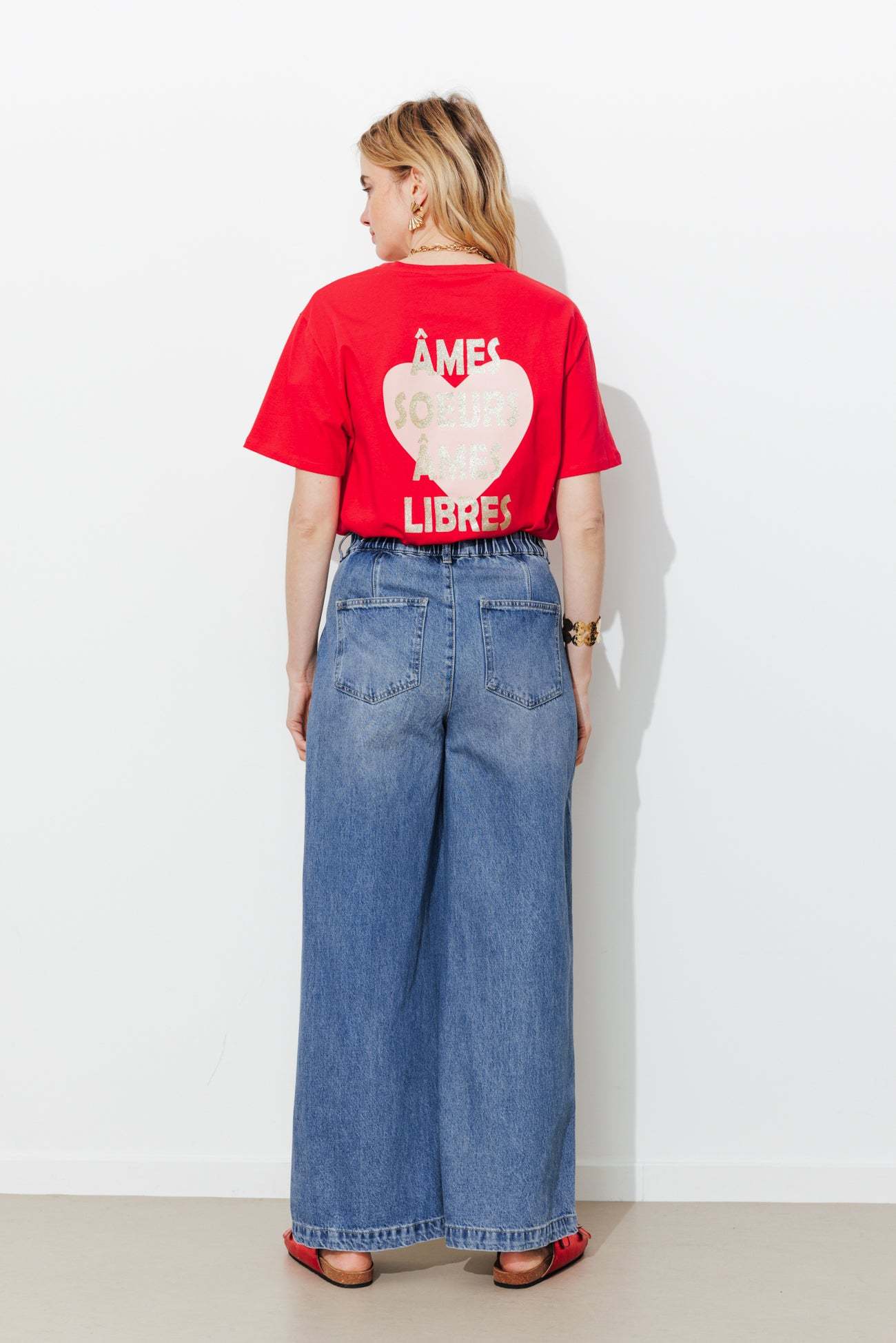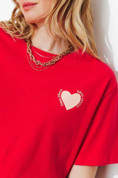 "Âmes sœurs, âmes libres": ce message pailleté est destiné à toucher au cœur ! Il est accompagné d'un cœur imprimé et inscrit sur la poitrine et en grand dans le dos. A (s')offrir au plus vite ! Jersey doux. Coupe oversize. Col rond. Manches courtes. Base droite. Ce t-shirt femme est en 100% coton issu de l'agriculture biologique, cultivé sans pesticides, ni engrais chimiques, ni OGM.