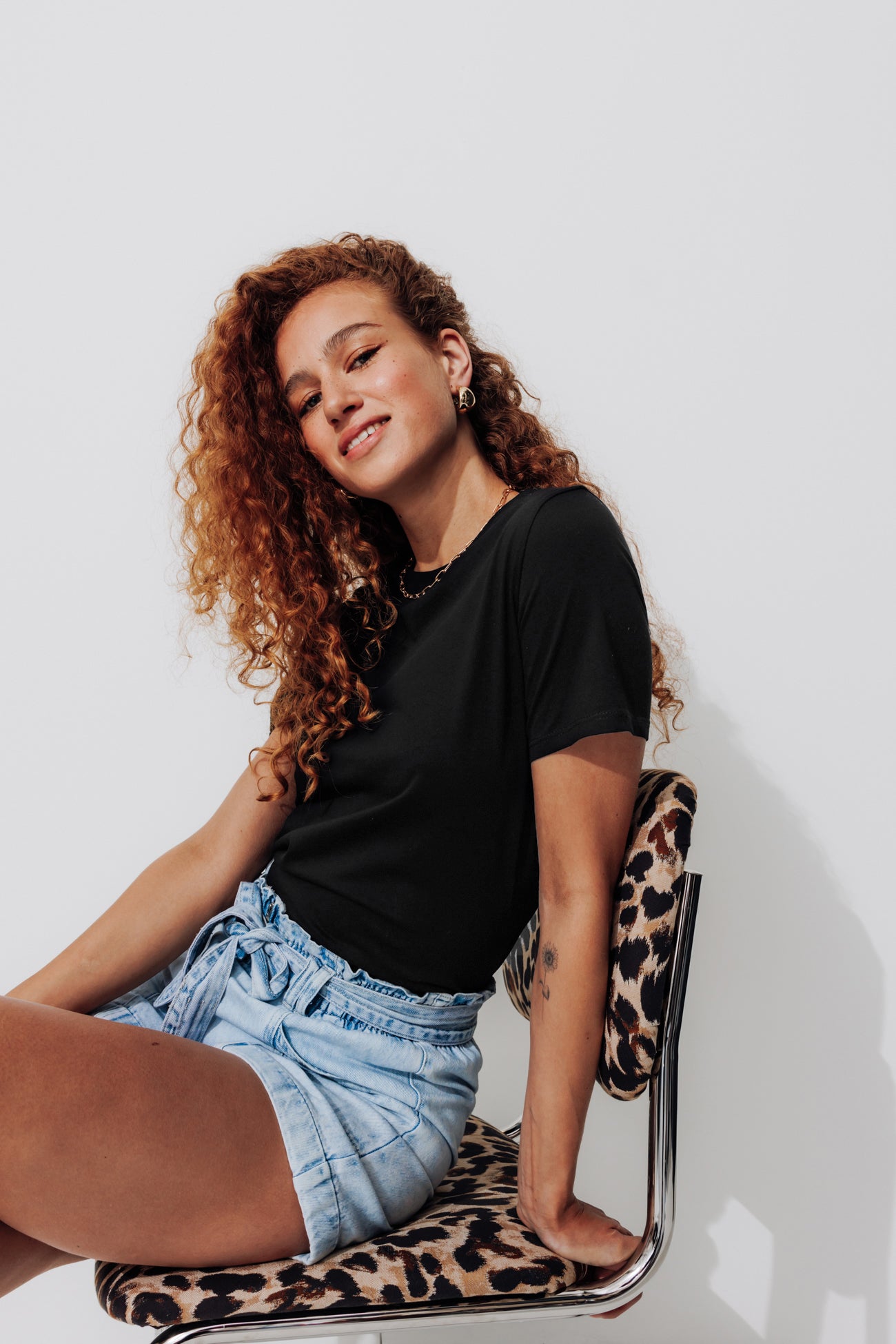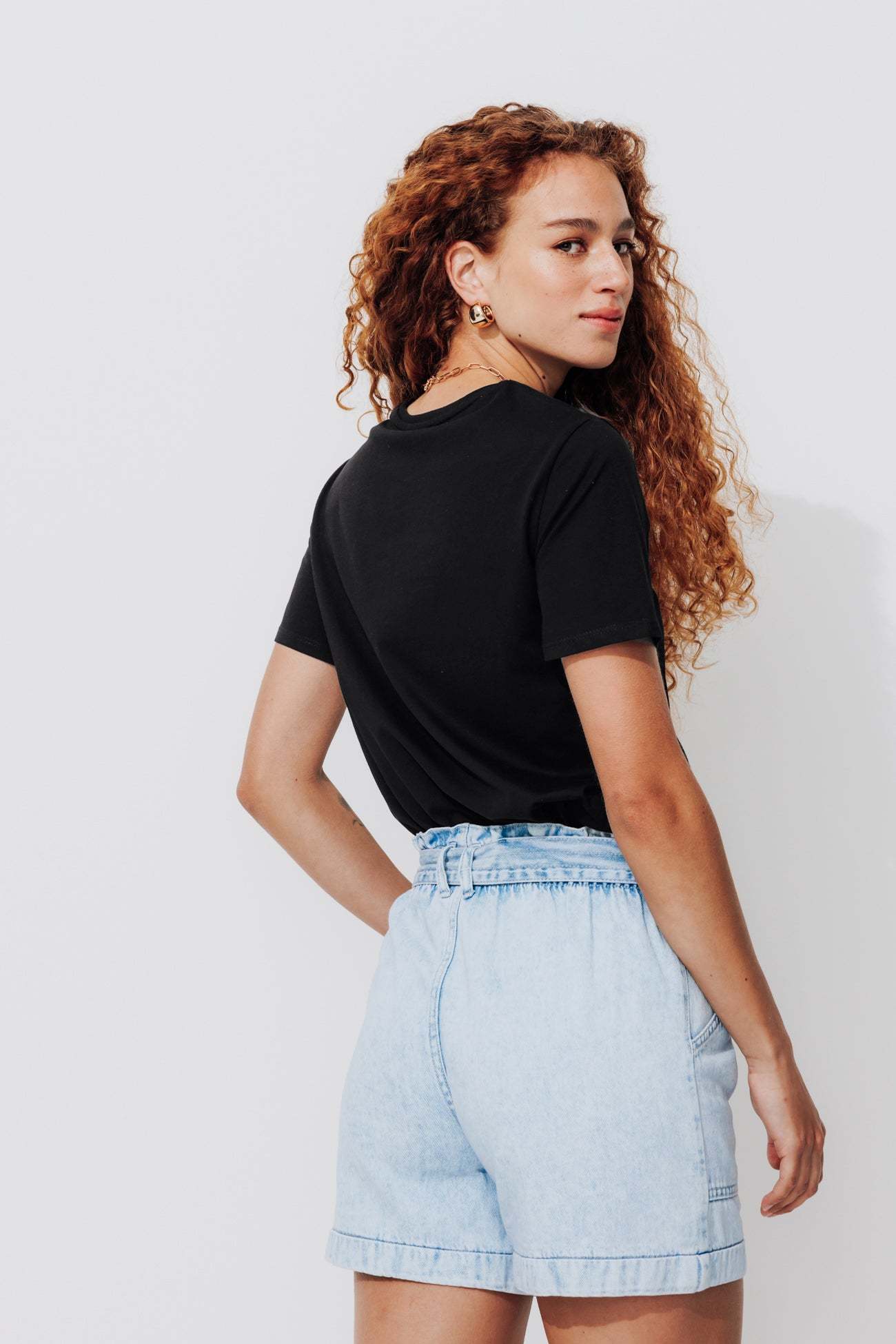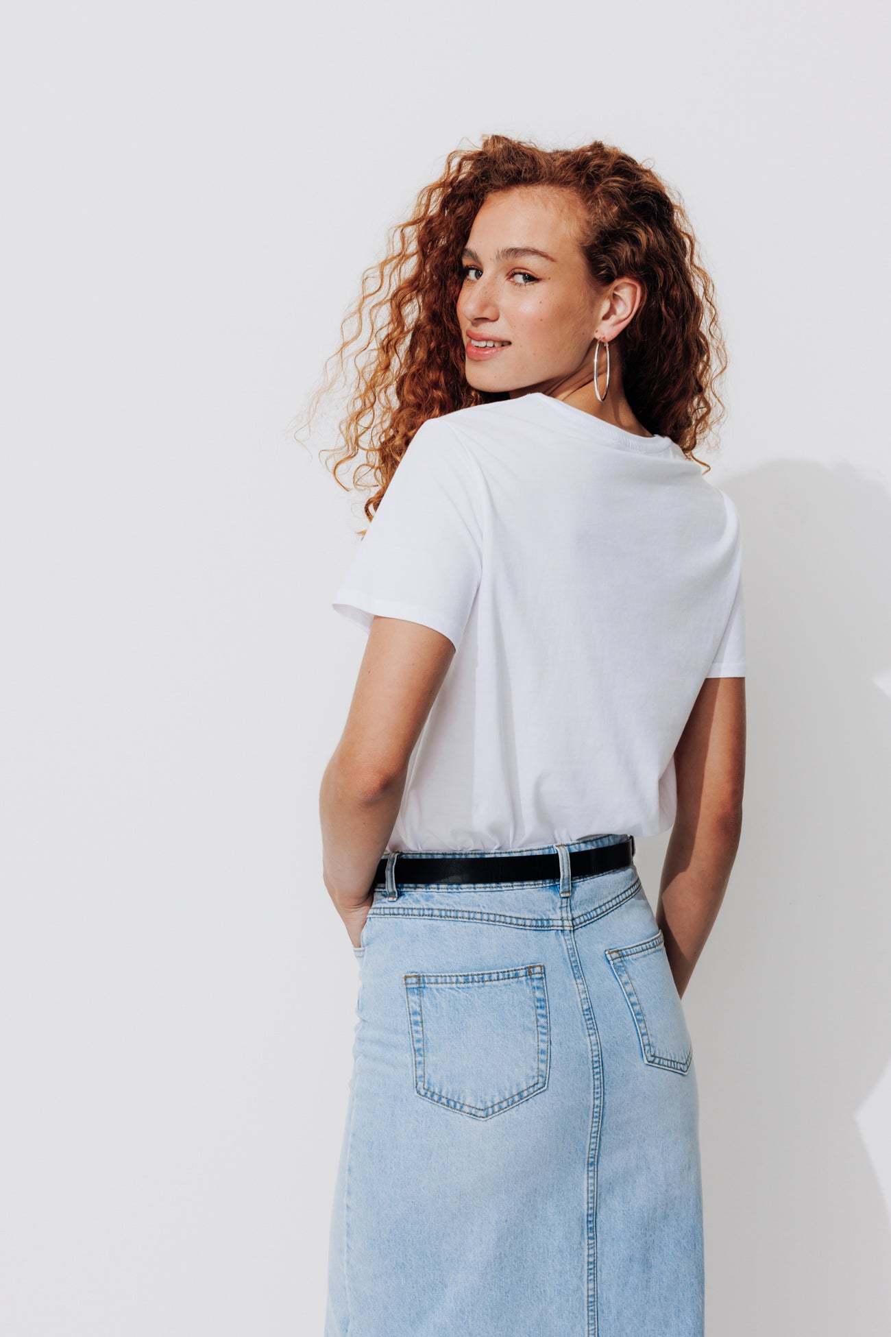 Bon basique toutes générations. A twister avec des bijoux, un sac, un foulard ou une veste... Jersey de coton issu de l'agriculture biologique. Coupe droite. Col rond. Manches courtes. Base droite.