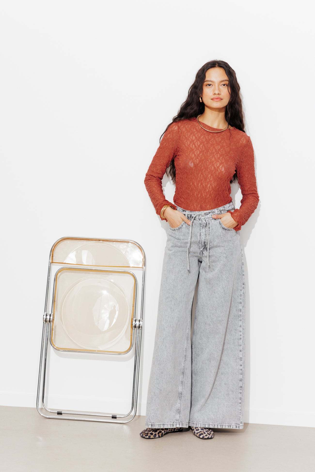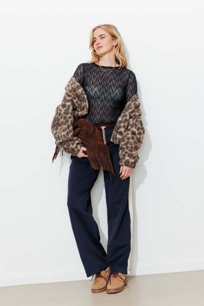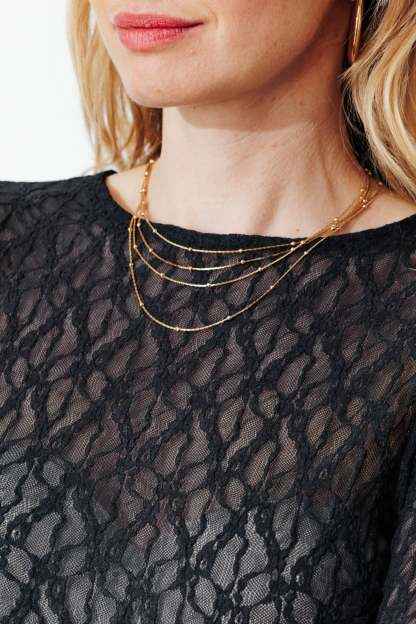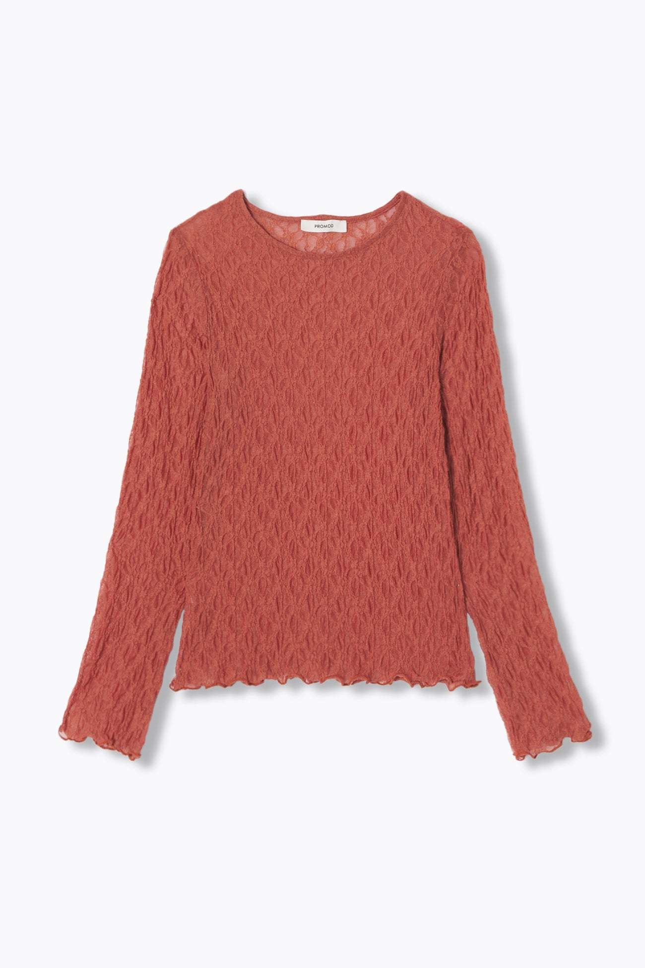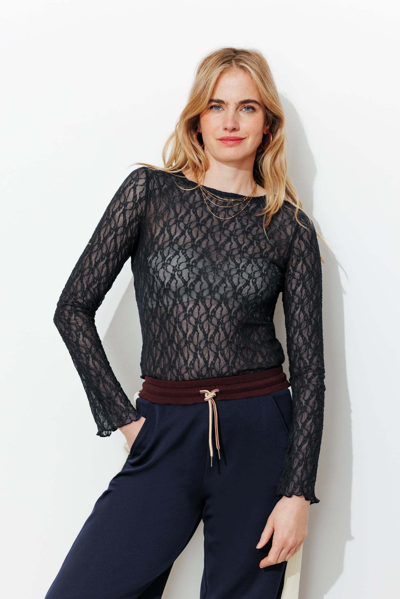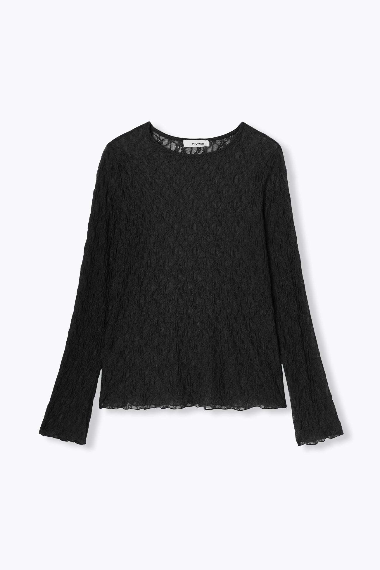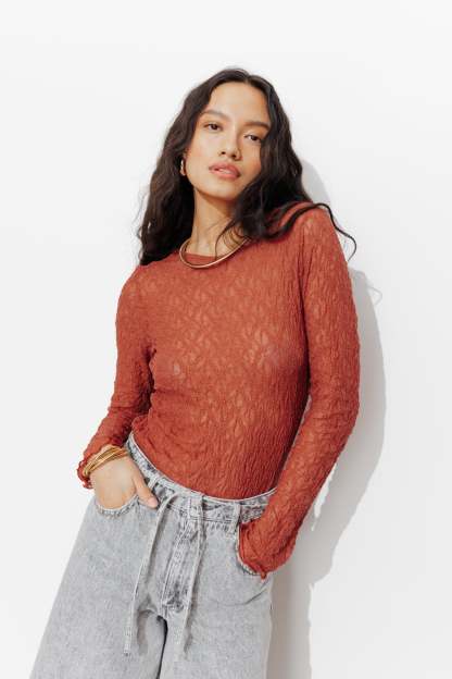 On se doit toutes d'avoir un t-shirt en dentelle dans son dressing. Il se glisse facilement sous une veste de tailleur. Délicatement transparent, il joue la provoc' chic le soir venu. Fine résille légèrement extensible brodée de petites fleurs. Coupe près du corps. Col rond. Manches longues. Base droite. Bords ondulés, finition point bourdon. Ce t-shirt femme contient des fibres recyclées.