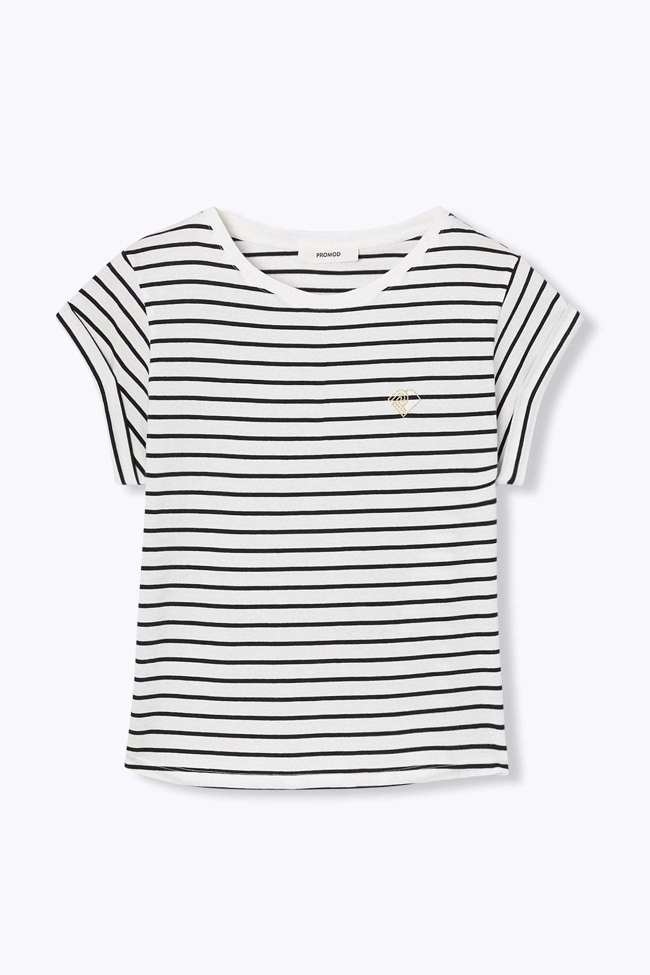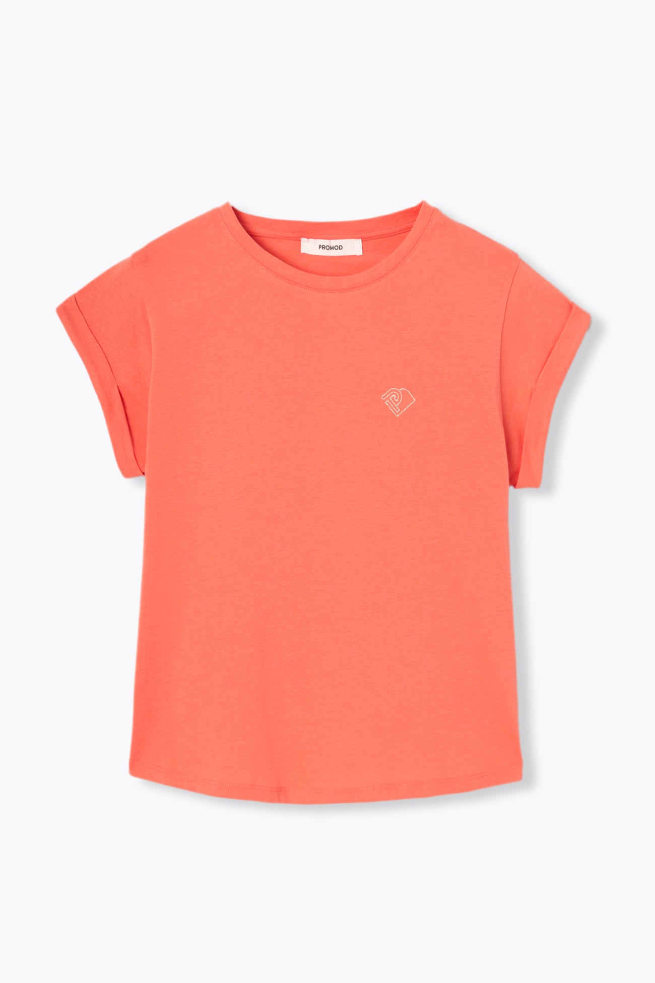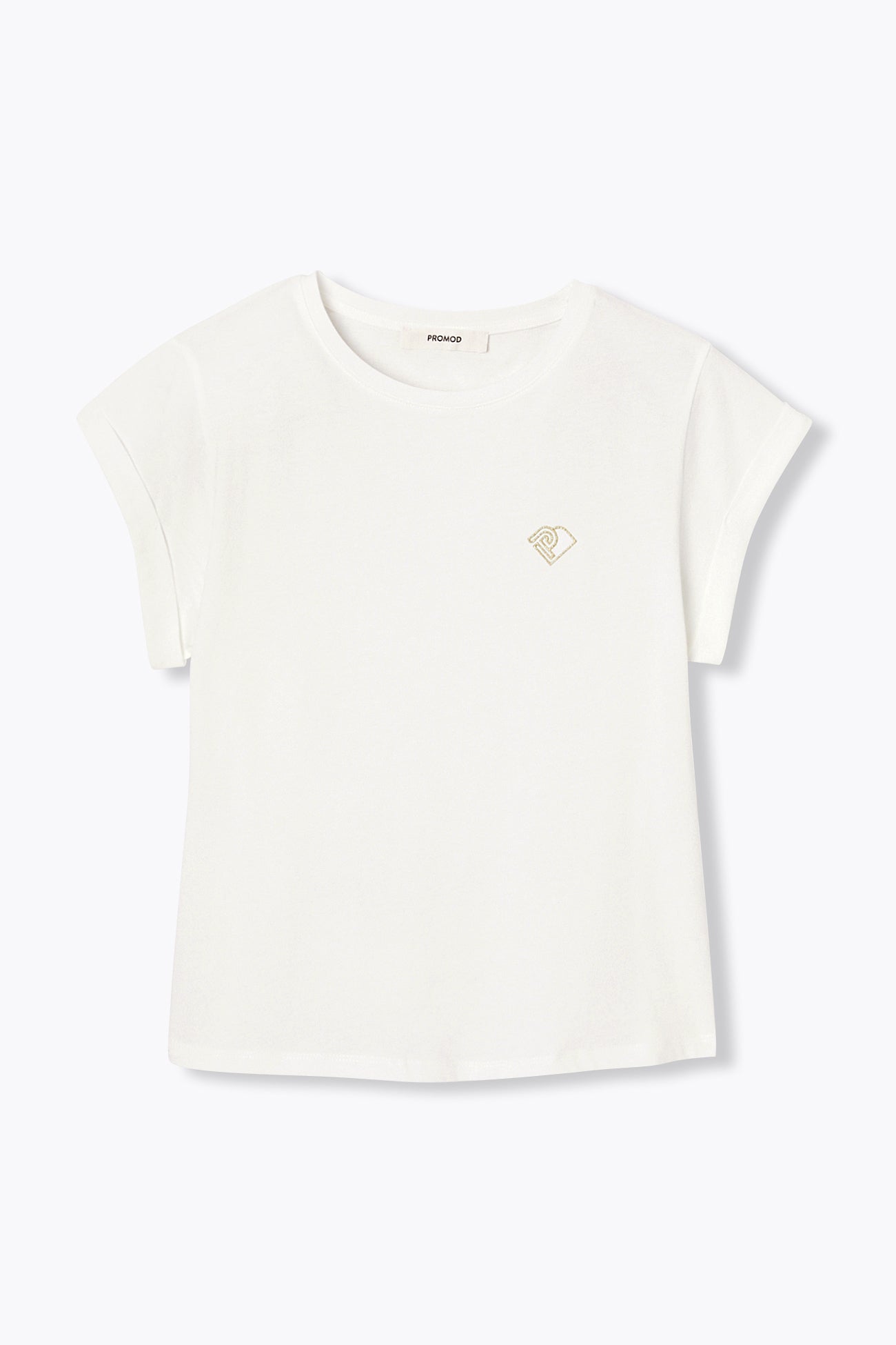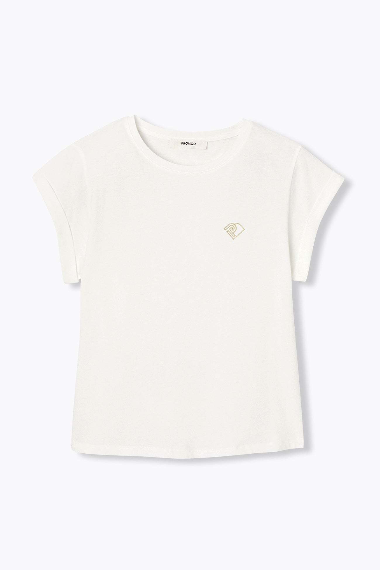Pour affirmer votre amour pour Promod, portez fièrement ce t-shirt à logo brodé ! A collectionner ! Jersey de coton doux. Coupe droite. Motif brodé poitrine, dos uni. Col rond. Manches très courtes à revers piqués. Base légèrement arrondie. Ce t-shirt femme contient du coton issu de l'agriculture biologique, cultivé sans pesticides, ni engrais chimiques, ni OGM afin de préserver la biodiversité