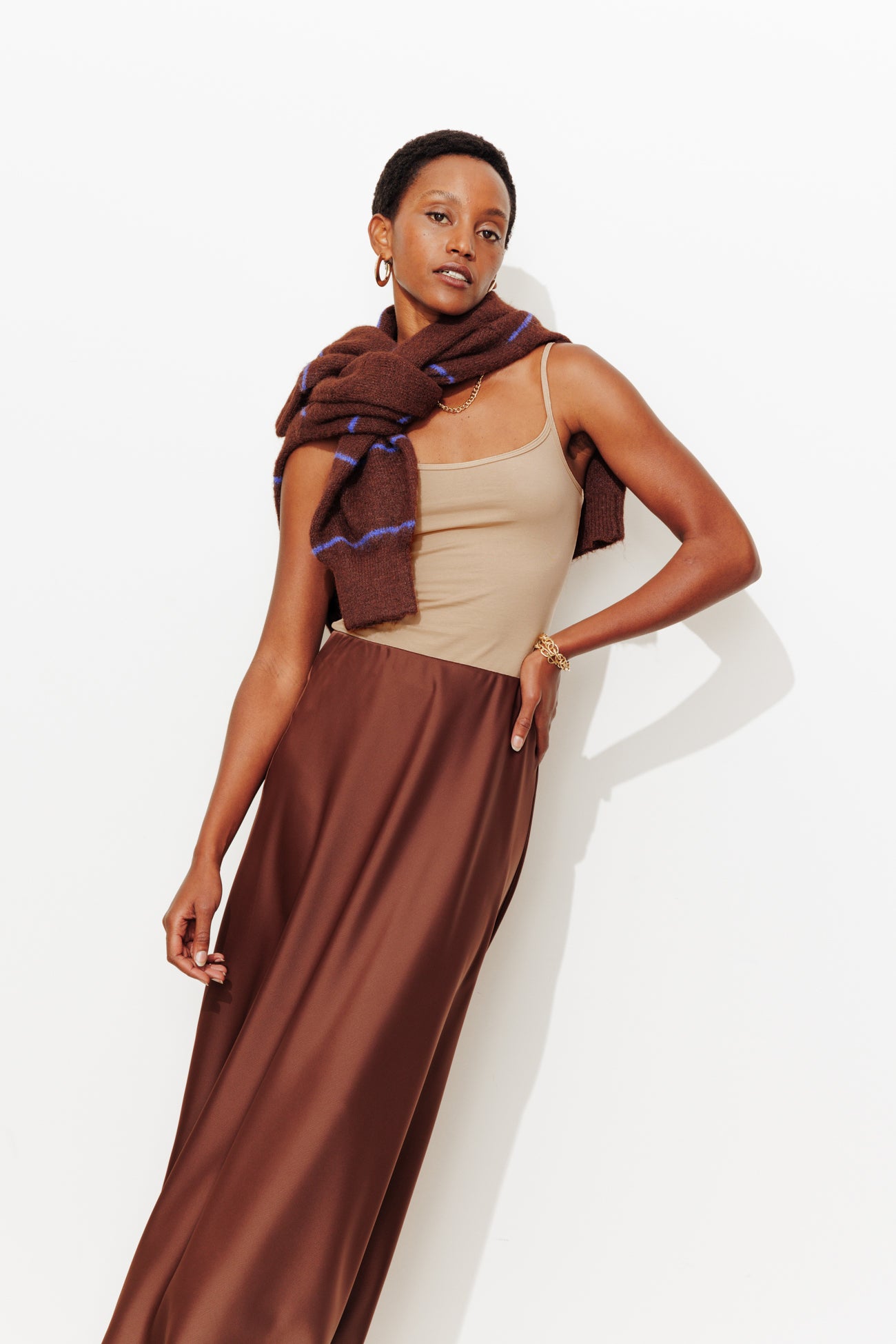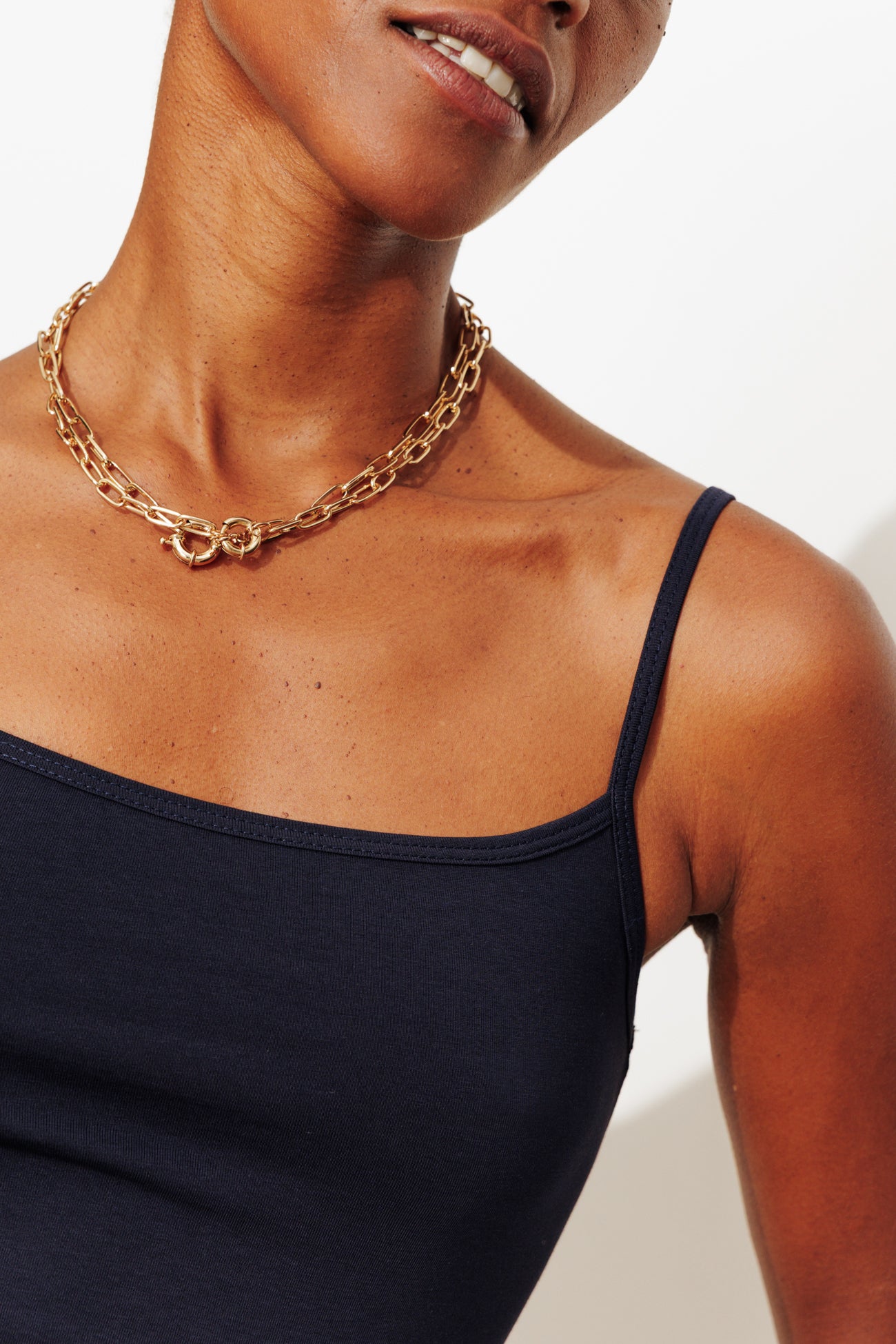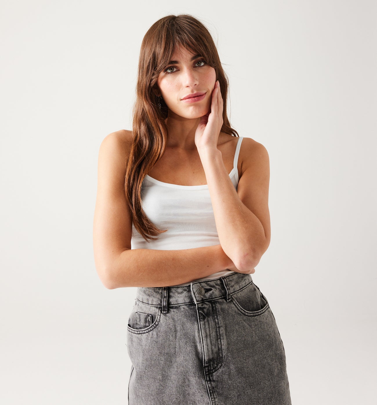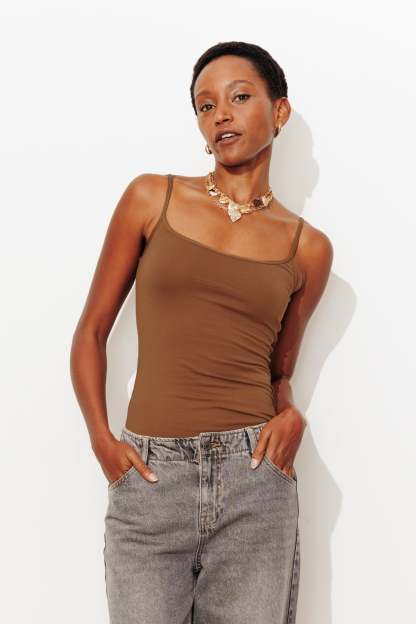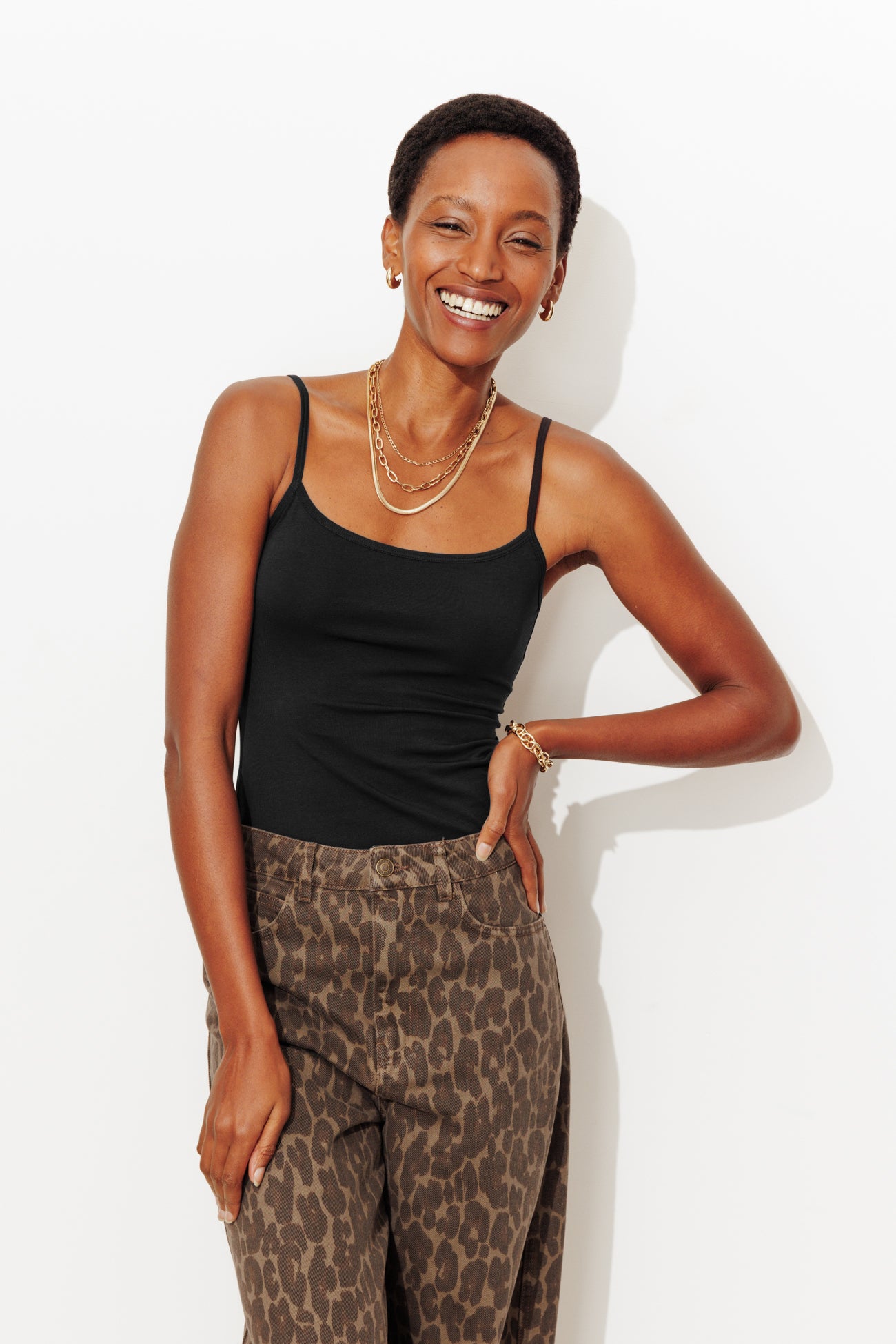 Must-have, toutes saisons confondues. A collectionner dans plusieurs coloris. Il complète un pull, un cardigan, un sweat. Il accompagne une veste ou sort en solo sous le soleil ! On l'aime aussi cocoon à la maison. Coupe ajustée. Fines bretelles. Encolure arrondie devant et dos. Base droite. Contient du coton issu de l'agriculture biologique, cultivé sans pesticides, ni engrais chimiques, ni OGM.