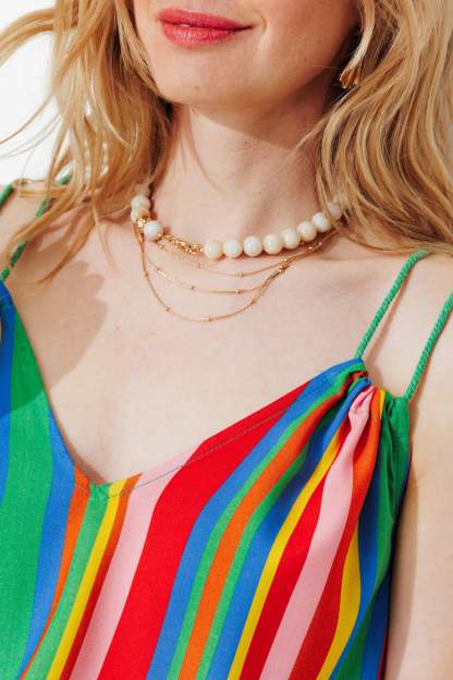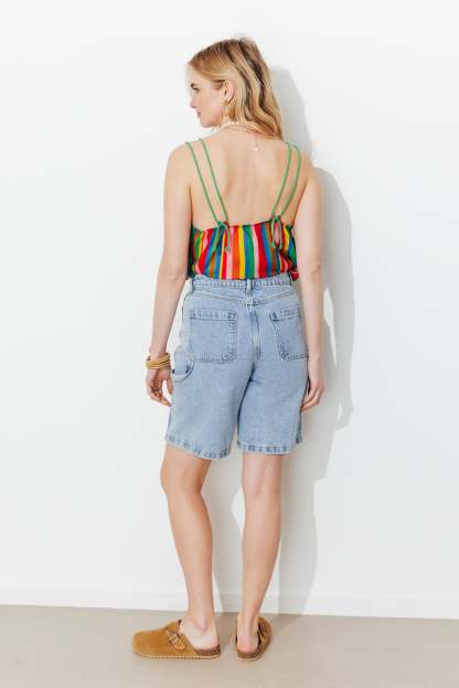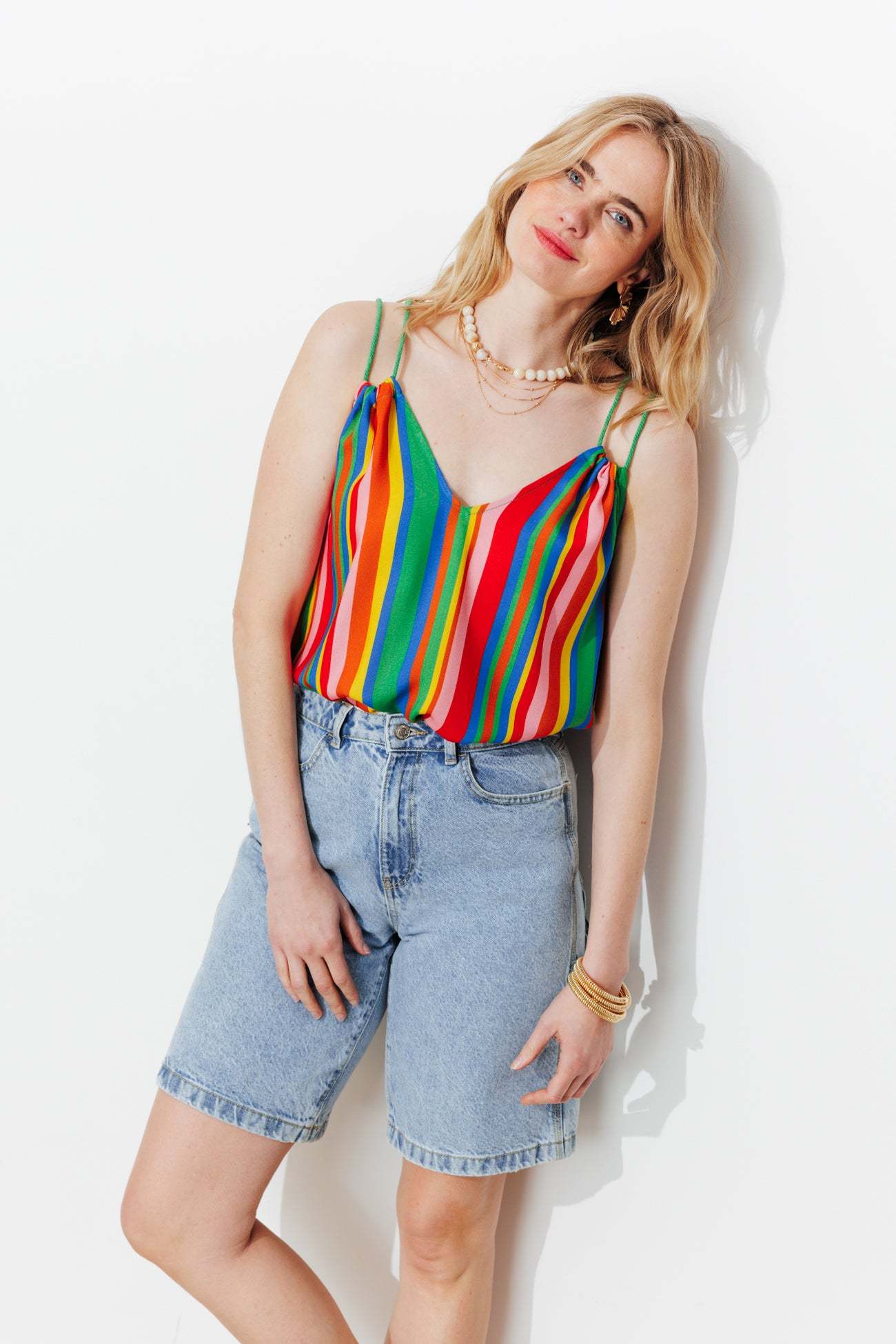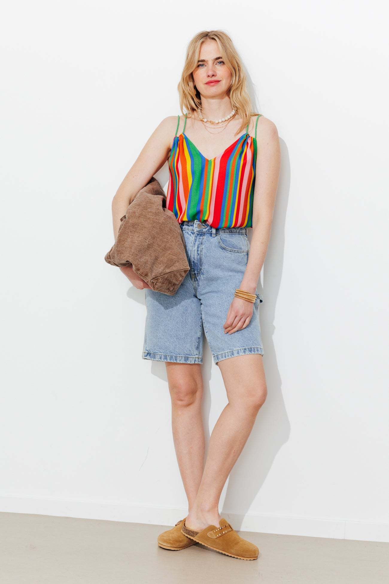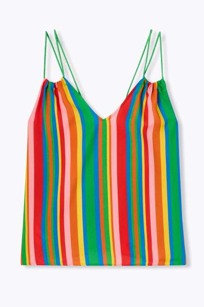 Des rayures flashy et une envie de profiter de la vie au soleil ! On aime ce top et ses cordelettes nouées (ajustables) en guise de bretelles ! On calme le jeu avec un pantalon uni, un short en jean ou une jupe toute simple. Tissu doux et fluide. Coupe légèrement évasée. Décolleté V devant. Dos droit élastiqué. Ce top femme est en 100% viscose issue de pulpe de bois provenant de forêts gérées.