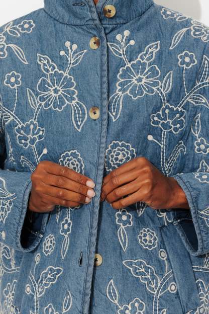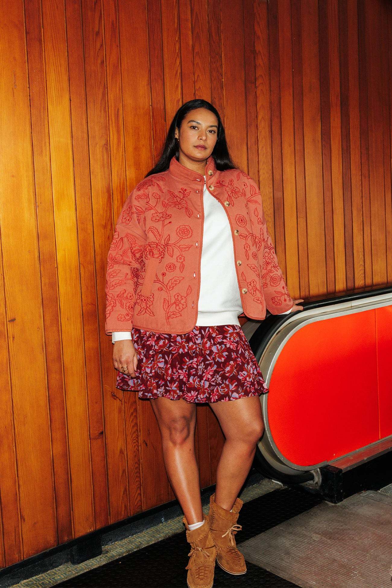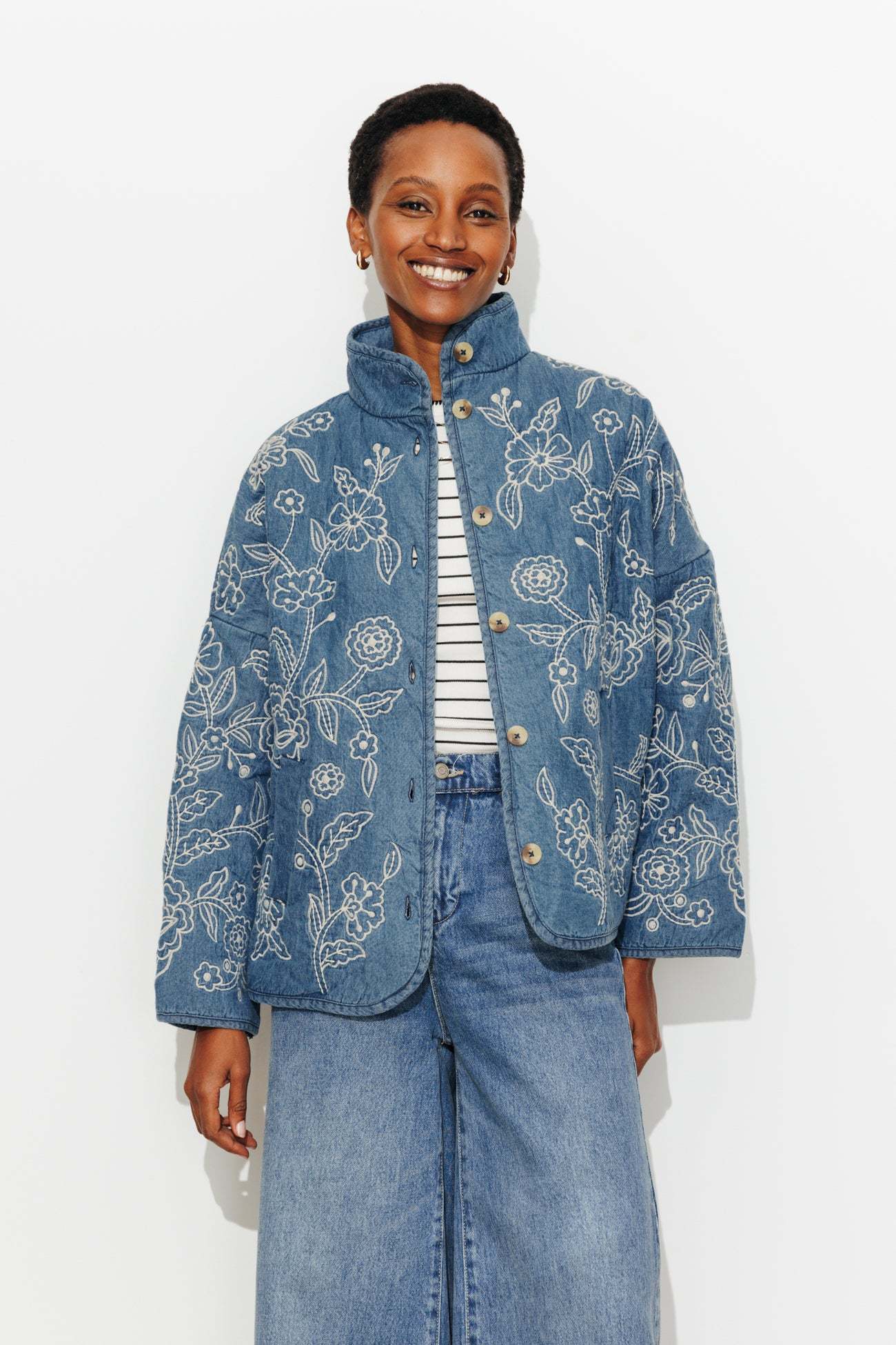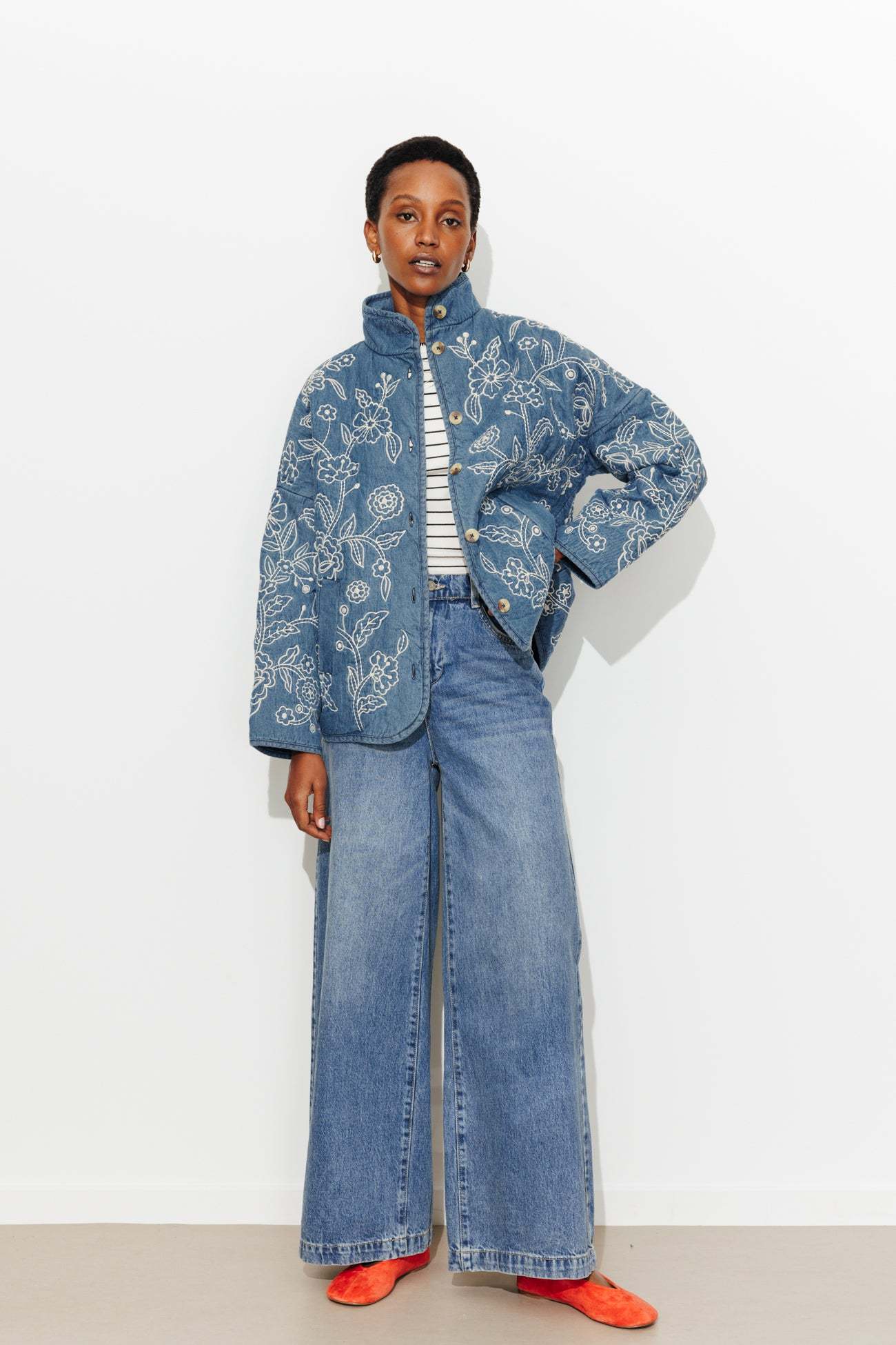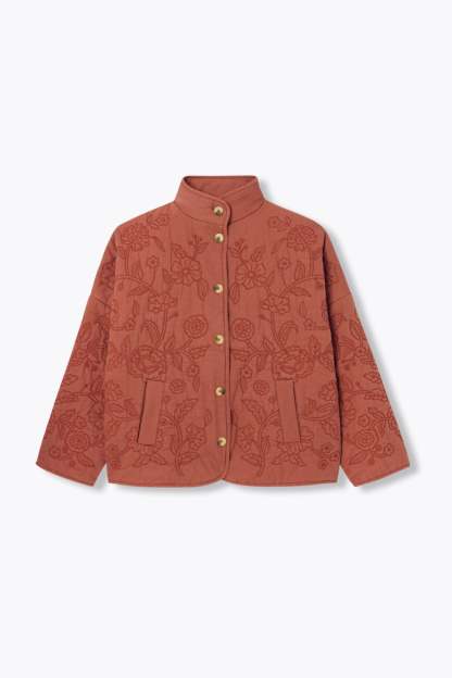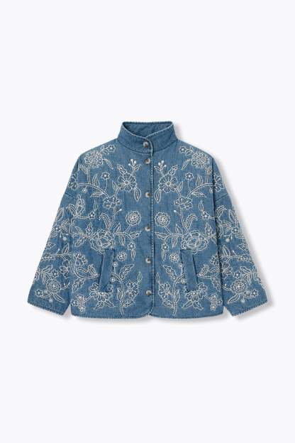 Nouvelle bohème et prochaine icône-mode ! La veste en toile de coton douce accueille des fleurs brodées all over pour poétiser nos journées ! En bon détail : un col montant, les emmanchures descendues et la fermeture boutonnée. Coupe ample. 2 poches. Manches longues. Base droite. Doublure. Cette veste femme contient des fibres recyclées et du coton issu de l'agriculture biologique, cultivé sans pesticides, ni engrais chimiques, ni OGM.