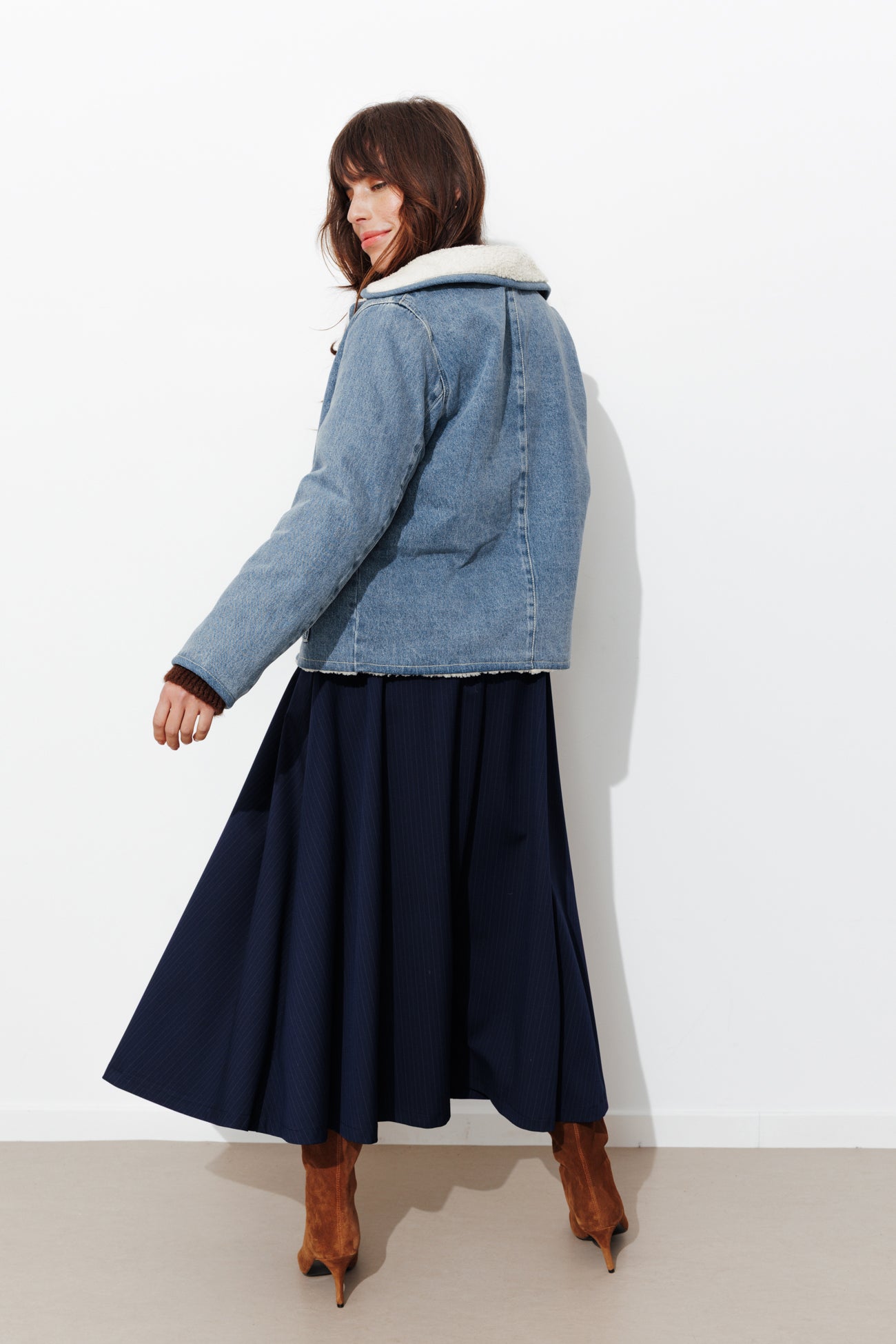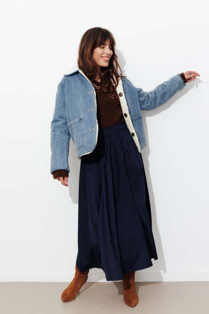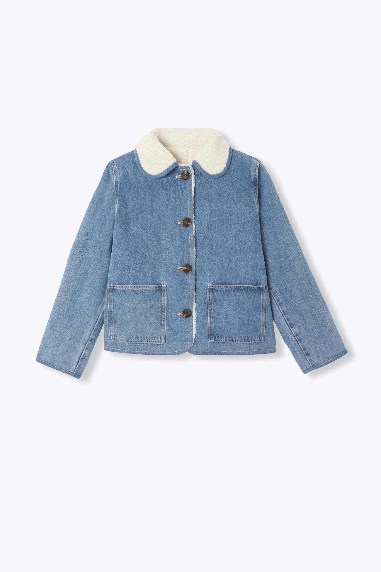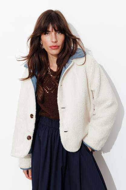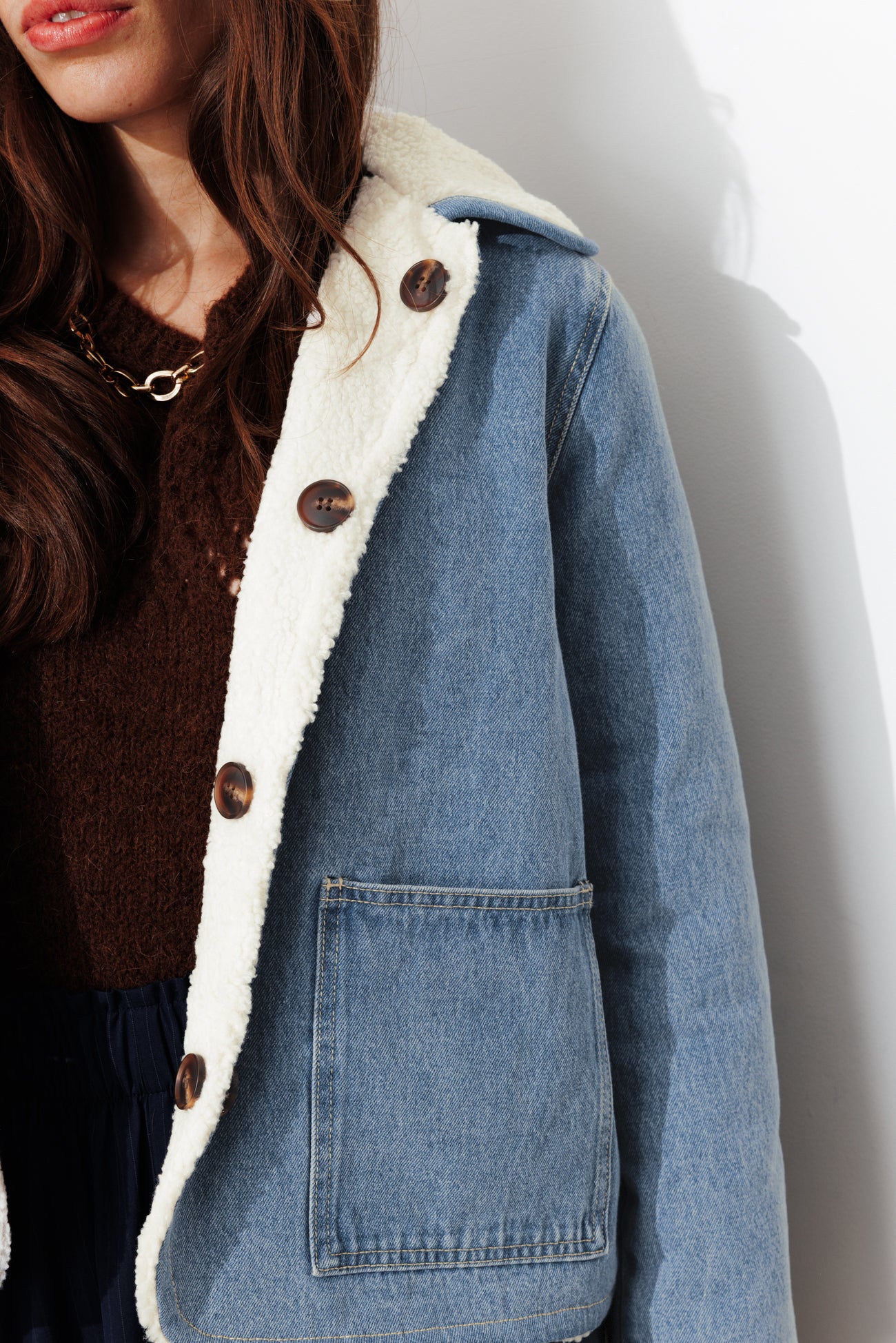 Une veste réversible. Deux options. La porter côté jean ou côté moumoute sherpa. L'aimer dans les deux cas ! C'est tellement doux, cocoon et réconfortant qu'on devient vite totalement accro à cette nouvelle pépite-mode de la saison. Coupe droite et courte. Col à revers arrondis. Ouverture boutonnée. 2 poches plaquées sur le côté jean. Manches longues, revers ajustables. Base droite.